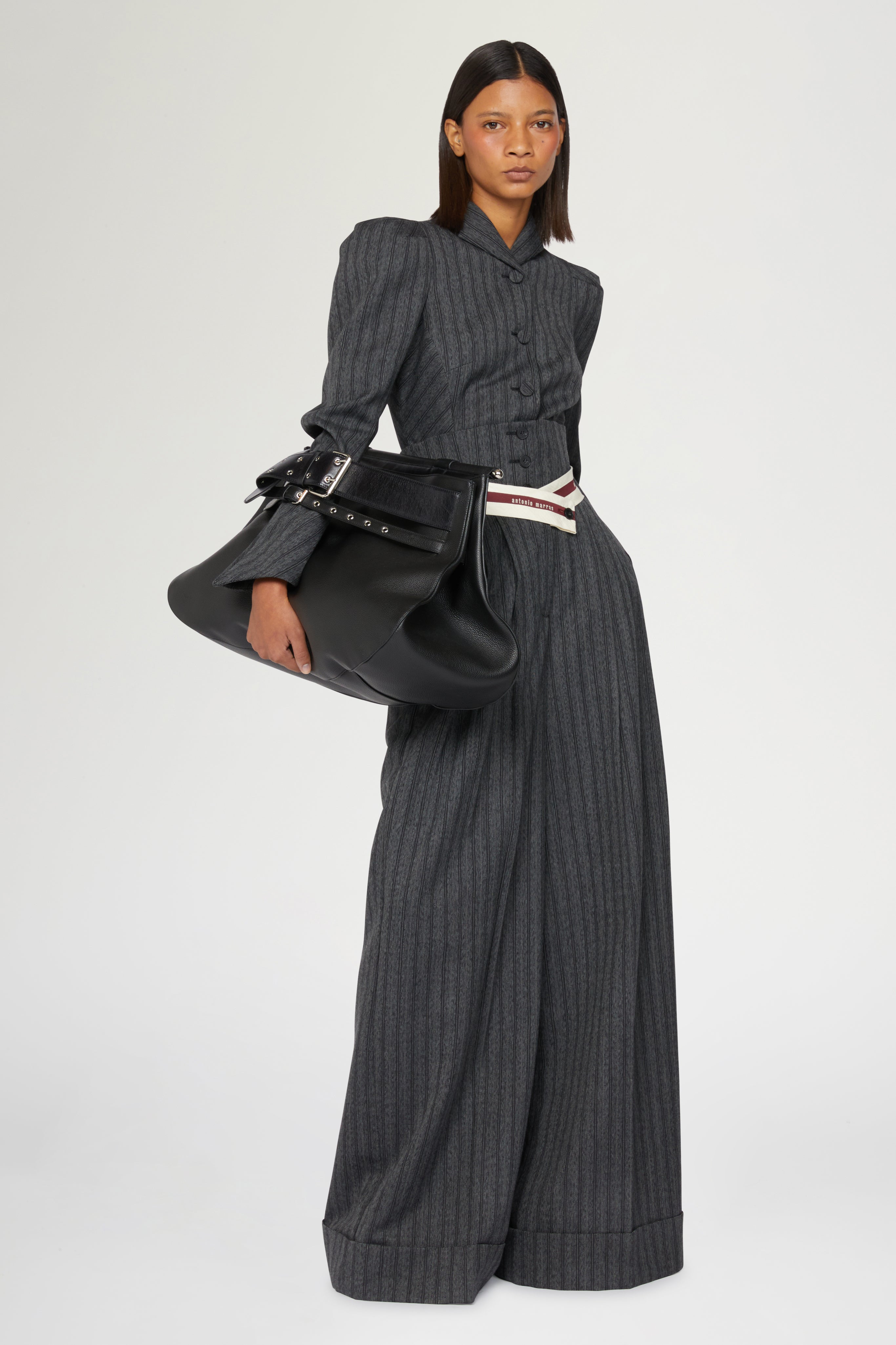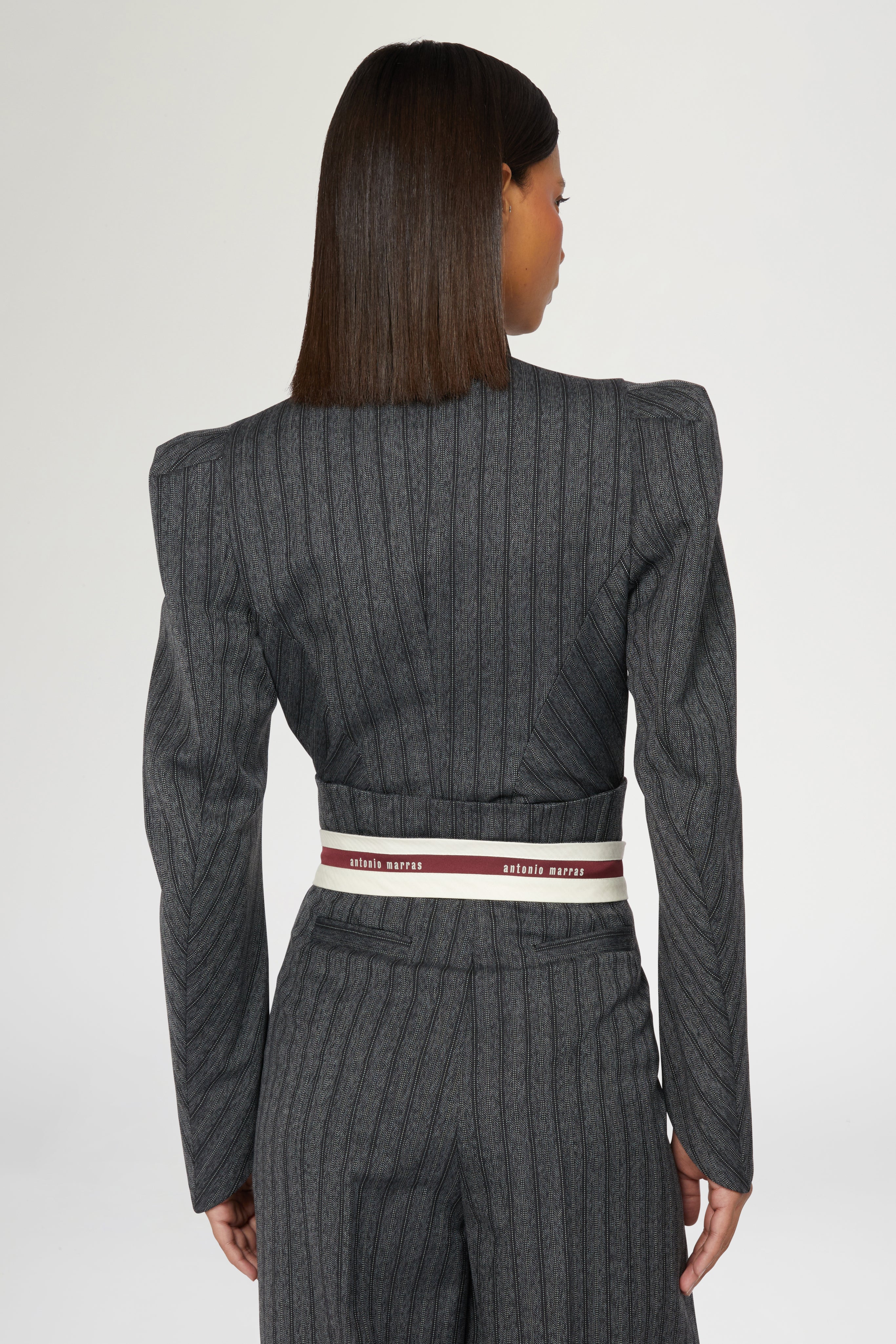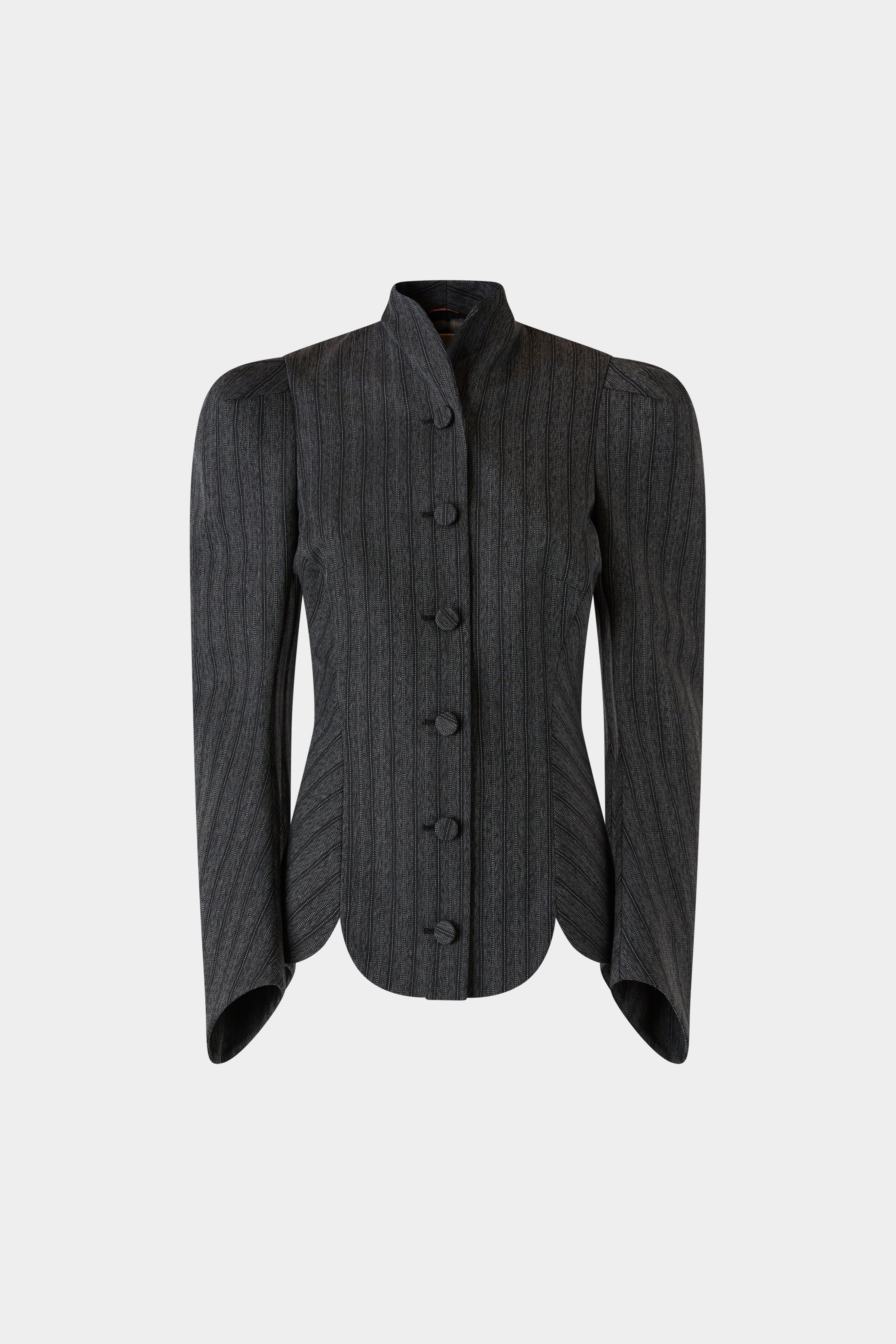 • Tailored pinstripe blazer featuring sculpted shoulders, a high collar, and curved hemline for a refined architectural silhouette. A statement piece that redefines classic tailoring with contemporary strength.
