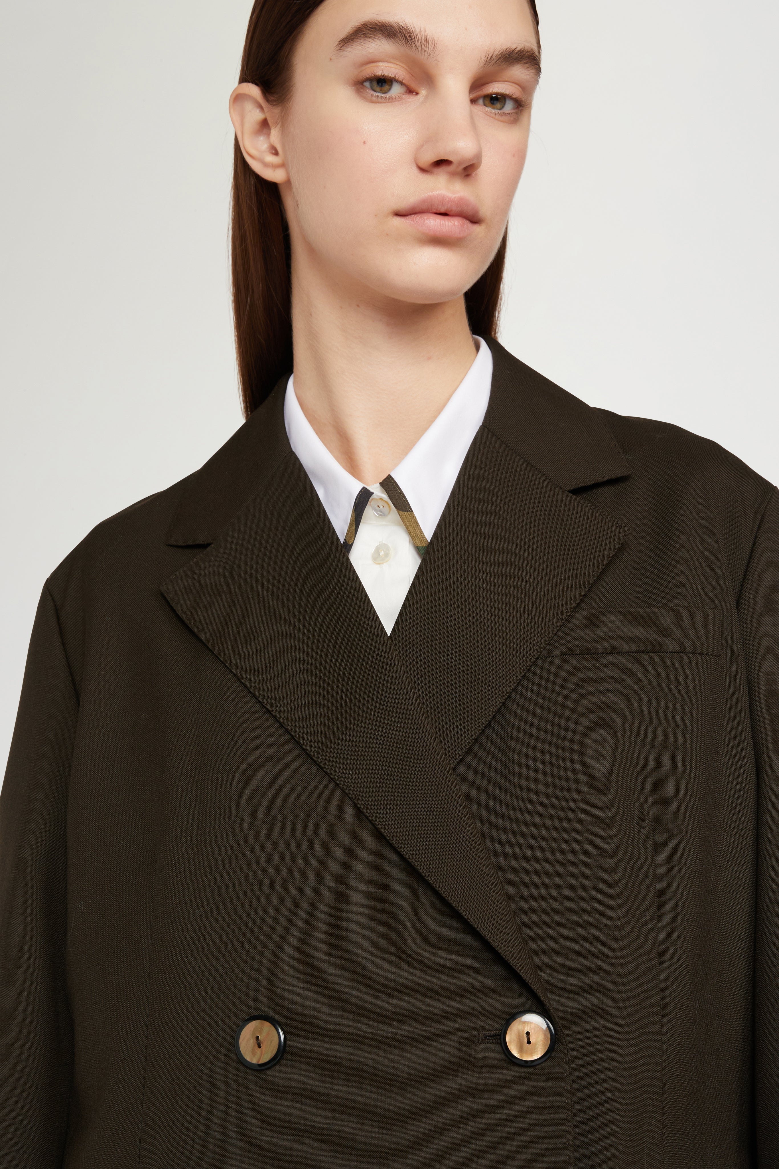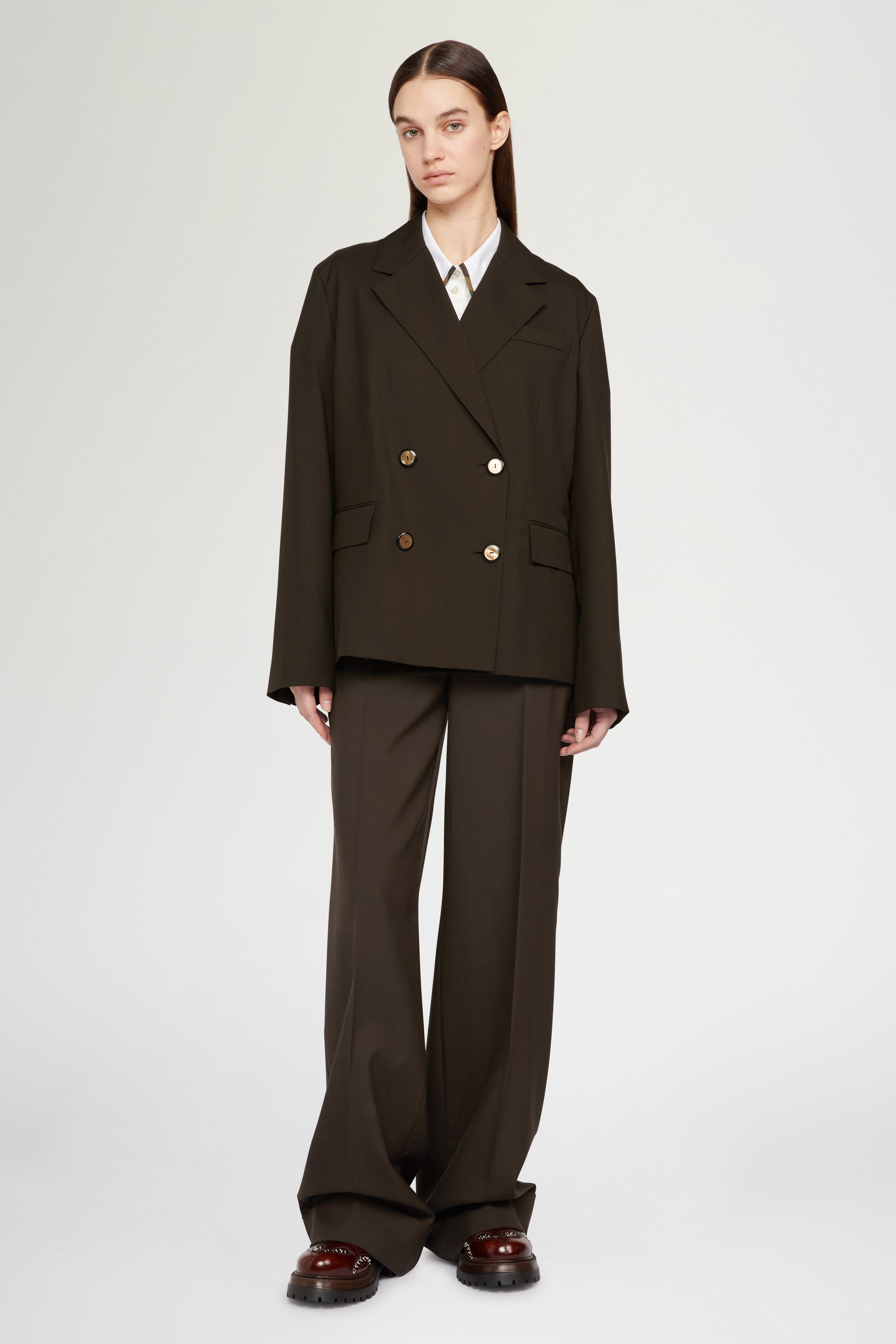 Tailored women's blazer in a dark brown tone, featuring a relaxed, oversized fit with a double-breasted closure and wide lapels. Crafted from 100% virgin wool.