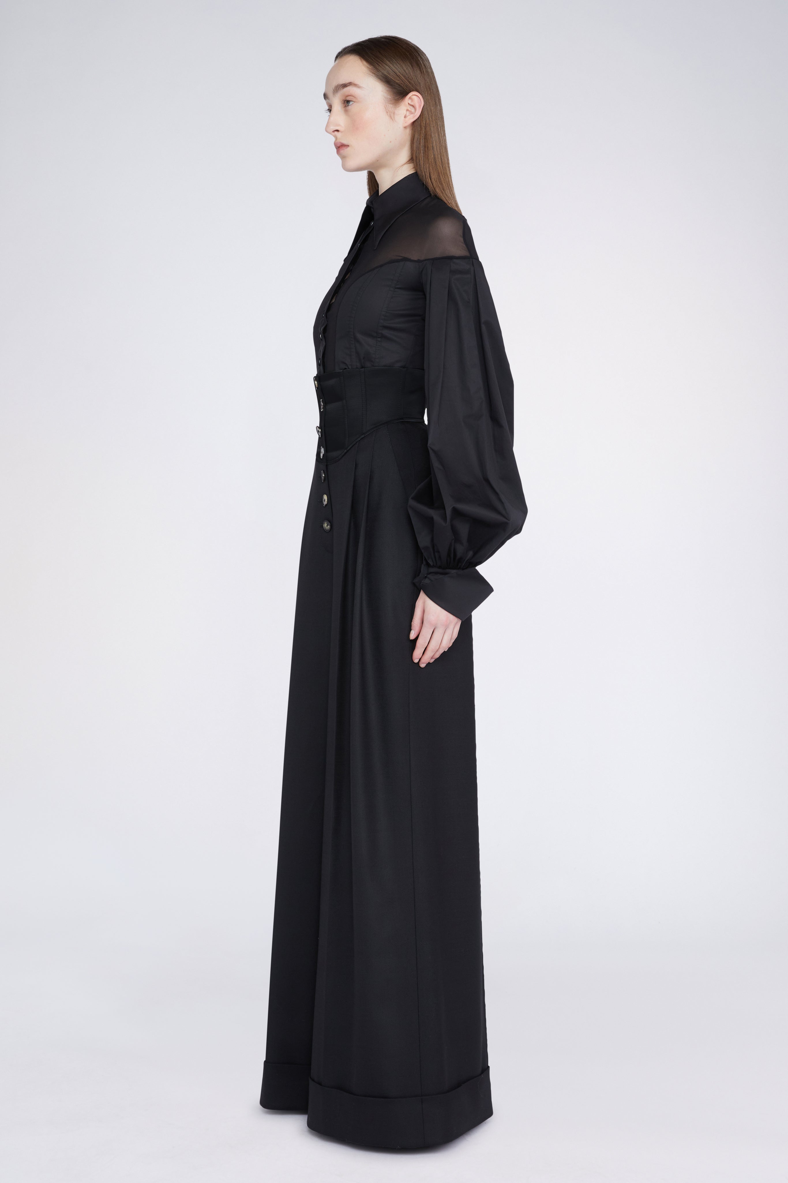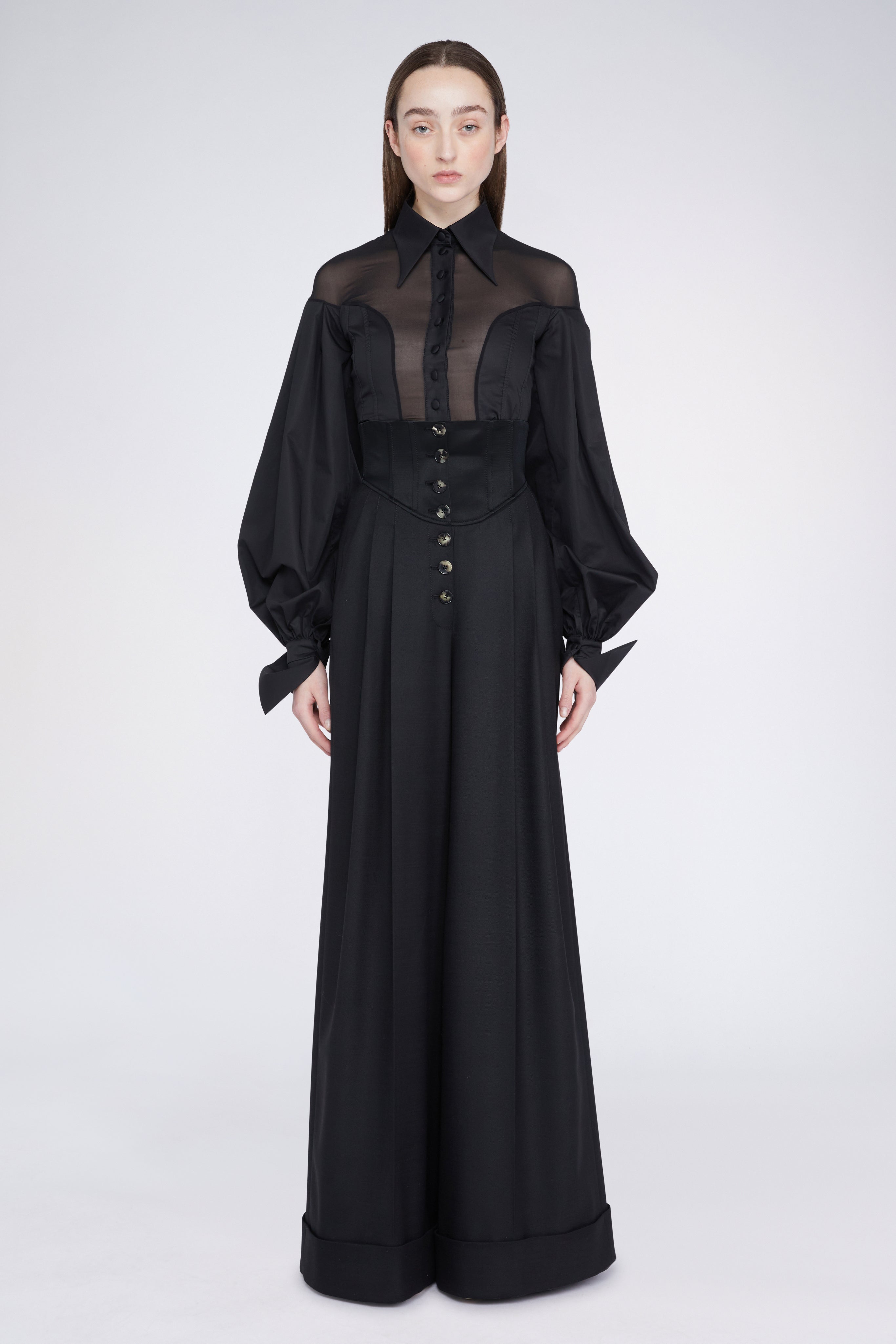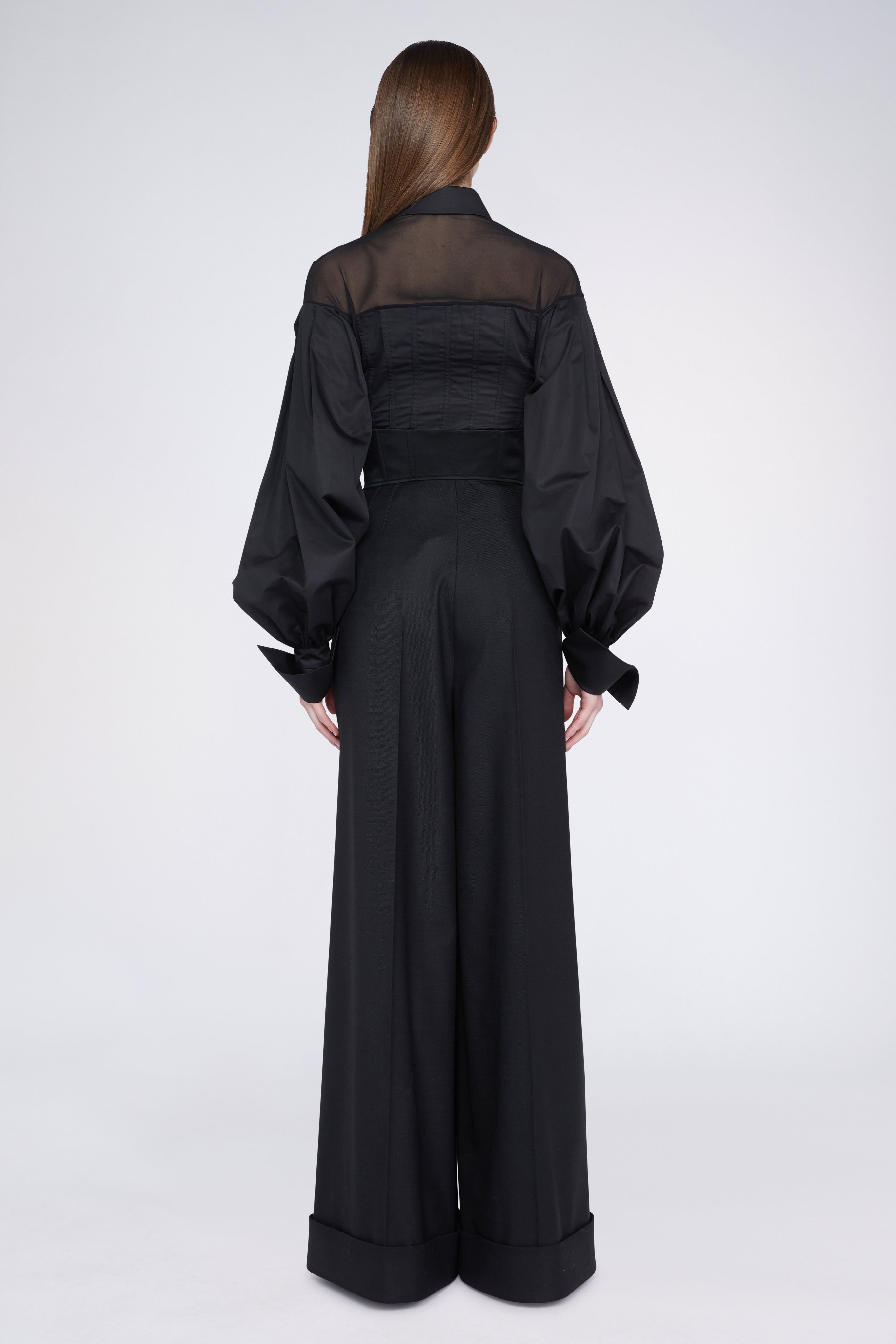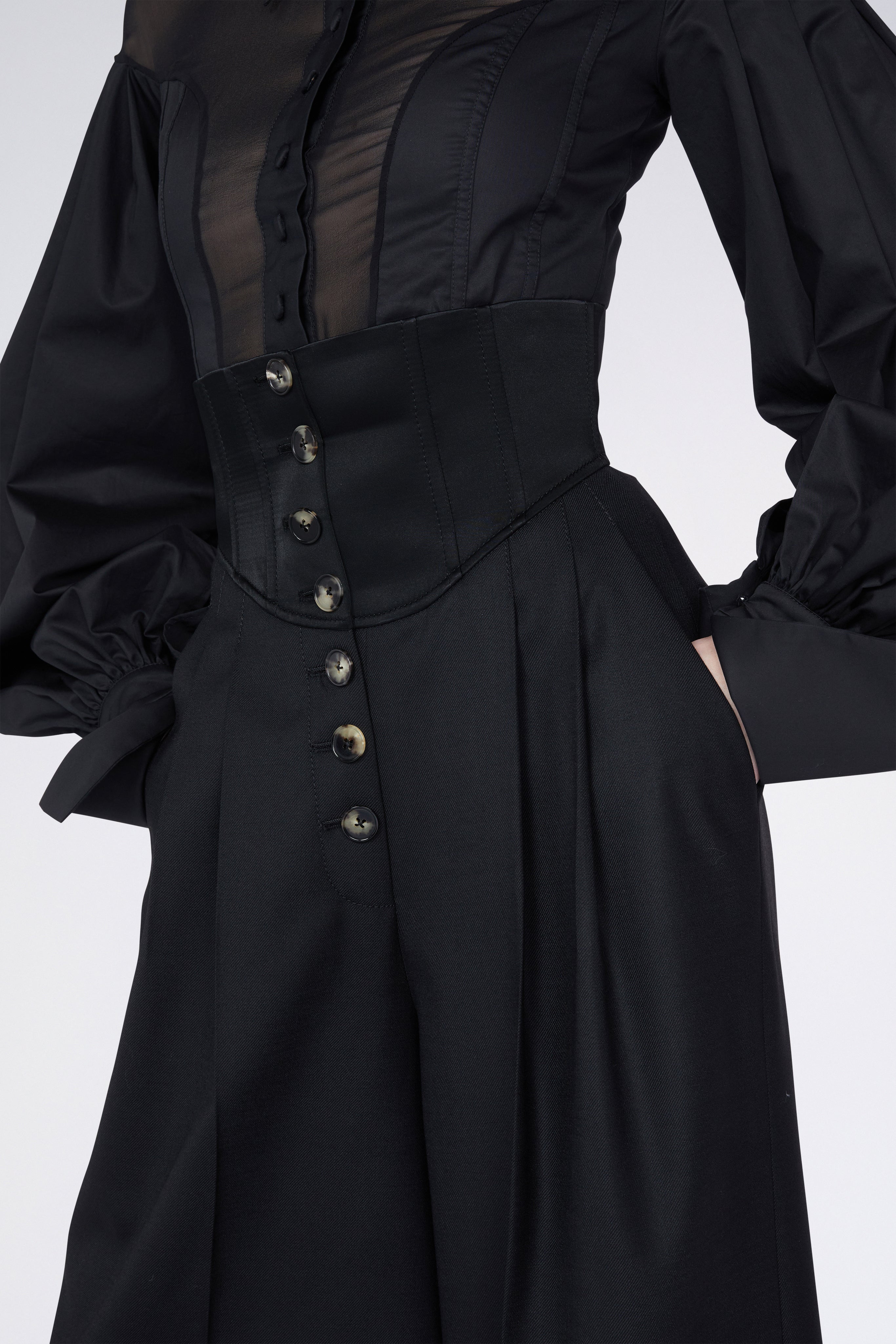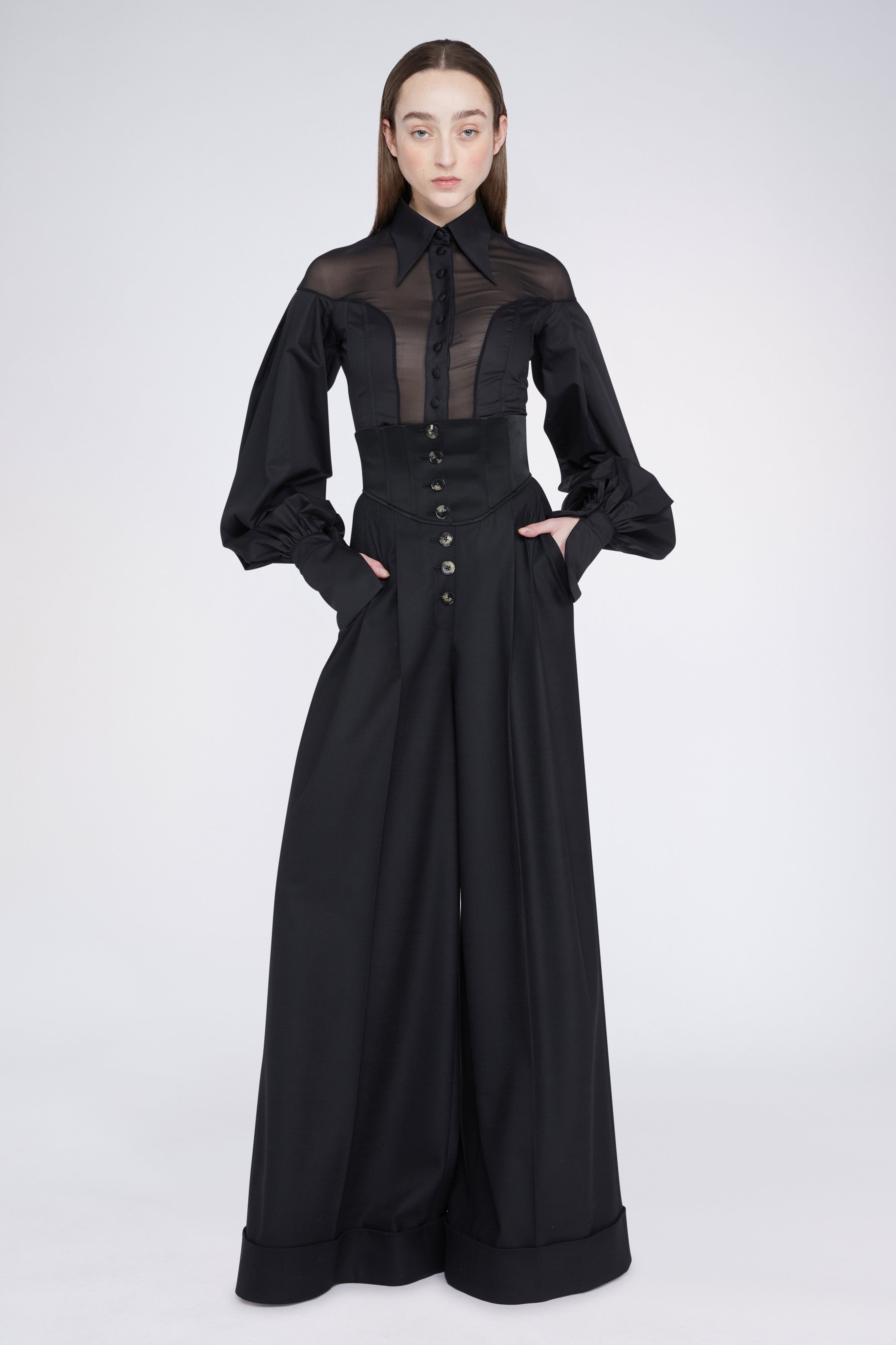 • High-waist palazzo pants made from wool-blended fabric with buttons on the front.