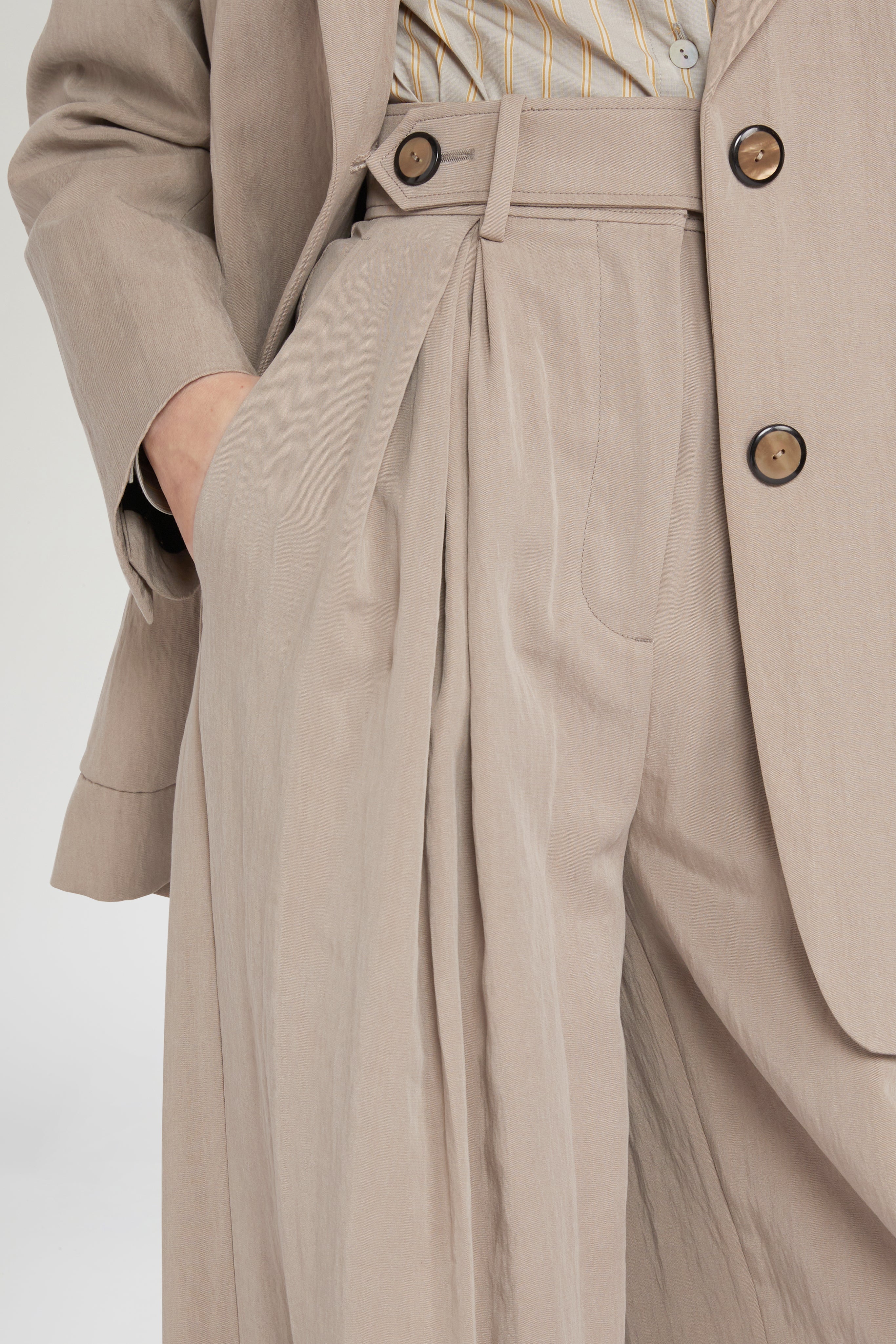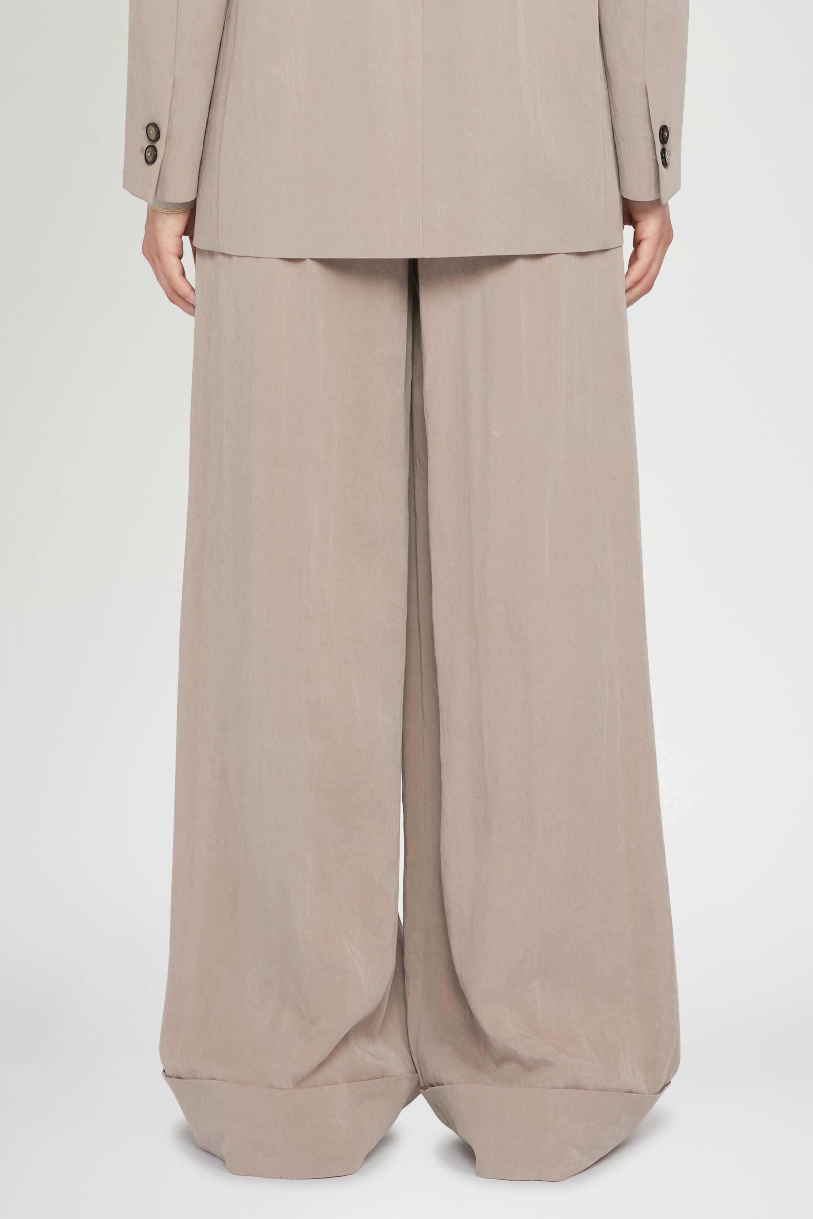 High-waisted palazzo trousers made from a soft, lightweight fabric, featuring tailored pleats and turn-up hems. Elegant and structured, they are a sophisticated staple in women’s sartorial dressing.