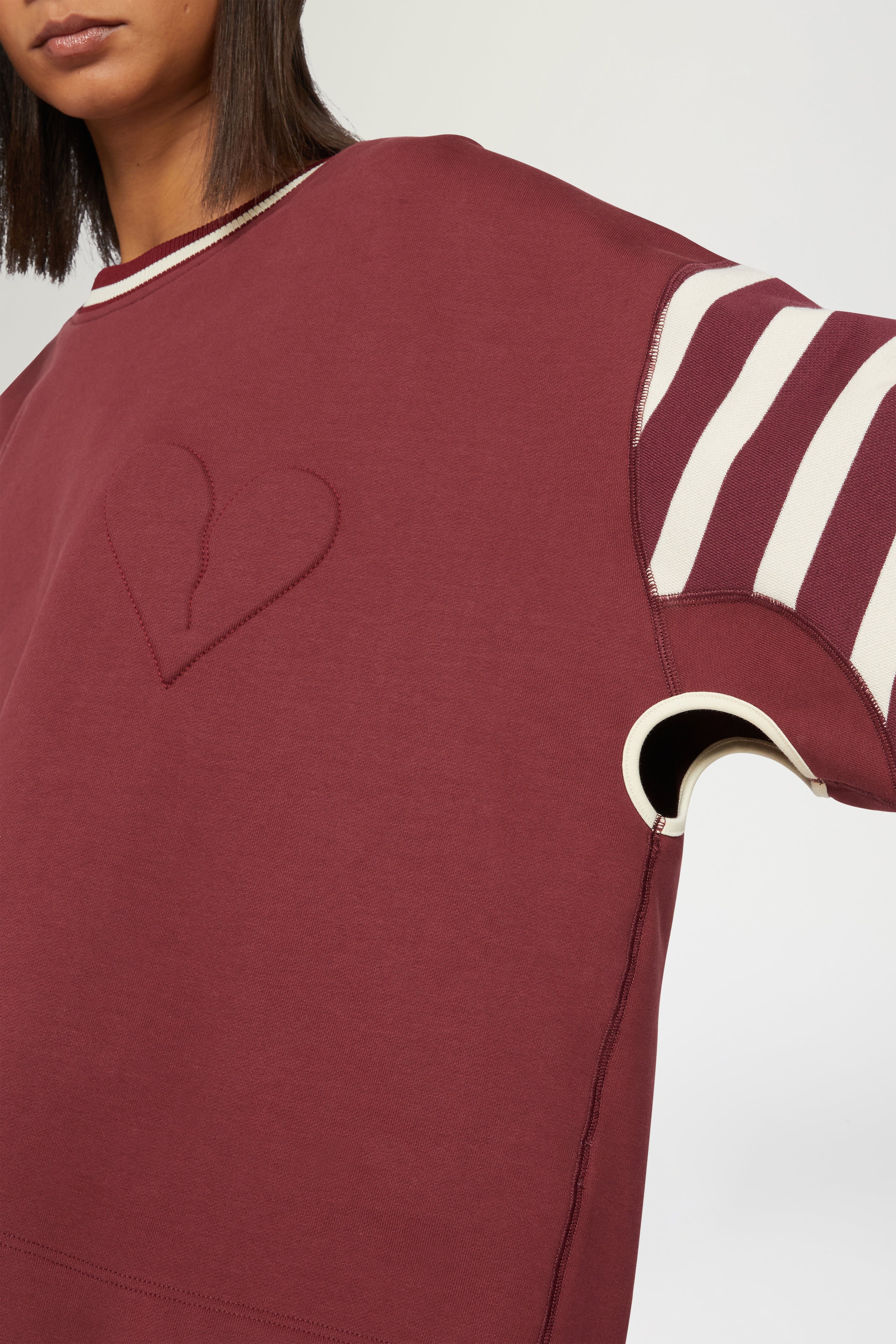Cotton T-shirt with a relaxed fit and 3/4 length striped sleeves. Features a ribbed crewneck and a tonal embroidered heart on the chest. Casual yet distinctive, perfect for layering.