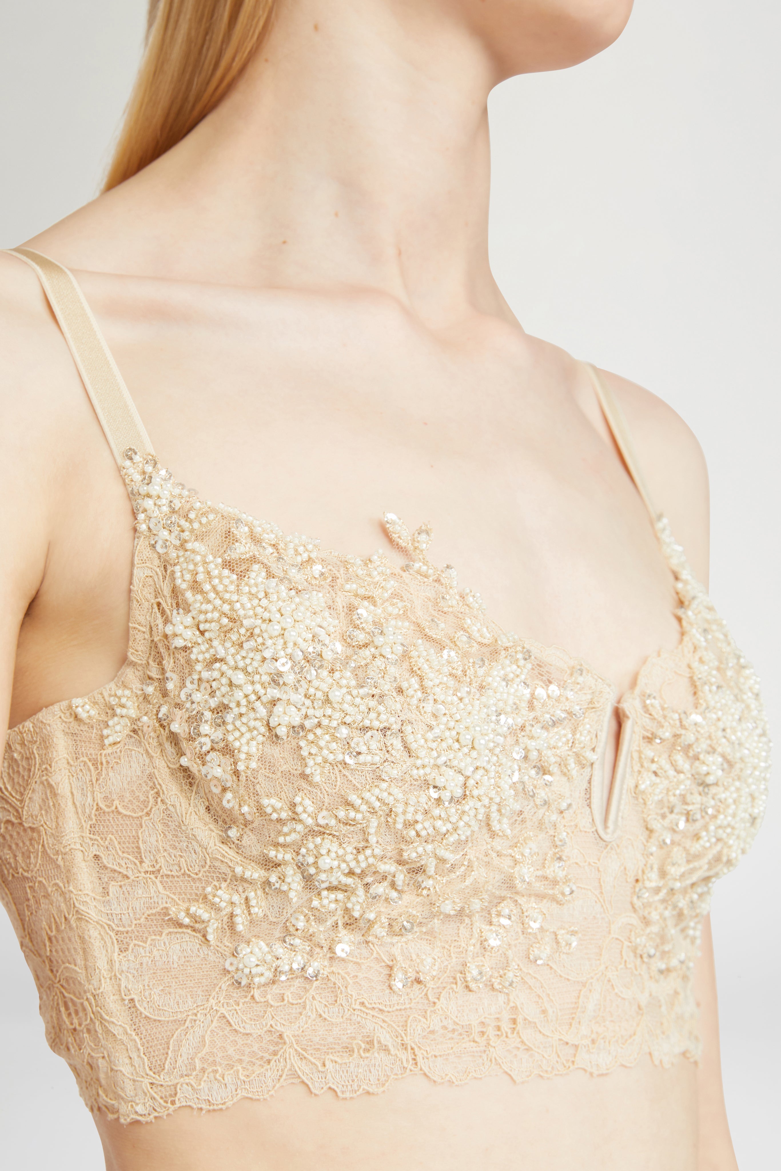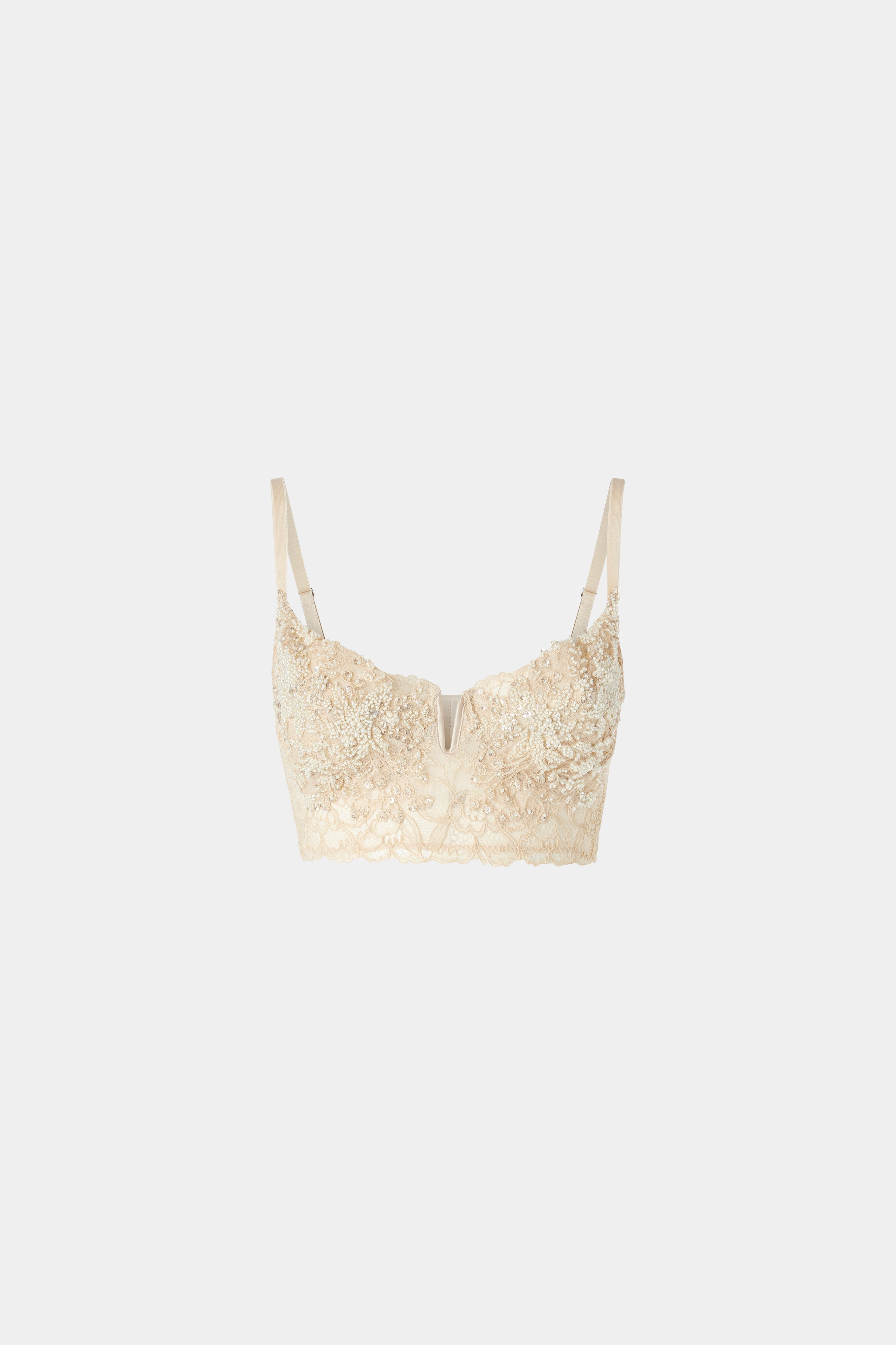 Delicate bralette in ivory lace, richly embellished with beads and sequins for a refined, luminous effect. Features adjustable straps and a small front cut-out for an elegant, feminine touch.