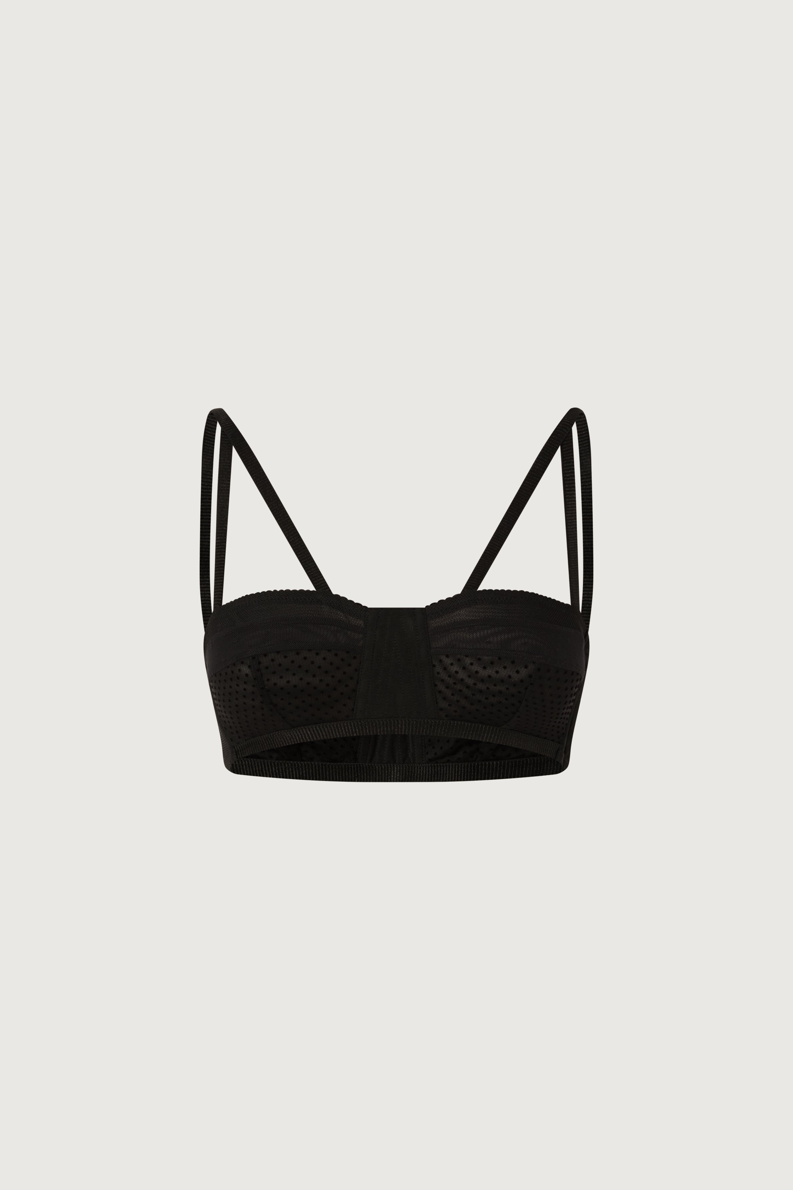 This black jersey bra features a sheer mesh design with dotted detailing, structured cups, and double shoulder straps for a modern, graphic touch. Lightweight and comfortable, it offers a sleek fit with a supportive elastic underband. Perfect for layering or wearing as a statement lingerie piece.