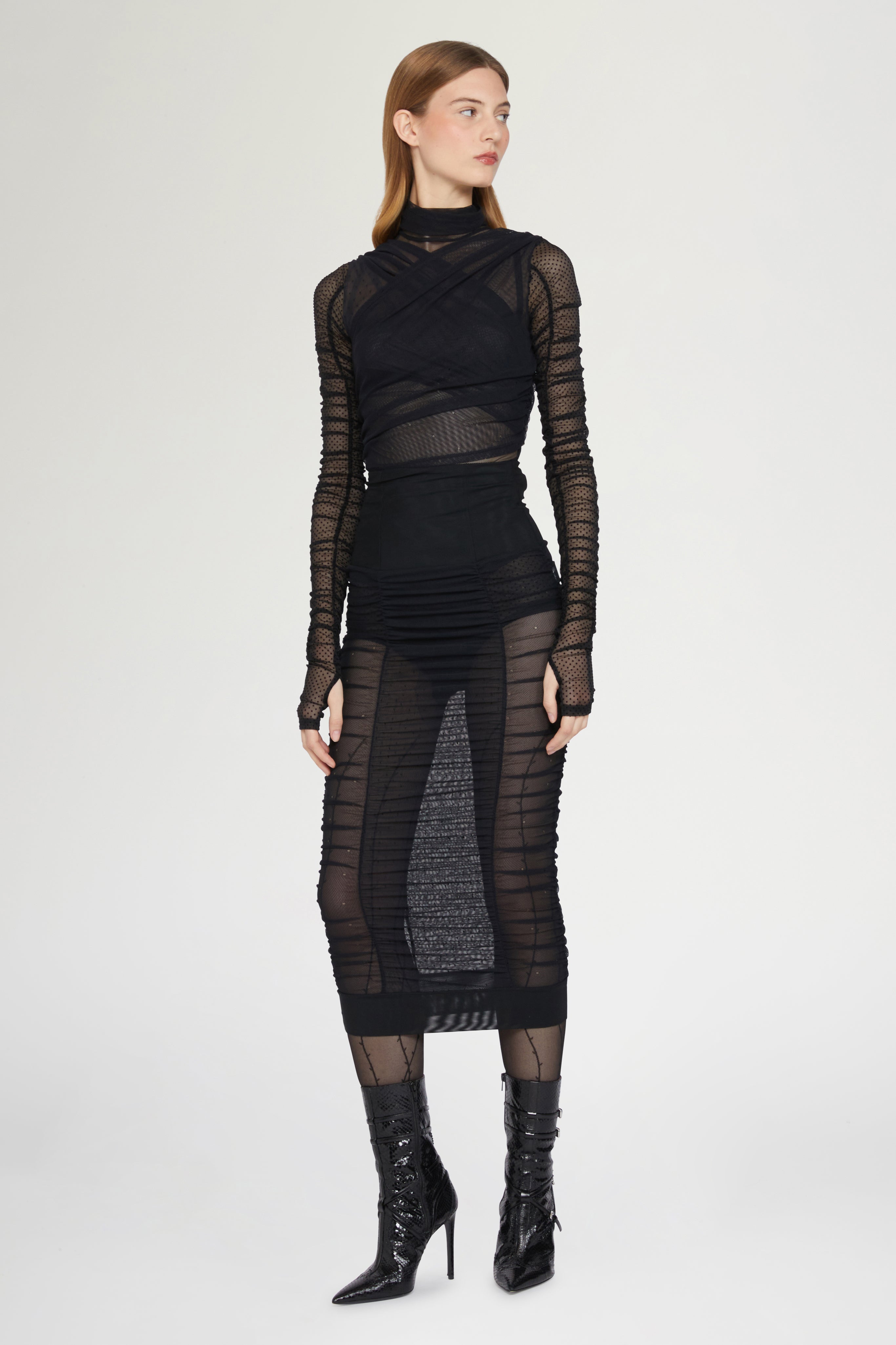 Elegant black tulle top with sheer polka-dot long sleeves and a high neckline. Features a draped crossover design on the bodice for a sophisticated, modern silhouette.
