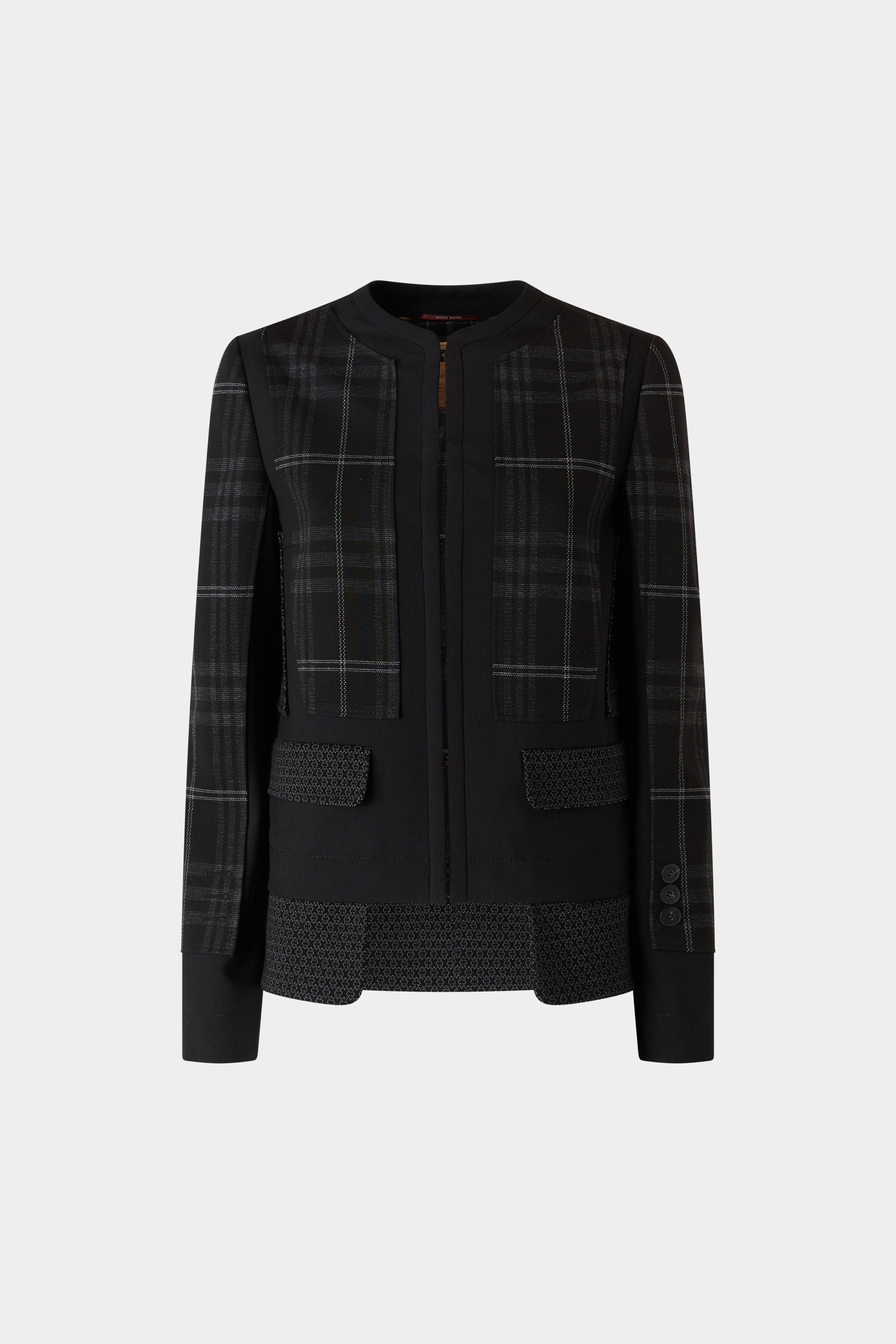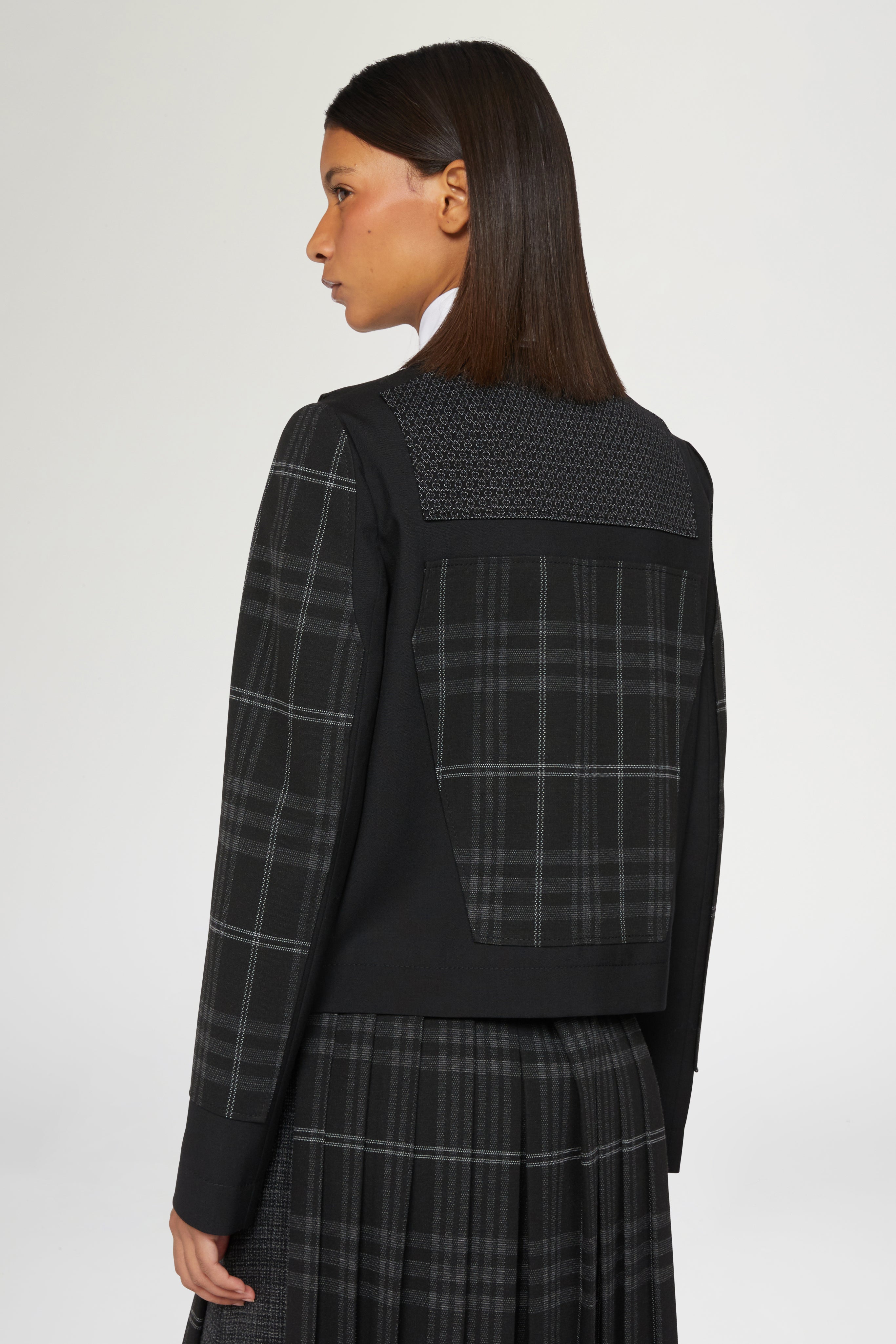 • Tailored blazer in black check fabric with mandarin collar and front flap pockets. Contrasting textured panels add a modern, structured finish.