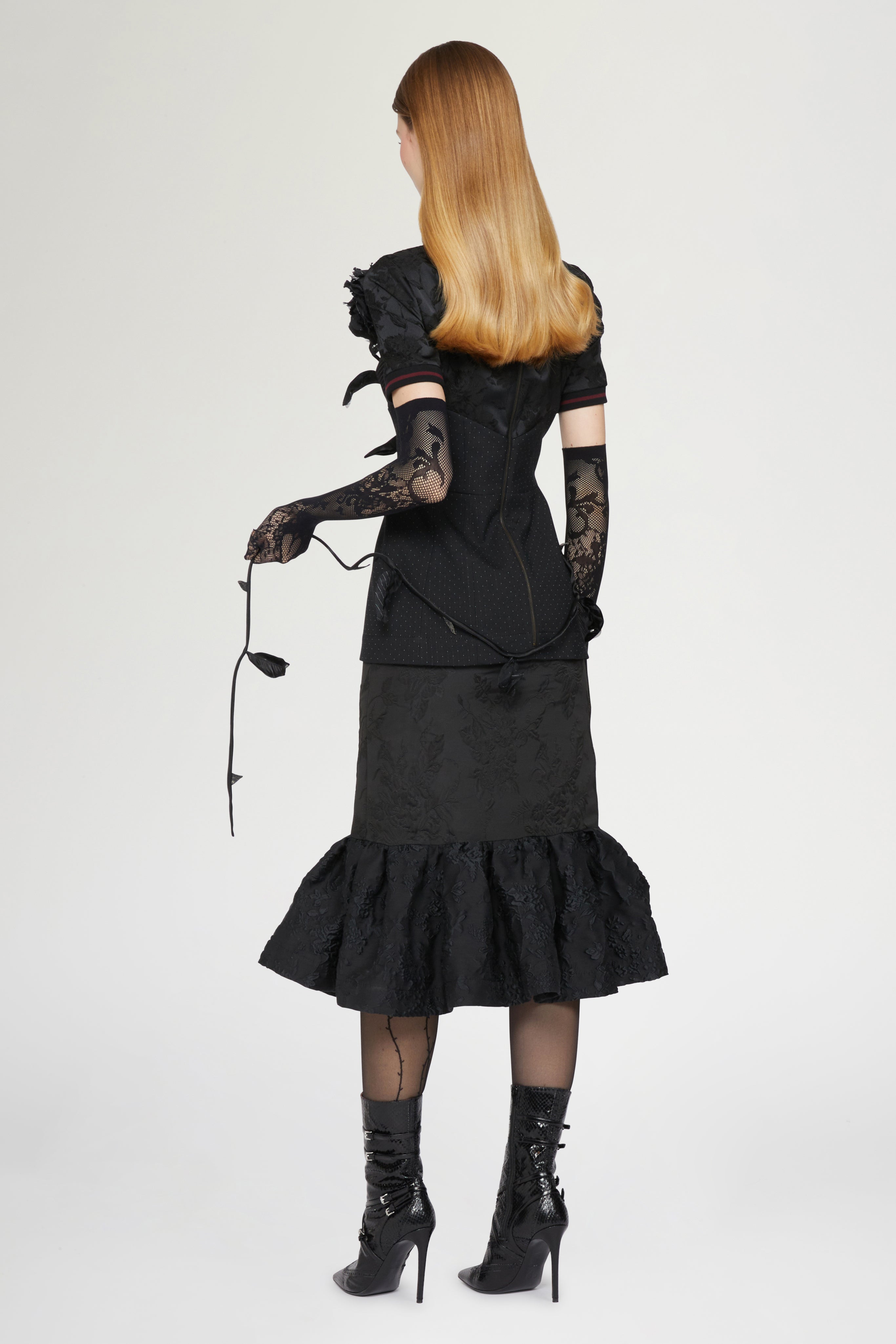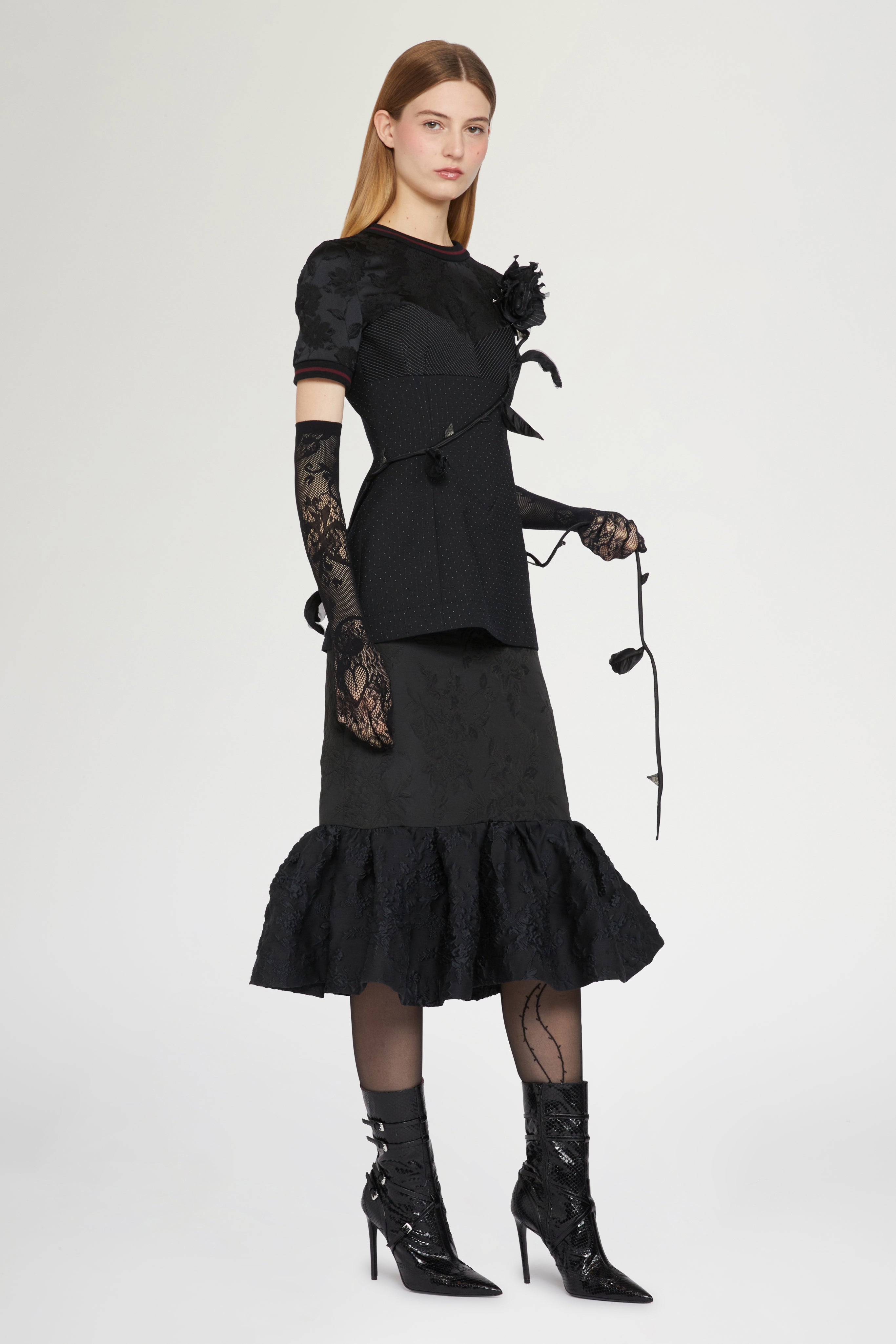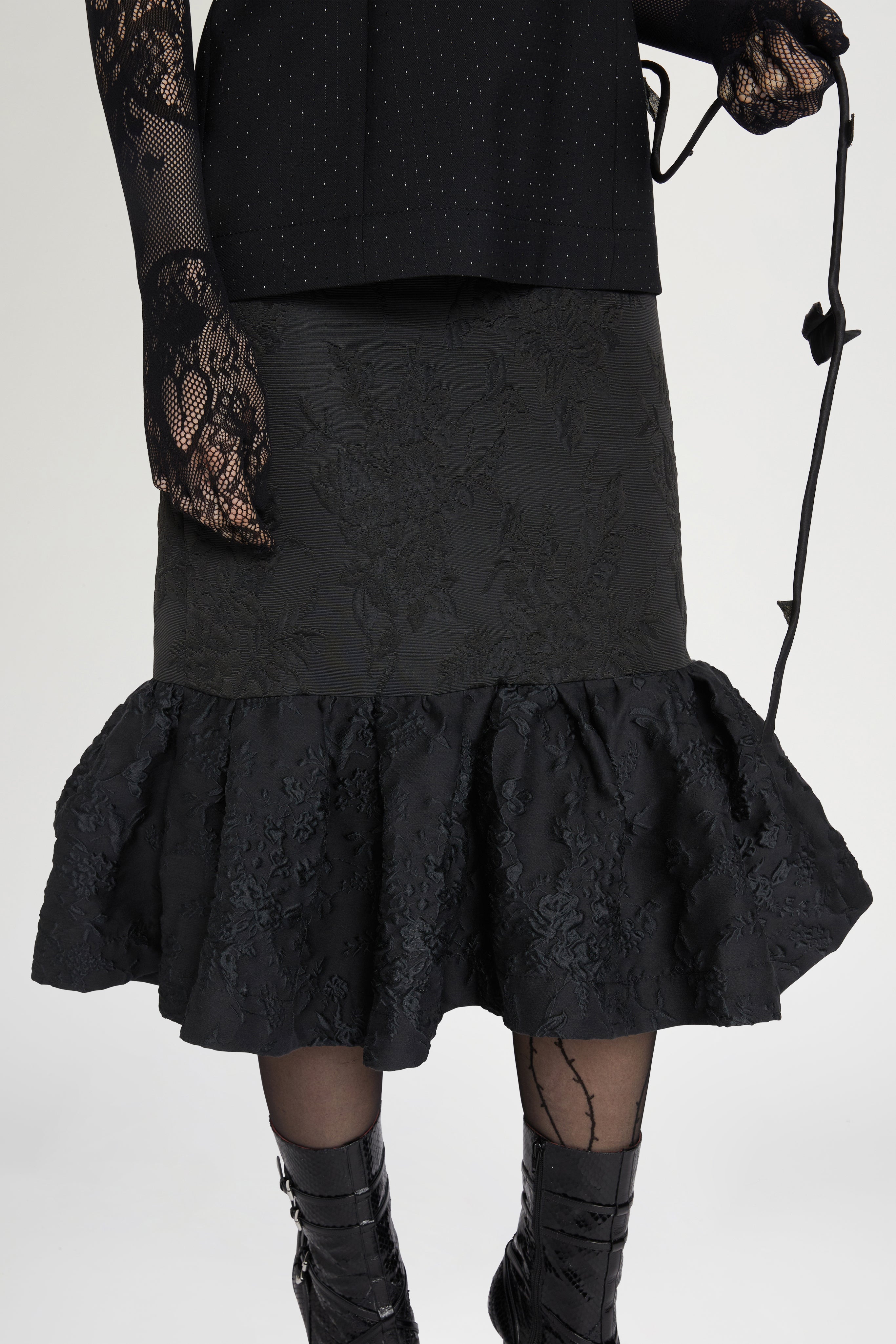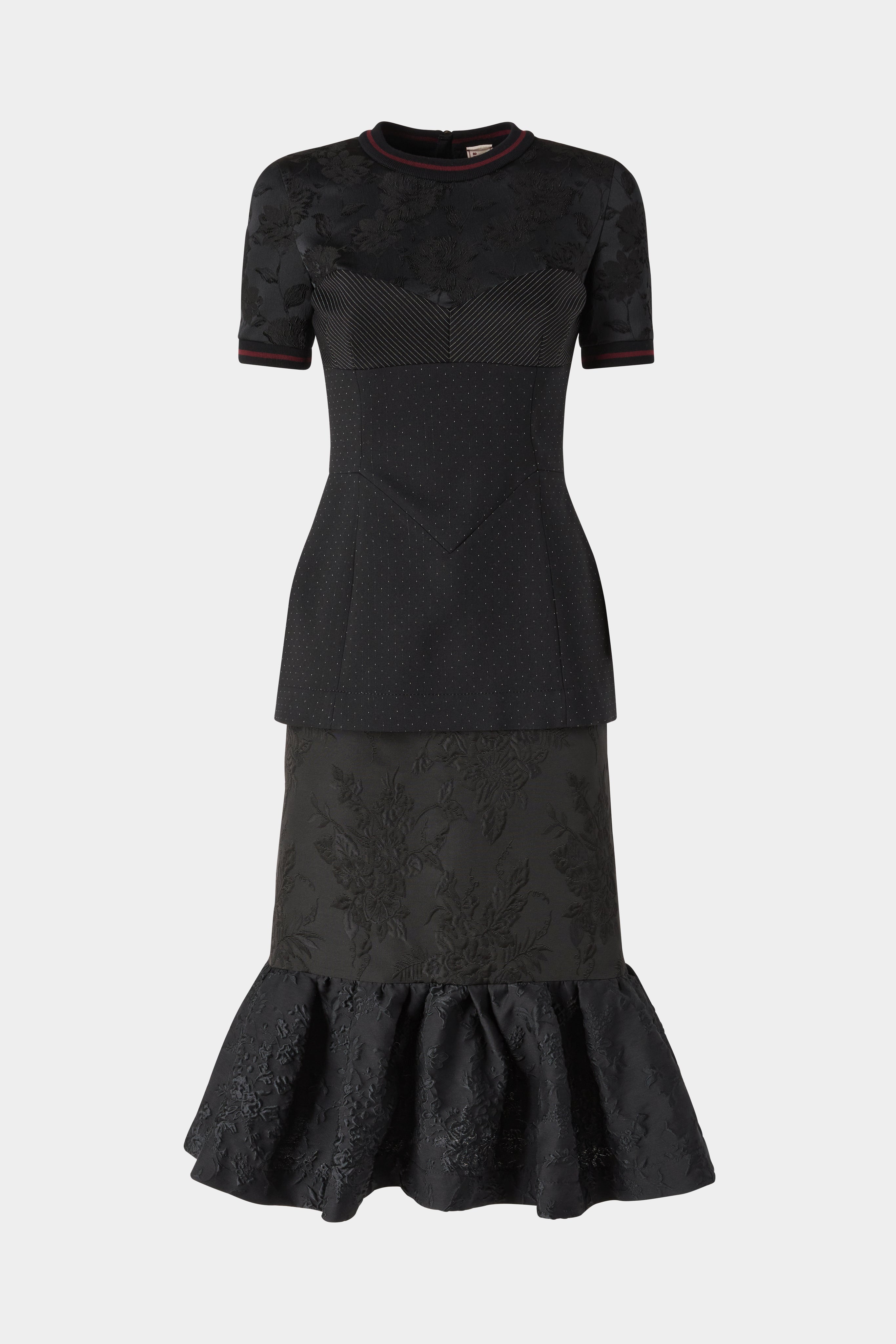 • Elegant black dress with fitted bodice and short sleeves, featuring jacquard floral detailing. Finished with a ruffled hem for a feminine, sophisticated silhouette.