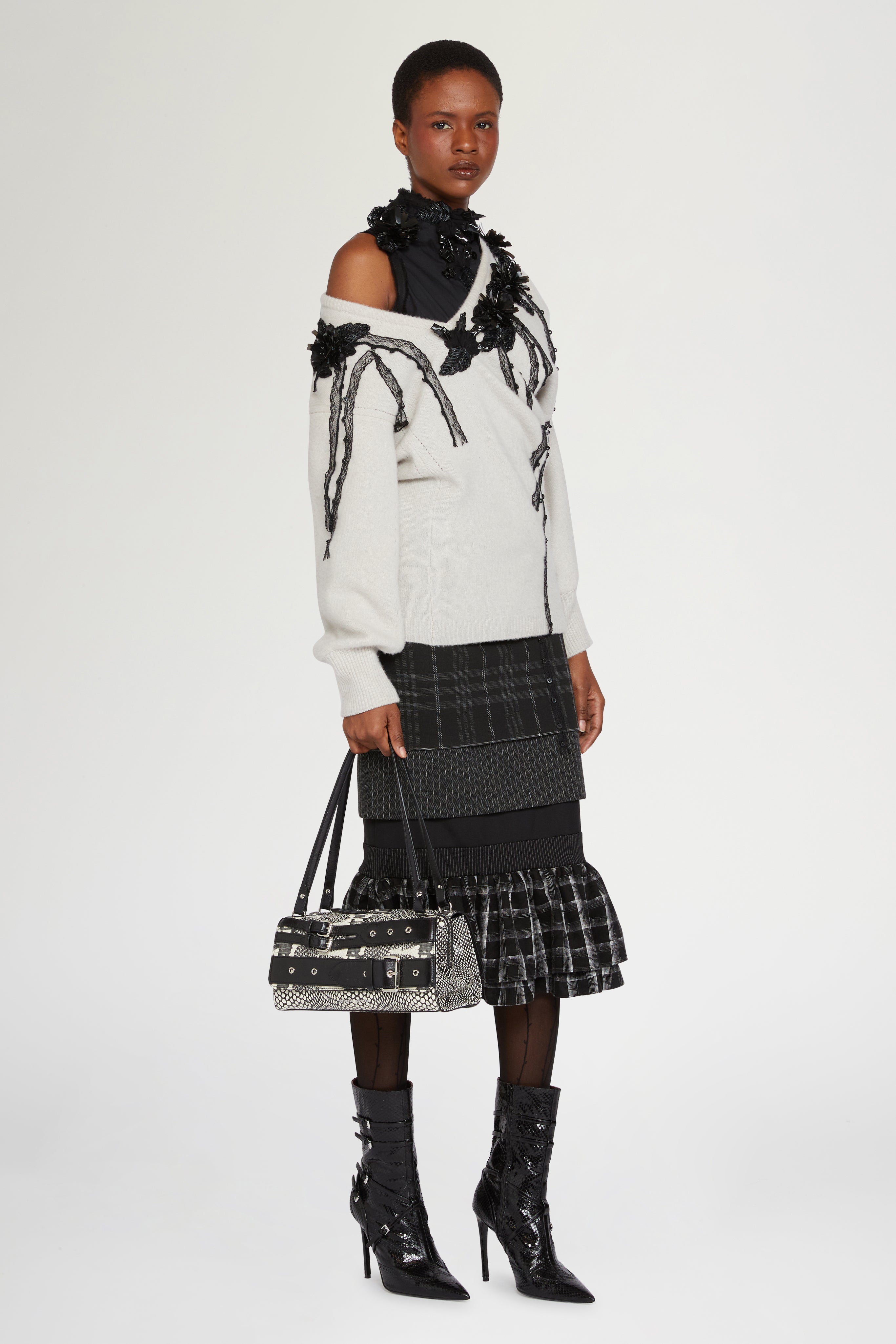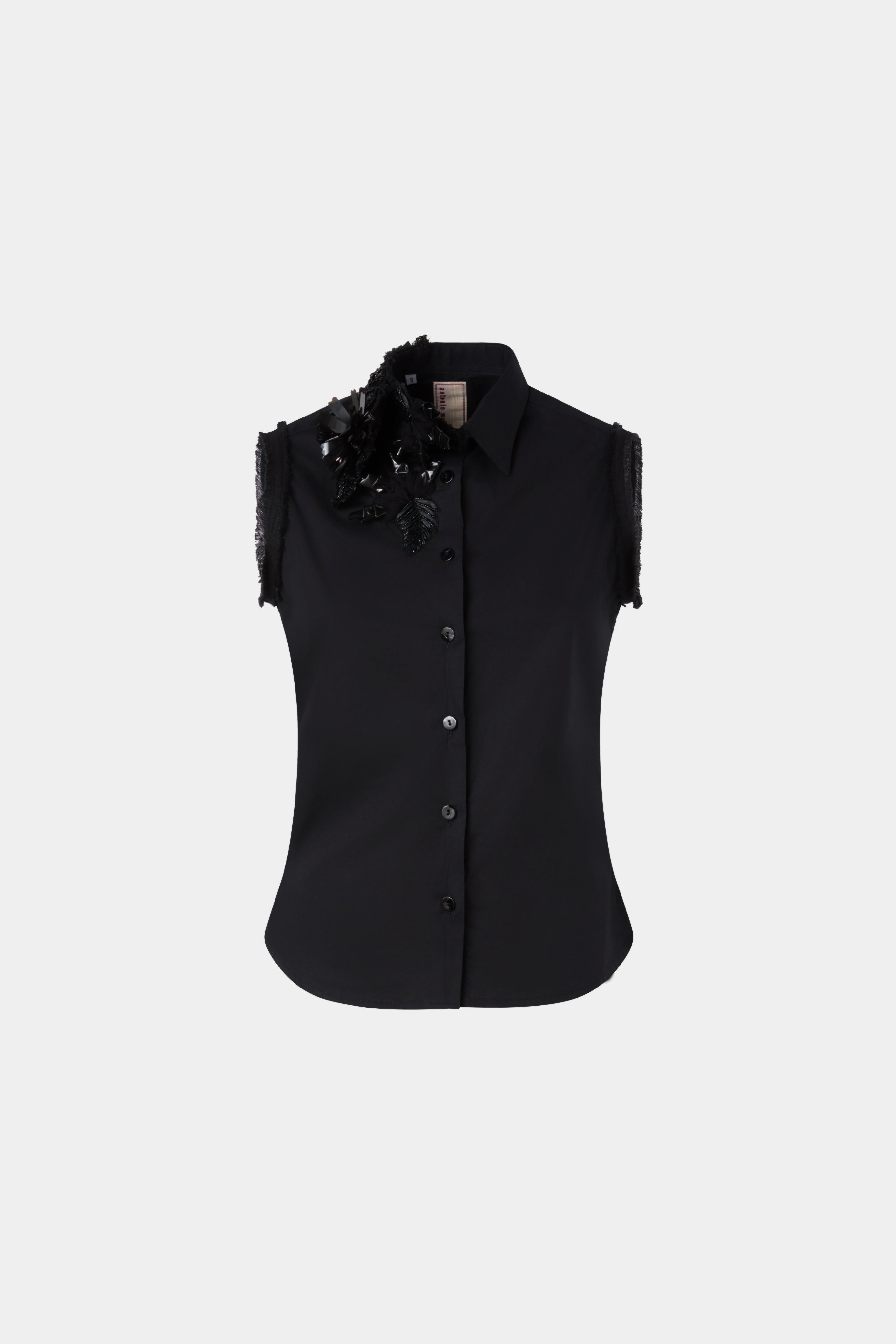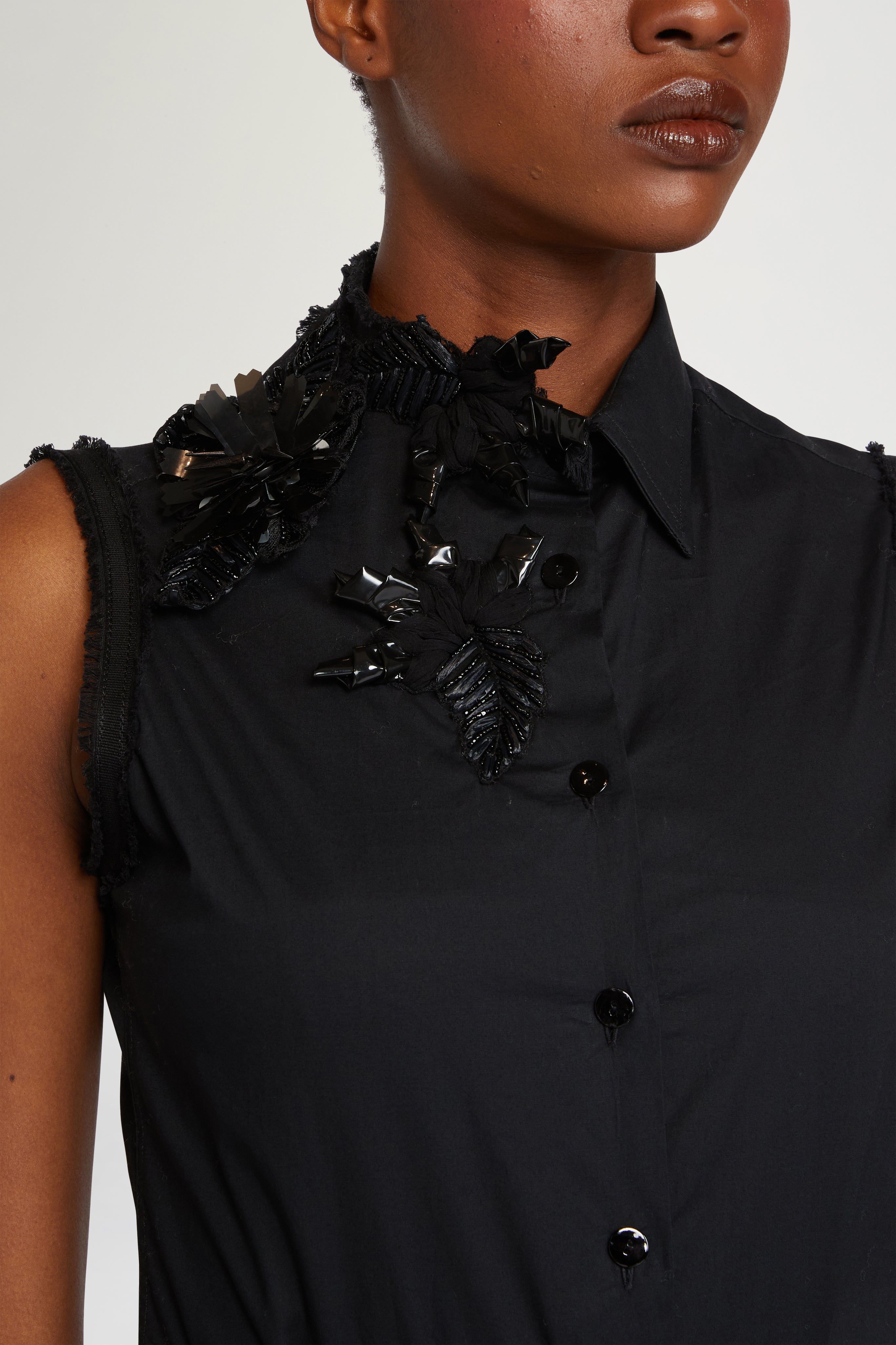 Black cotton sleeveless shirt featuring elaborate tonal beaded appliqués along the shoulder and collar. Finished with raw-edge trims and a fitted, clean silhouette. Front button fastening adds a refined, structured touch.