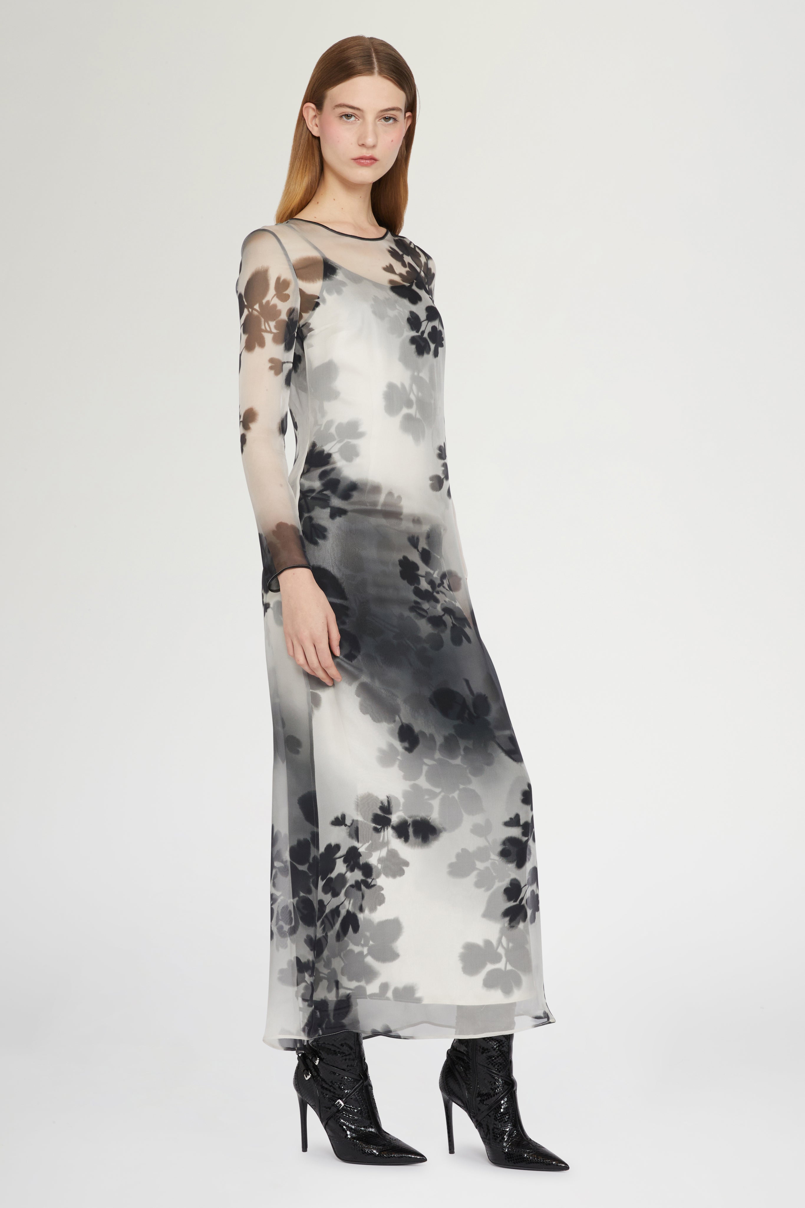 • This long silk dress features a sheer overlay with a delicate floral motif in soft gradient tones. Designed with long sleeves and a fitted silhouette, it offers an elegant yet contemporary look. A refined statement piece for evening or special occasions.