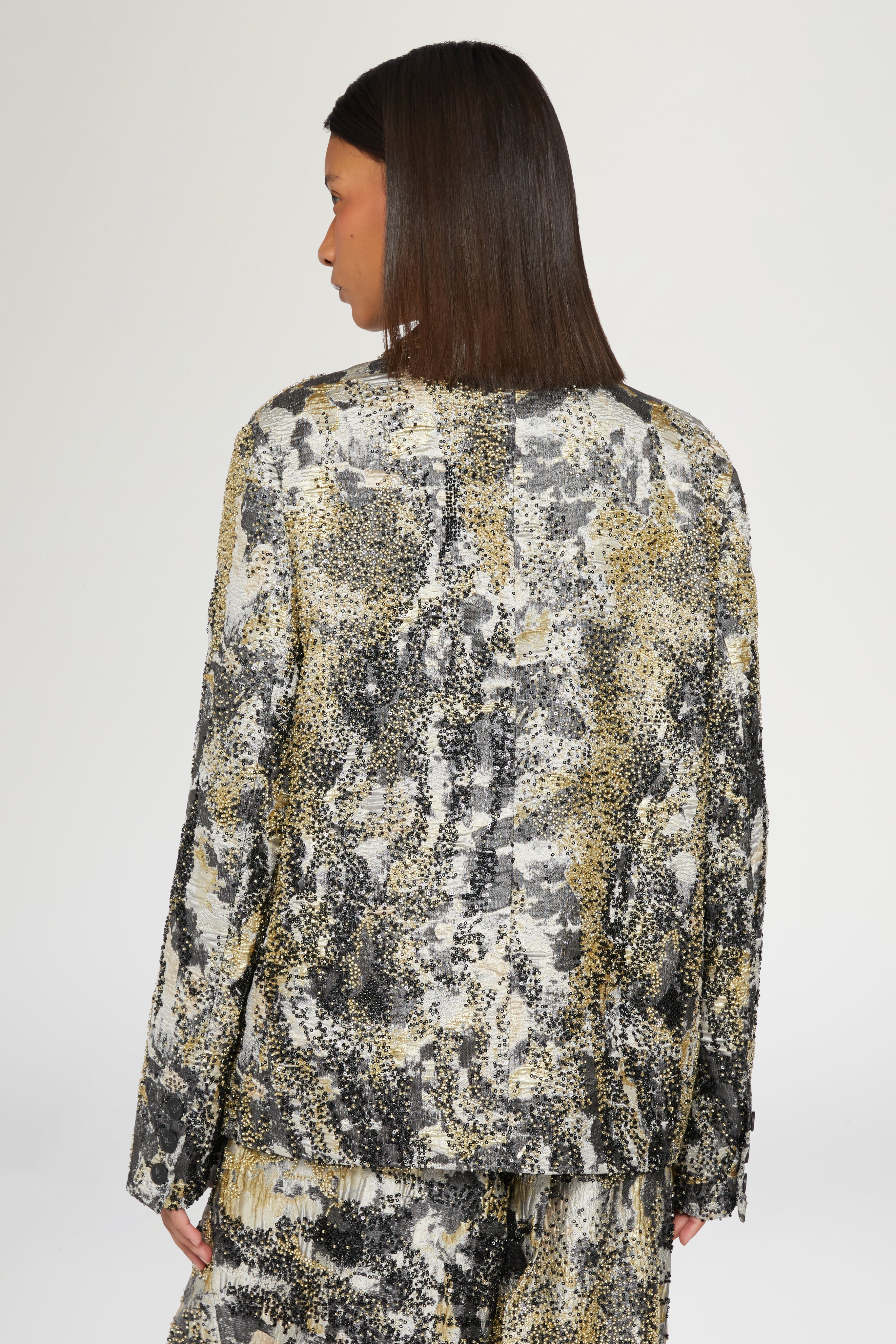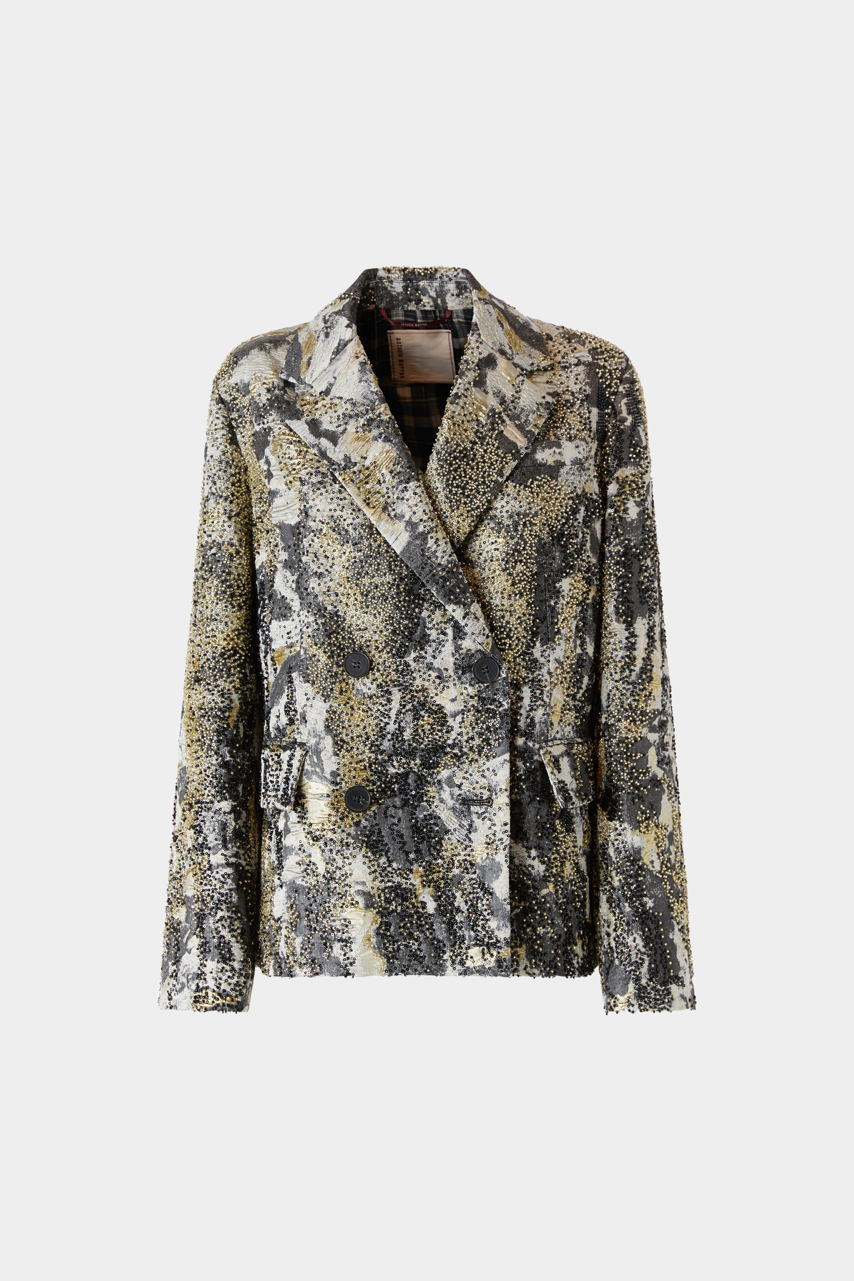 • Double-breasted blazer in textured brocade with an abstract pattern in gold, silver, and black tones. Fully embellished with micro beads for a luminous, tactile finish. Straight cut with peak lapels and flap pockets.