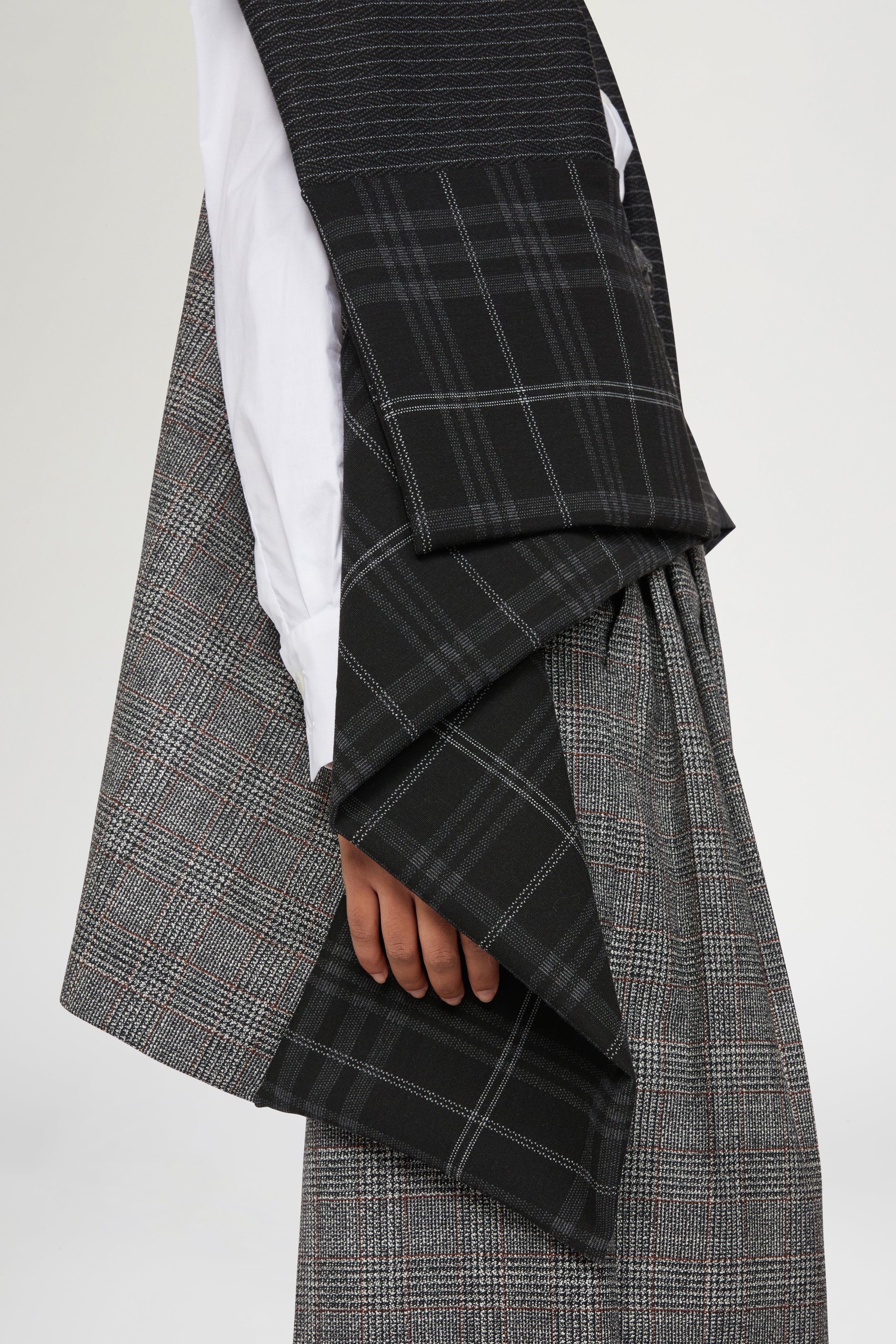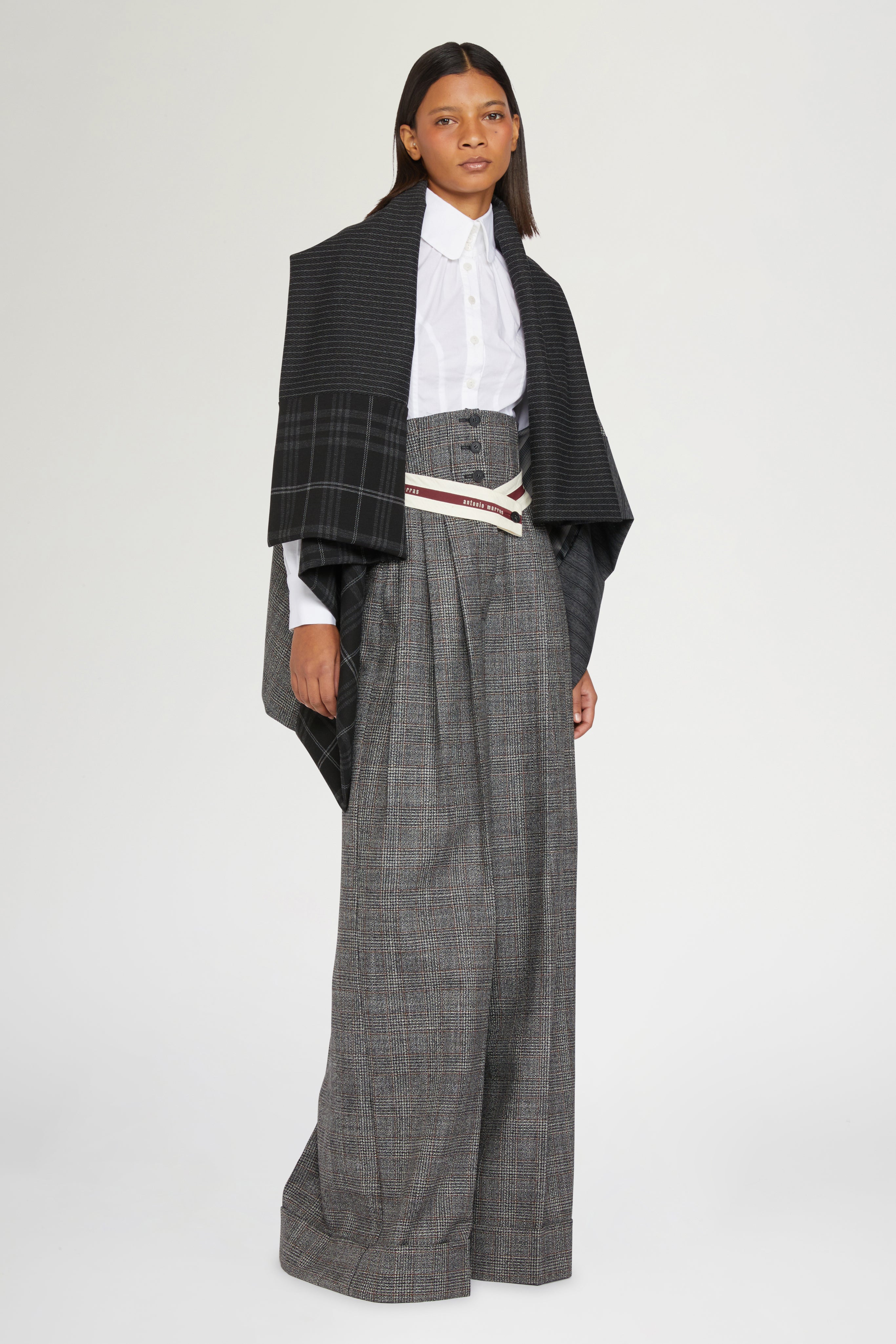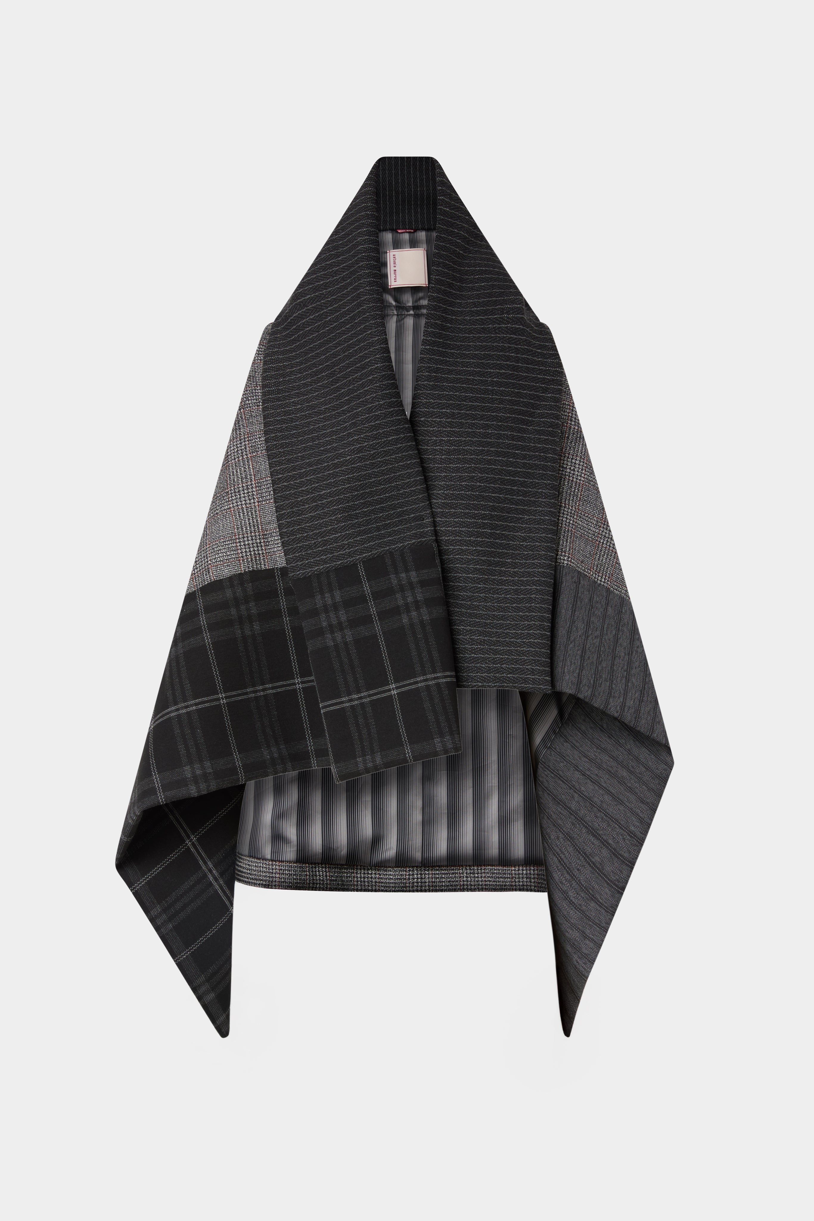 • Wool blend gavoi crafted with a patchwork of pinstripe, plaid, and Prince of Wales patterns. Featuring an oversized draped silhouette with tie fastening at the back. A versatile statement piece that reinterprets classic tailoring with a modern edge.