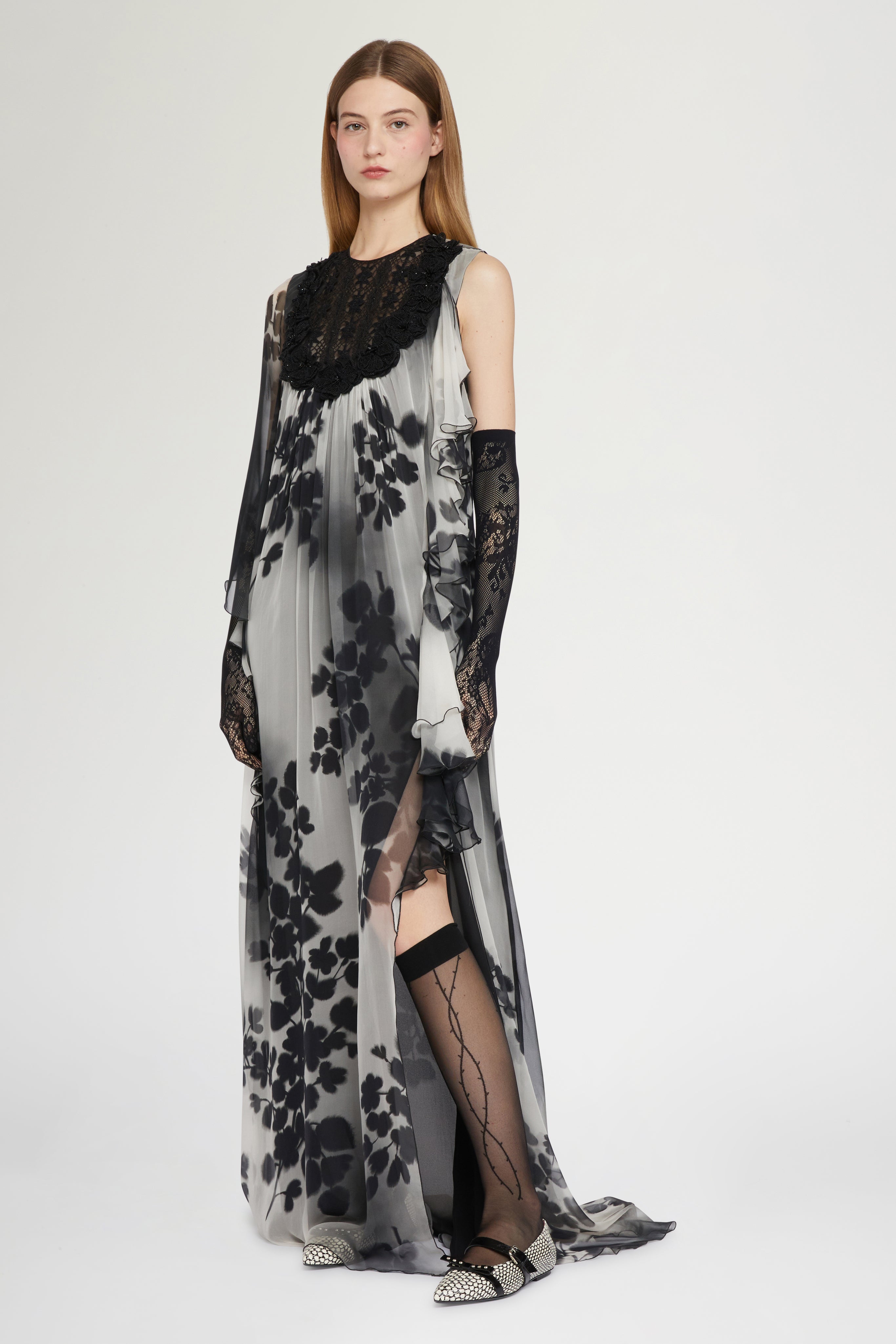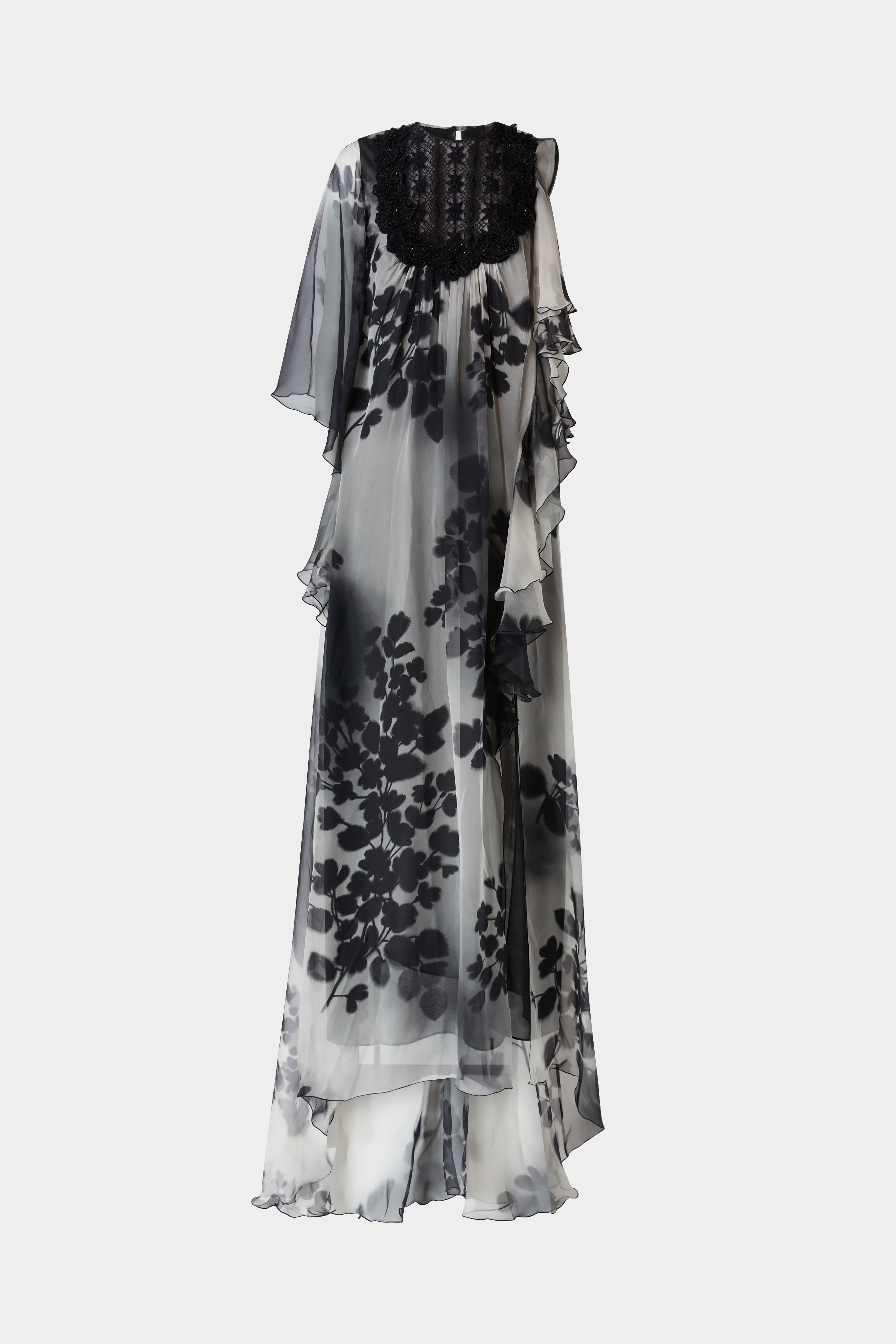 • Long silk dress featuring a black floral dégradé print and romantic ruffle detailing. The design is elevated by a lace yoke adorned with floral embellishments, blending ethereal lightness and artisanal sophistication.