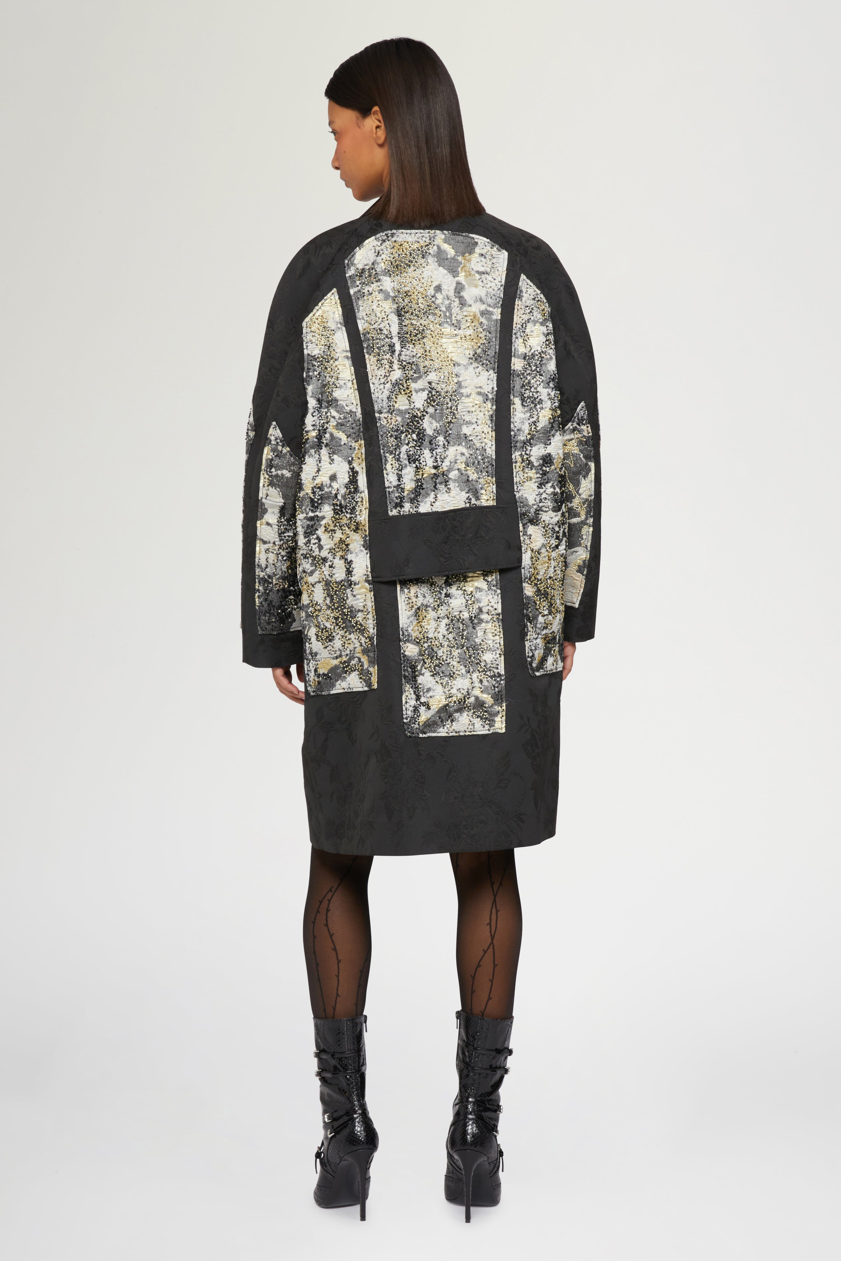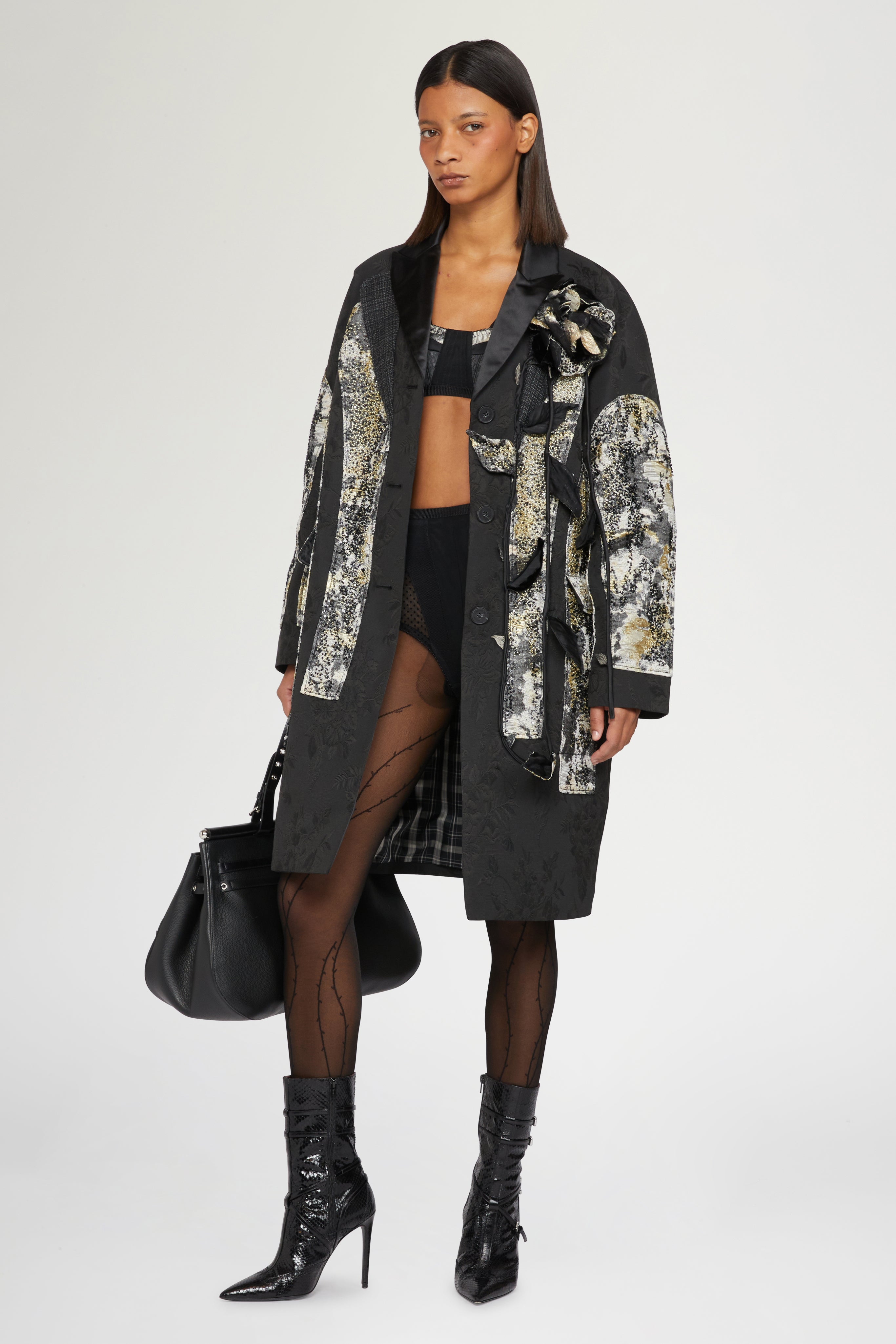 Tailored coat with a straight fit and single-breast button closure, crafted in cotton-blend fabric. Enriched with beaded panels, it combines elegance with contemporary flair.