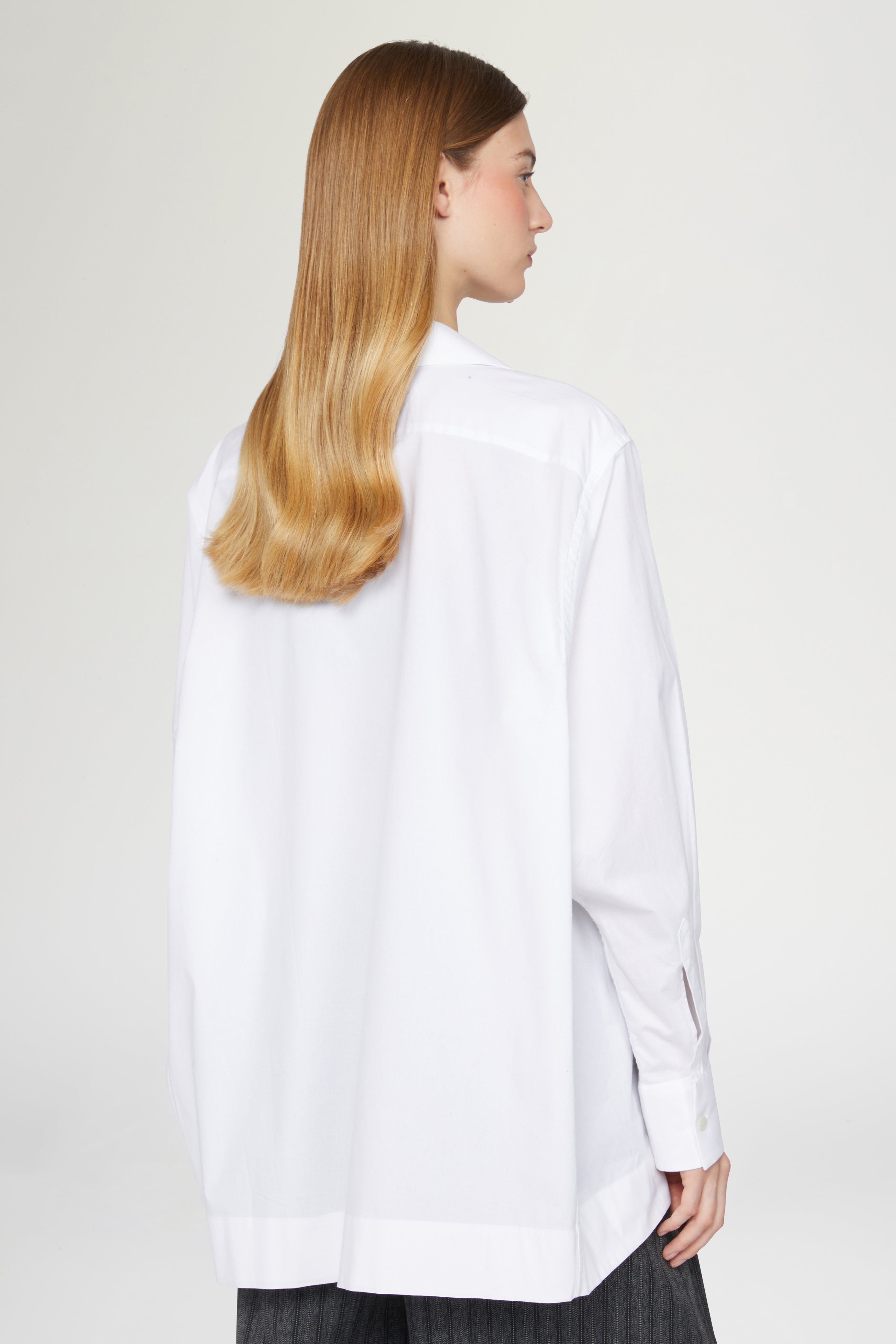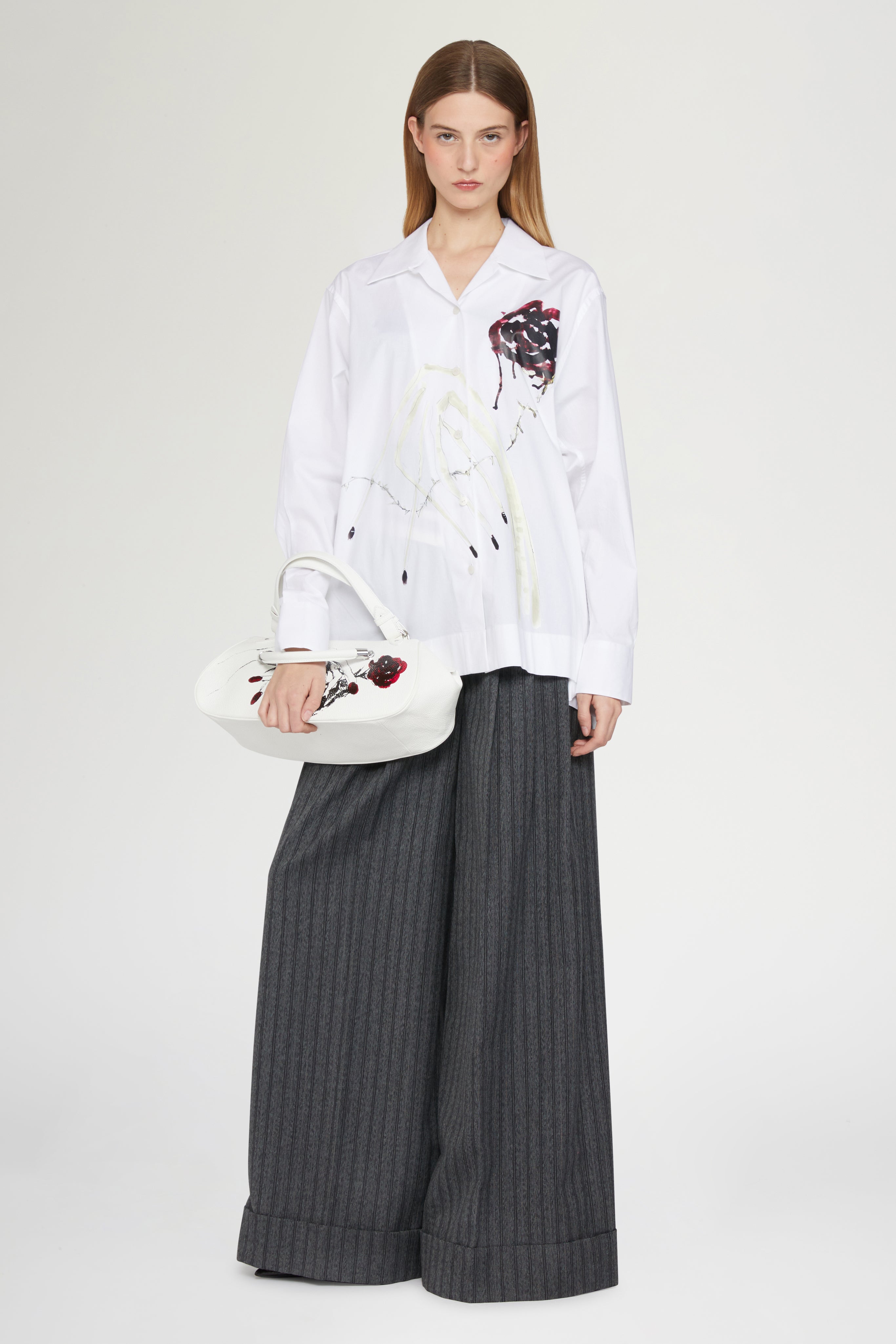 • White cotton poplin shirt featuring a hand-painted rose motif with fluid, expressive brushstrokes. Designed with a relaxed silhouette, open collar, and front button closure. Artistic detailing adds a bold, modern finish.