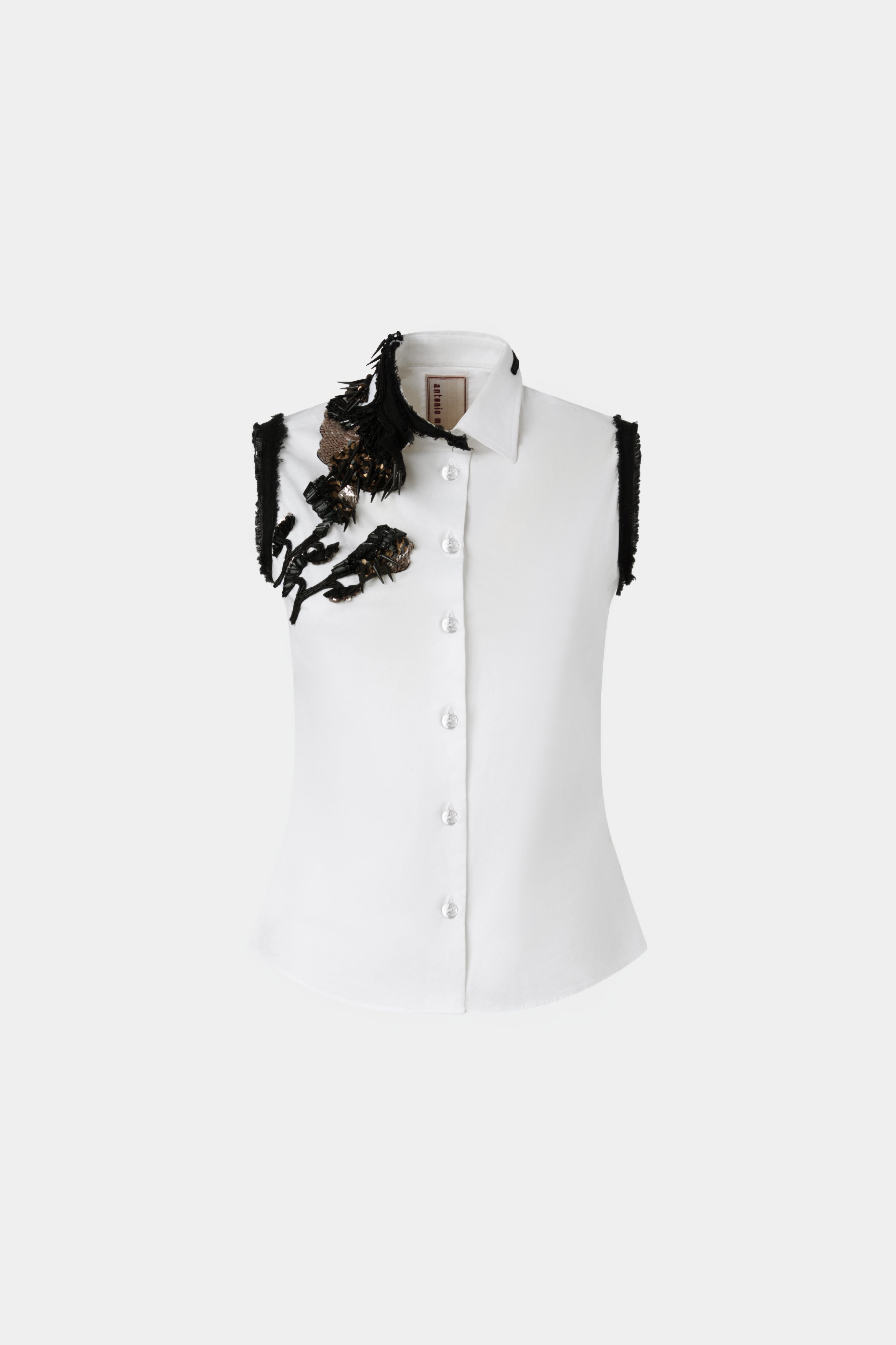 White cotton sleeveless shirt featuring intricate black beaded and sequin appliqués along the shoulder and collar. Designed with raw-edge trims and a fitted silhouette. Front button closure completes the tailored yet ornate look.