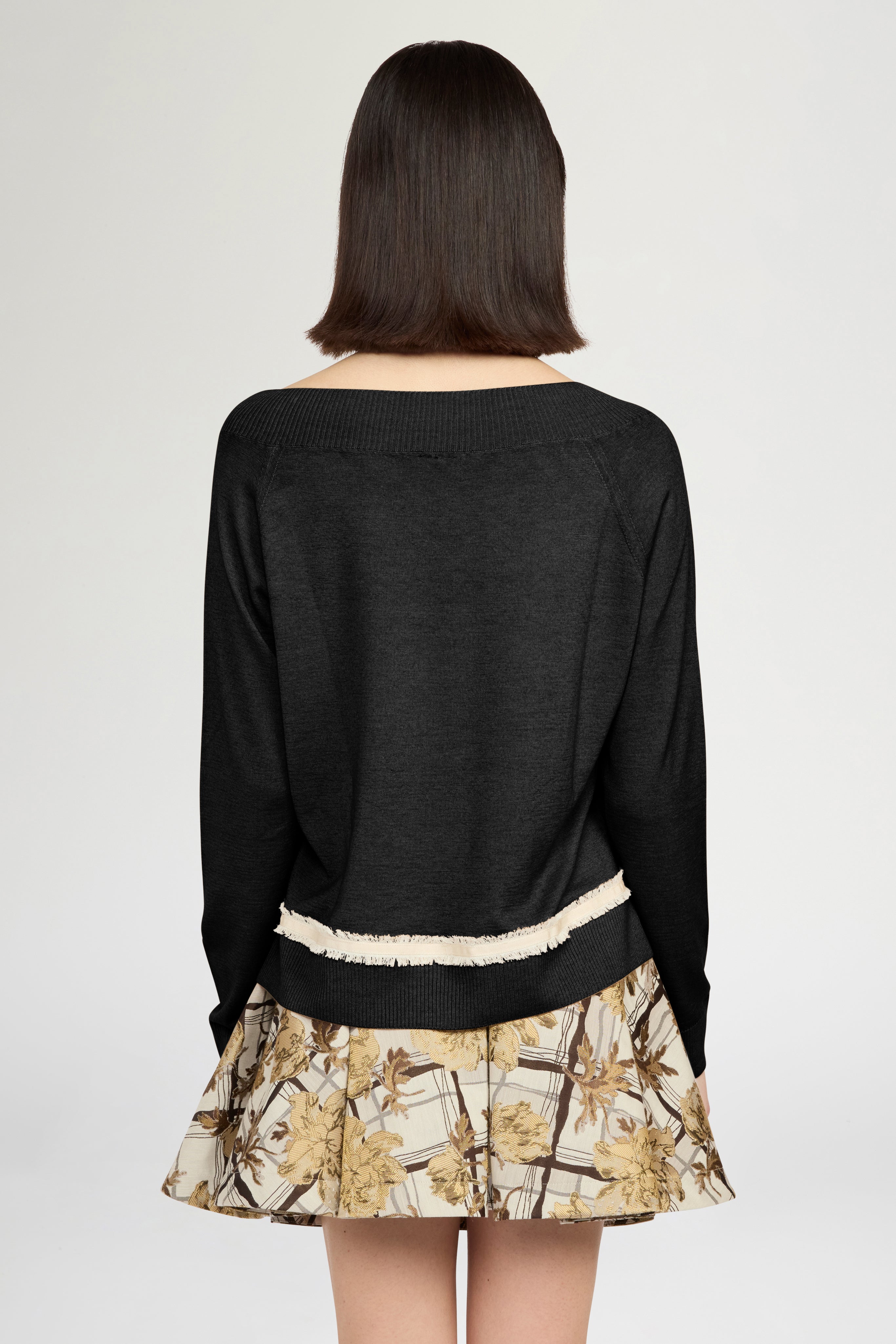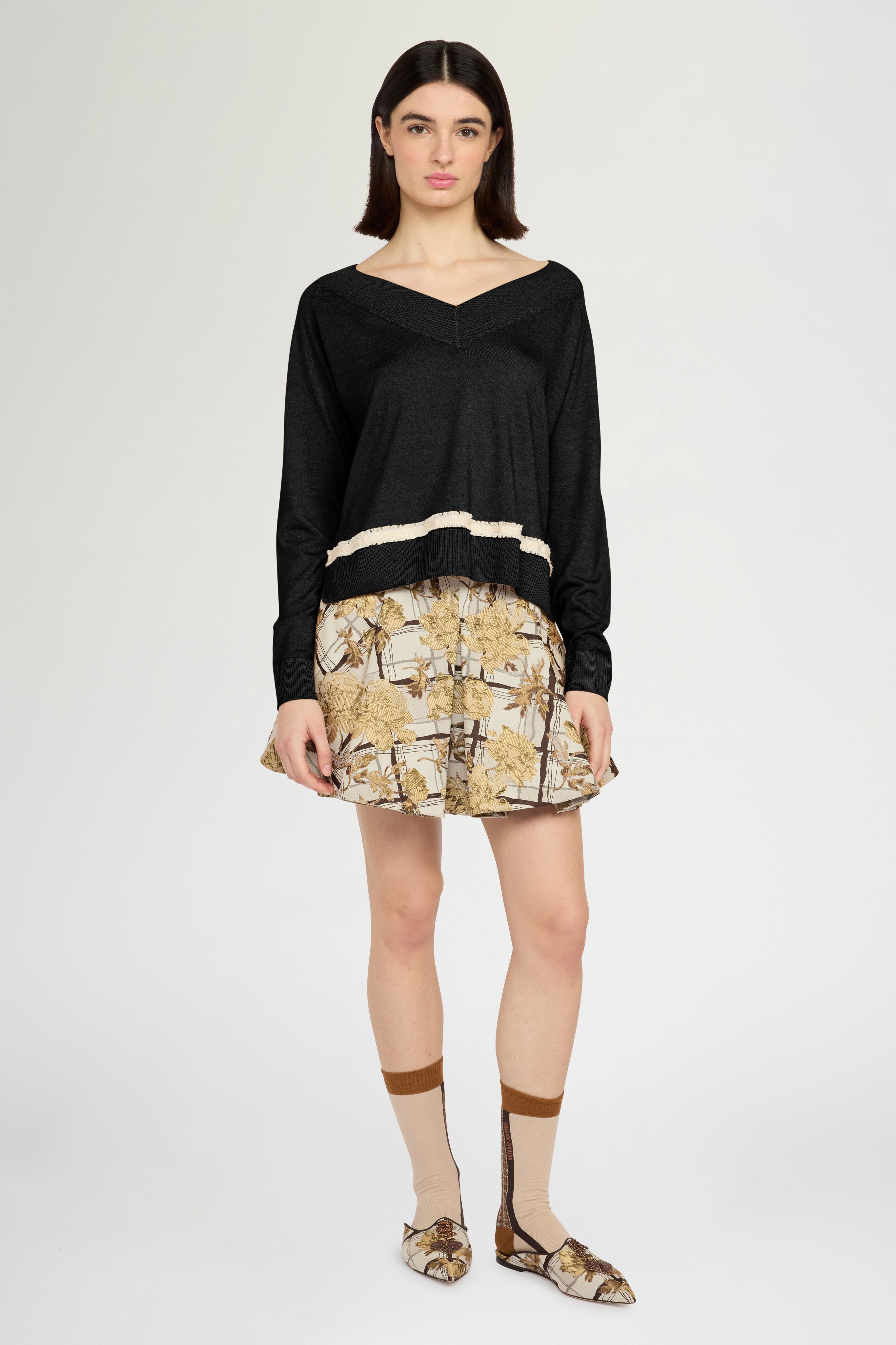 • Long‑sleeved cashmere V‑neck sweater with high rib trims and contrasting ecru fringed cotton grosgrain hem detail. Soft fit and regular length.