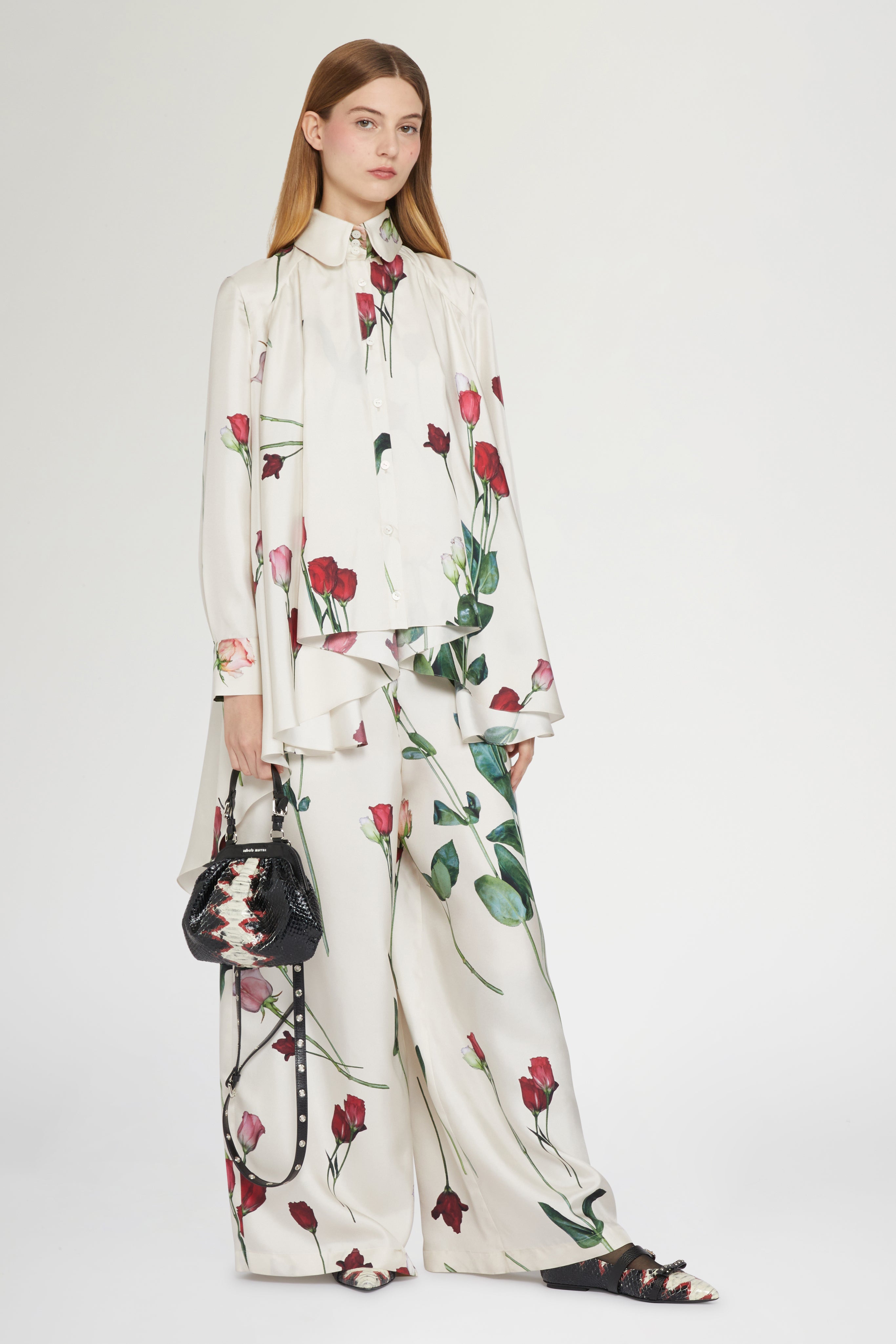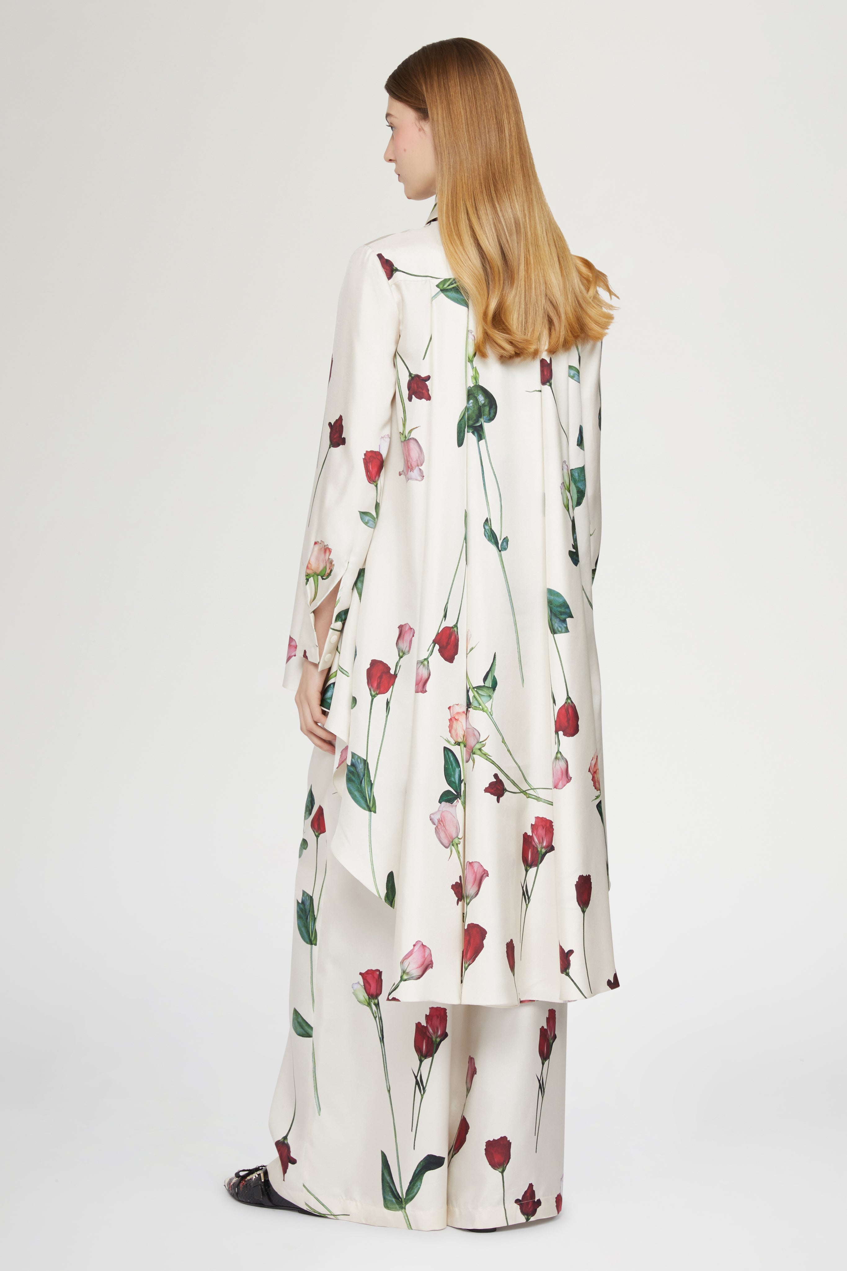 • Wide-leg trousers in 100% silk with floral print on ivory background. The fluid silhouette and relaxed cut ensure both comfort and elegance.
