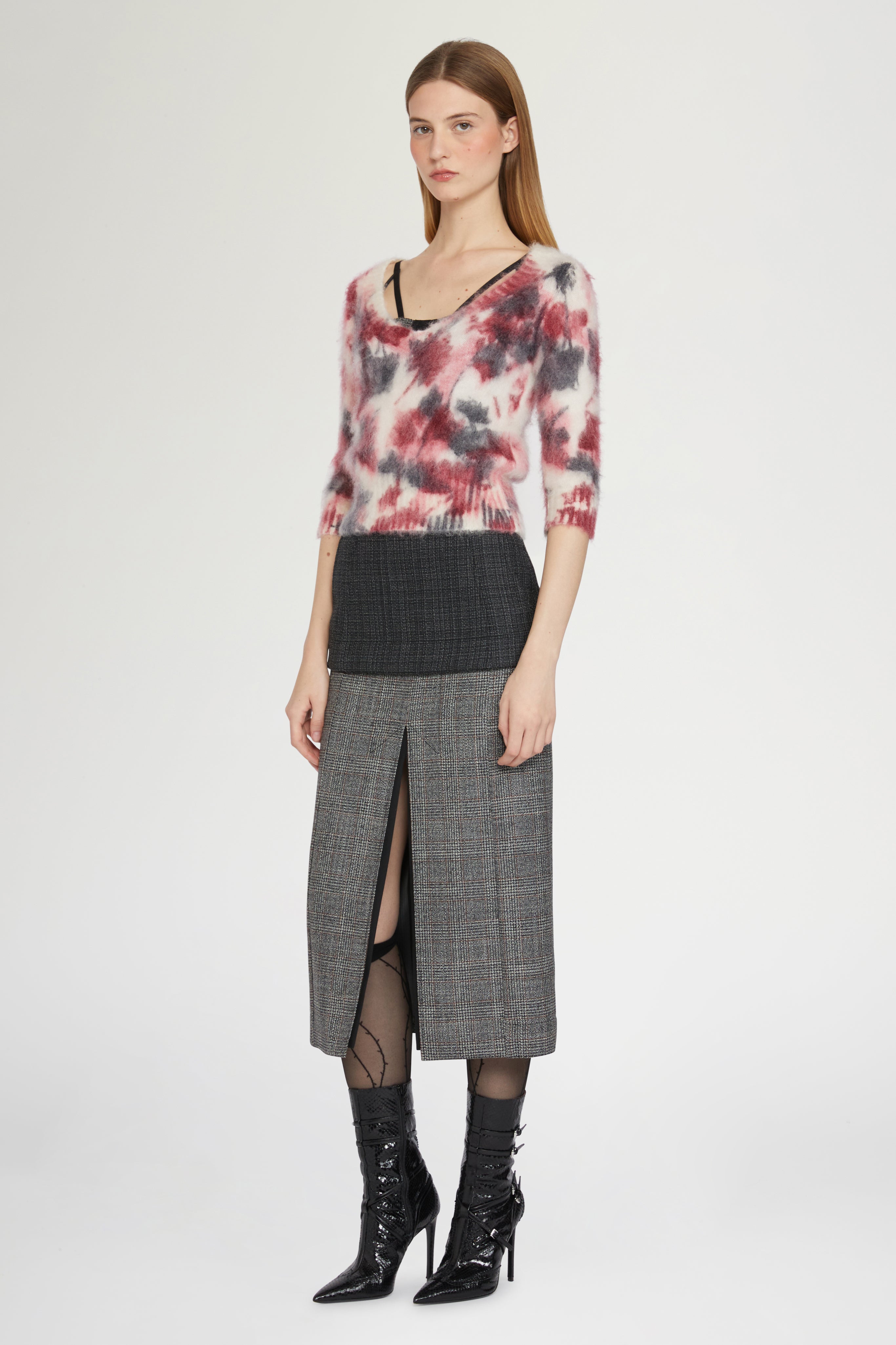 • Soft V-neck sweater in ivory and bordeaux mohair blend, featuring a fluffy texture and ribbed details. Designed with elbow-length sleeves and a slightly fitted waist for a feminine silhouette.