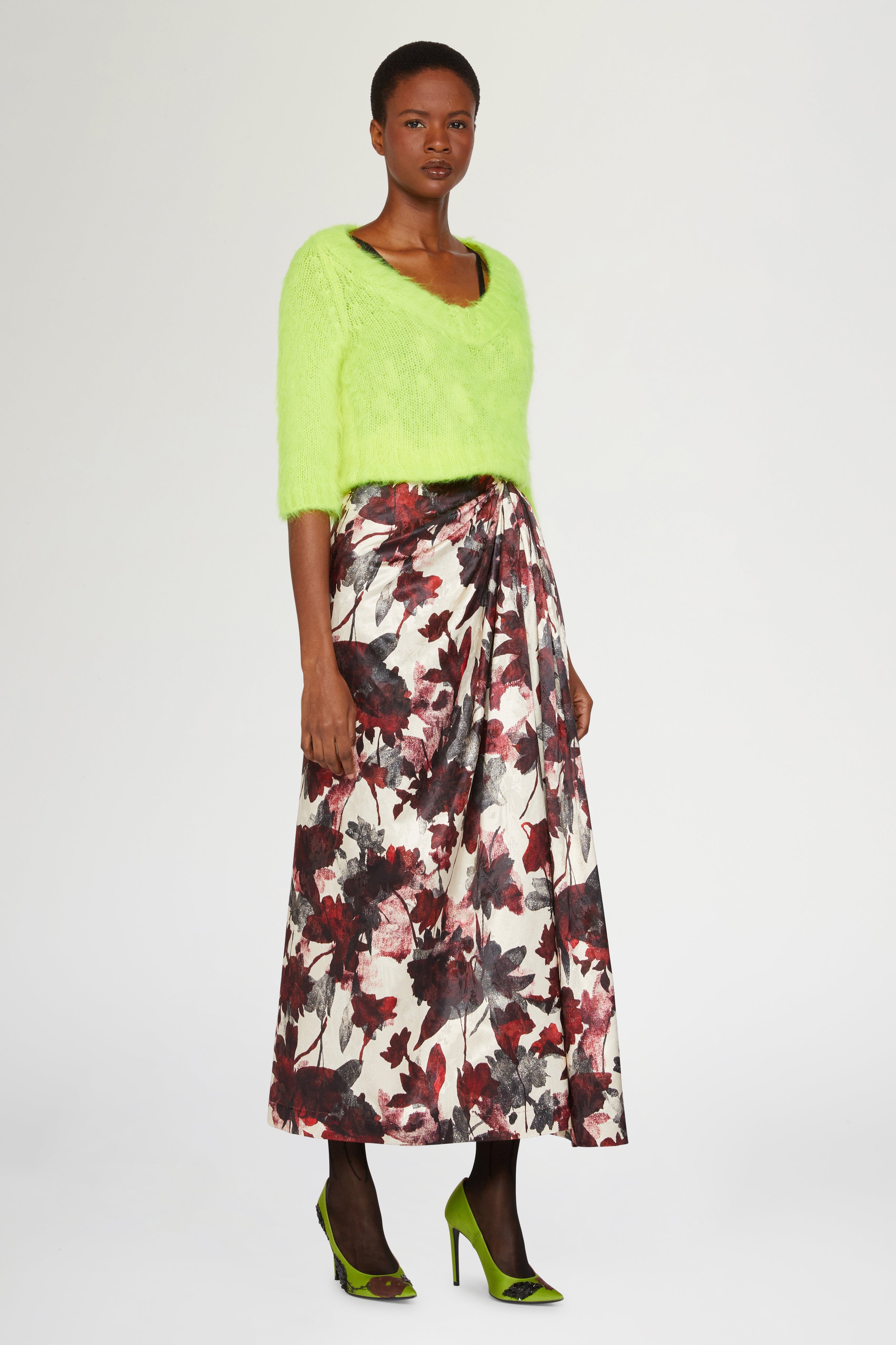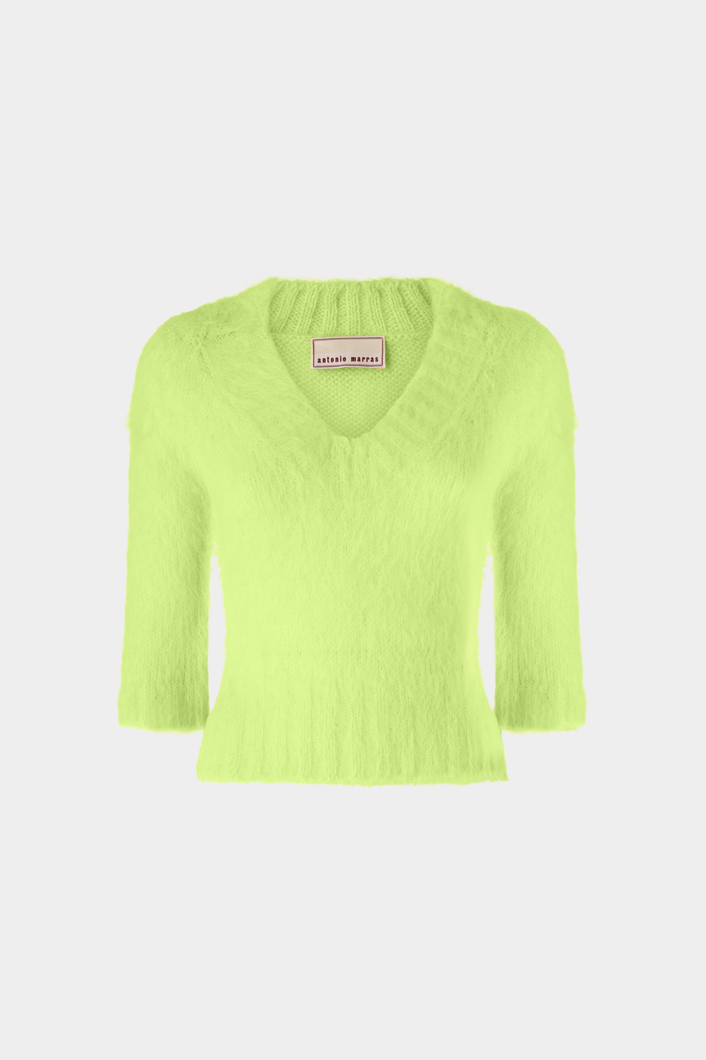 • Soft V-neck sweater in neon yellow mohair blend, featuring a fluffy texture and ribbed details. Designed with elbow-length sleeves and a slightly fitted waist for a feminine silhouette.
