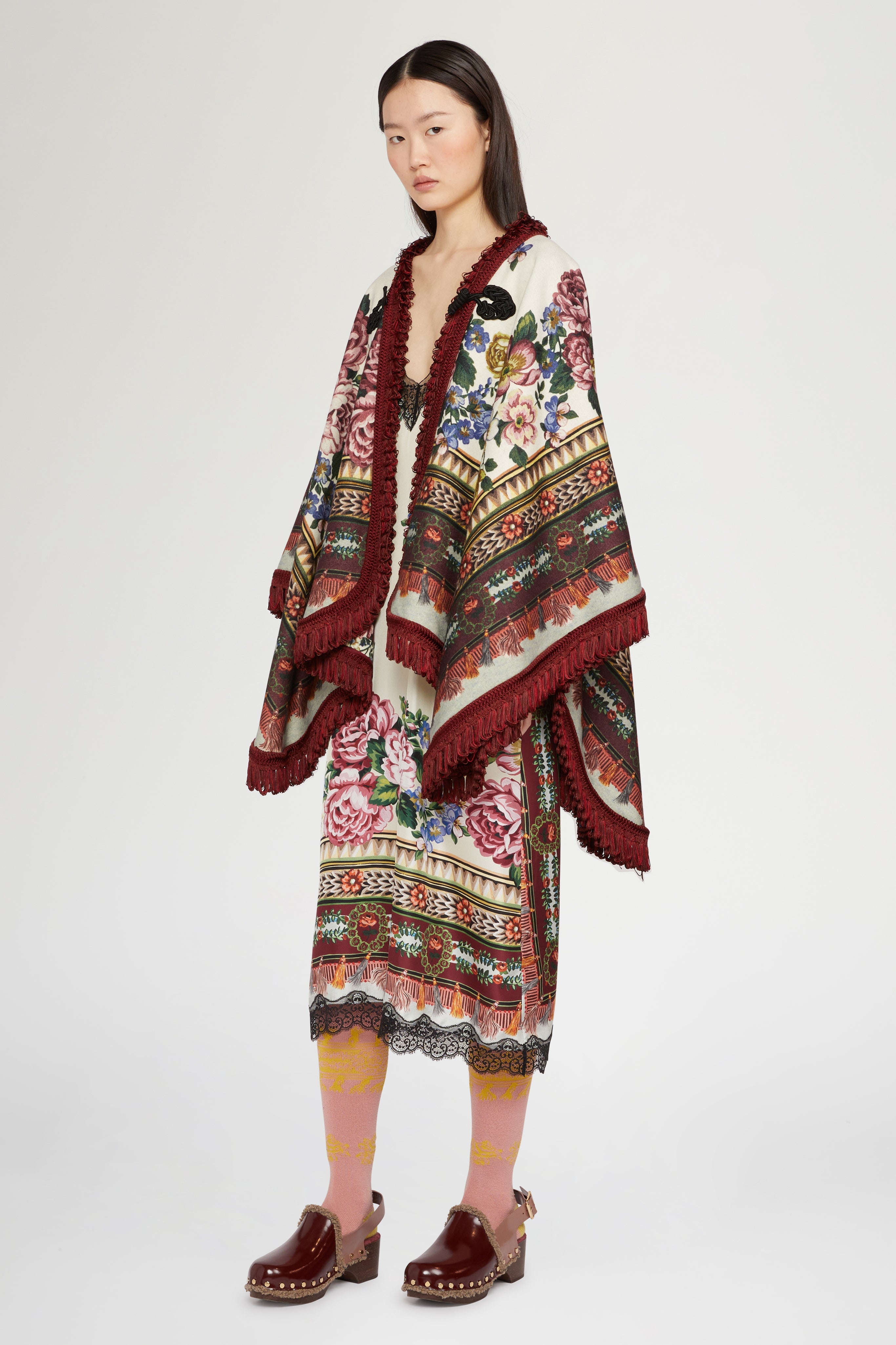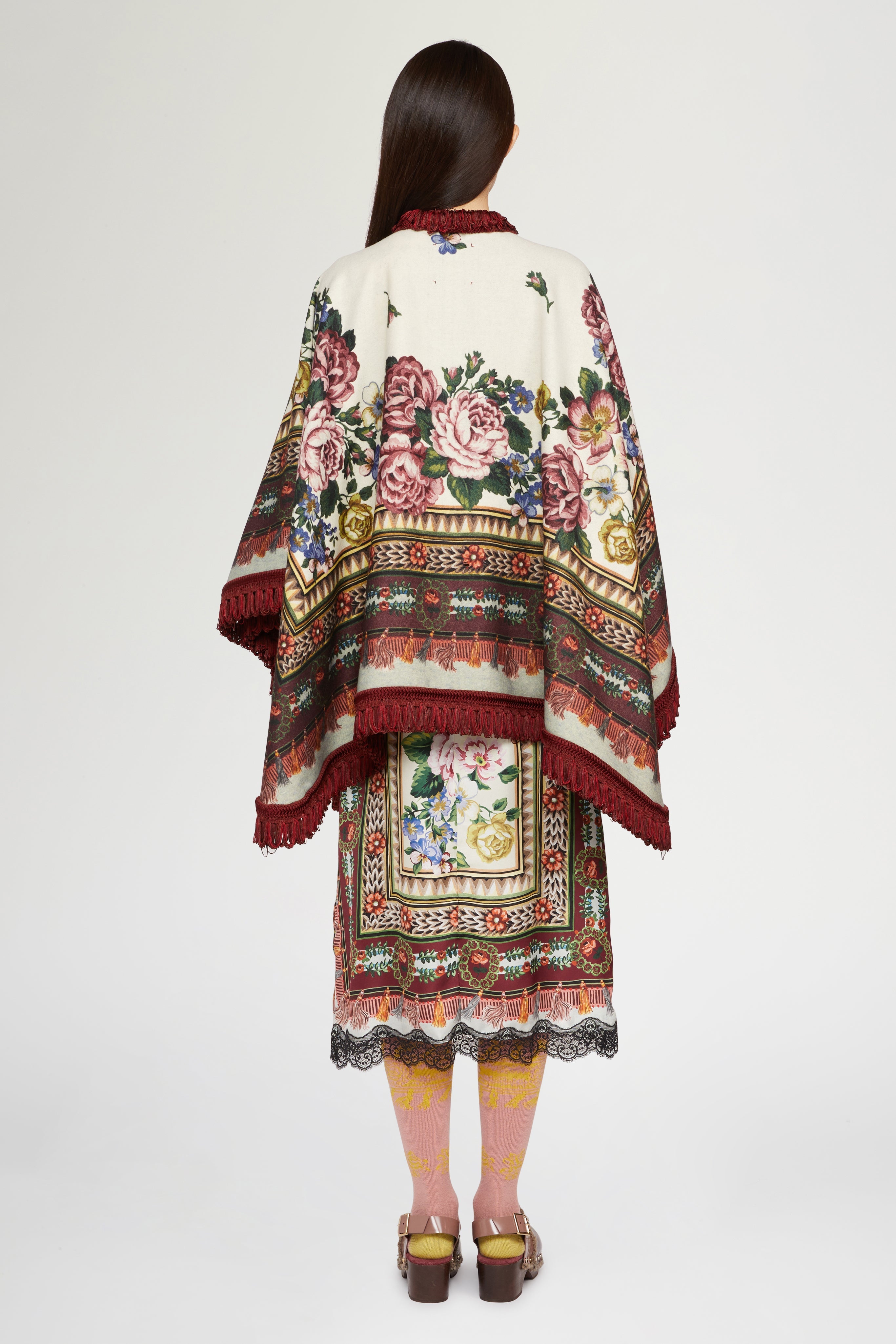 • Wool-blend cape with a rich floral and folkloric jacquard pattern, finished with deep red fringe trim. A statement piece that blends artisanal charm and dramatic elegance.