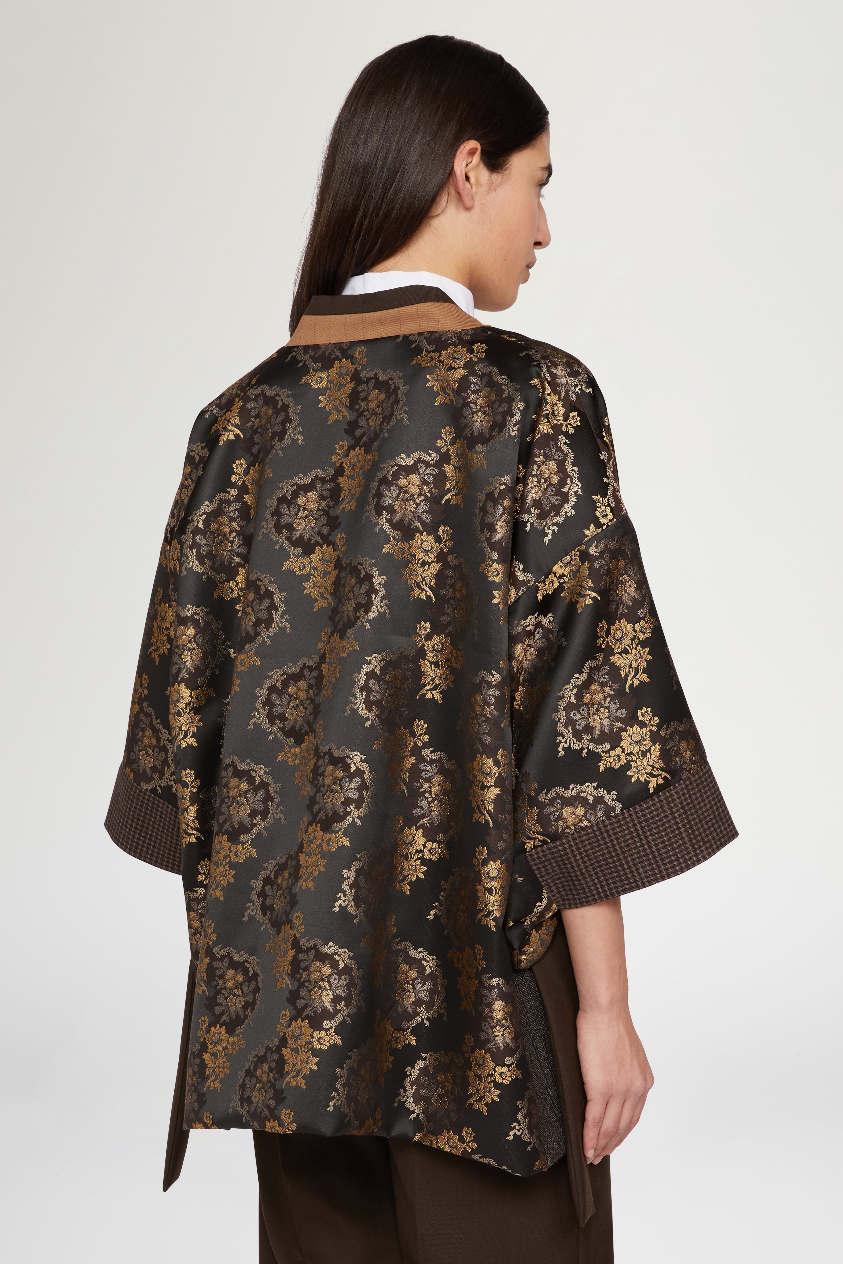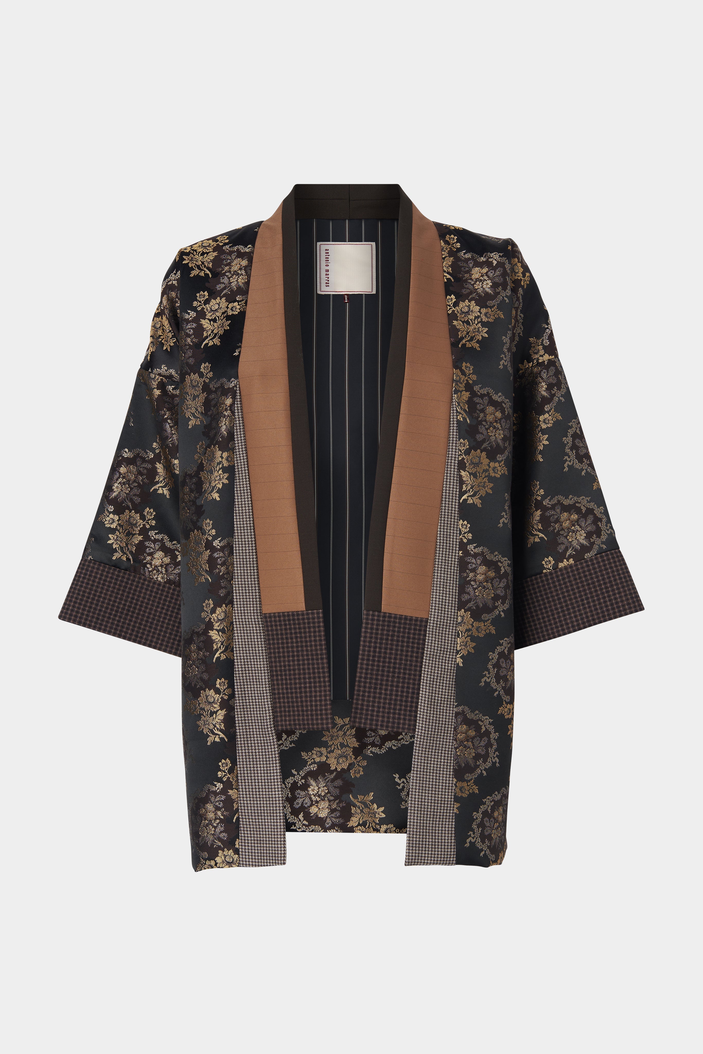 • This jacquard women's kimono blends floral motifs with refined patchwork details. Wide sleeves and a relaxed fit enhance its elegant appeal.