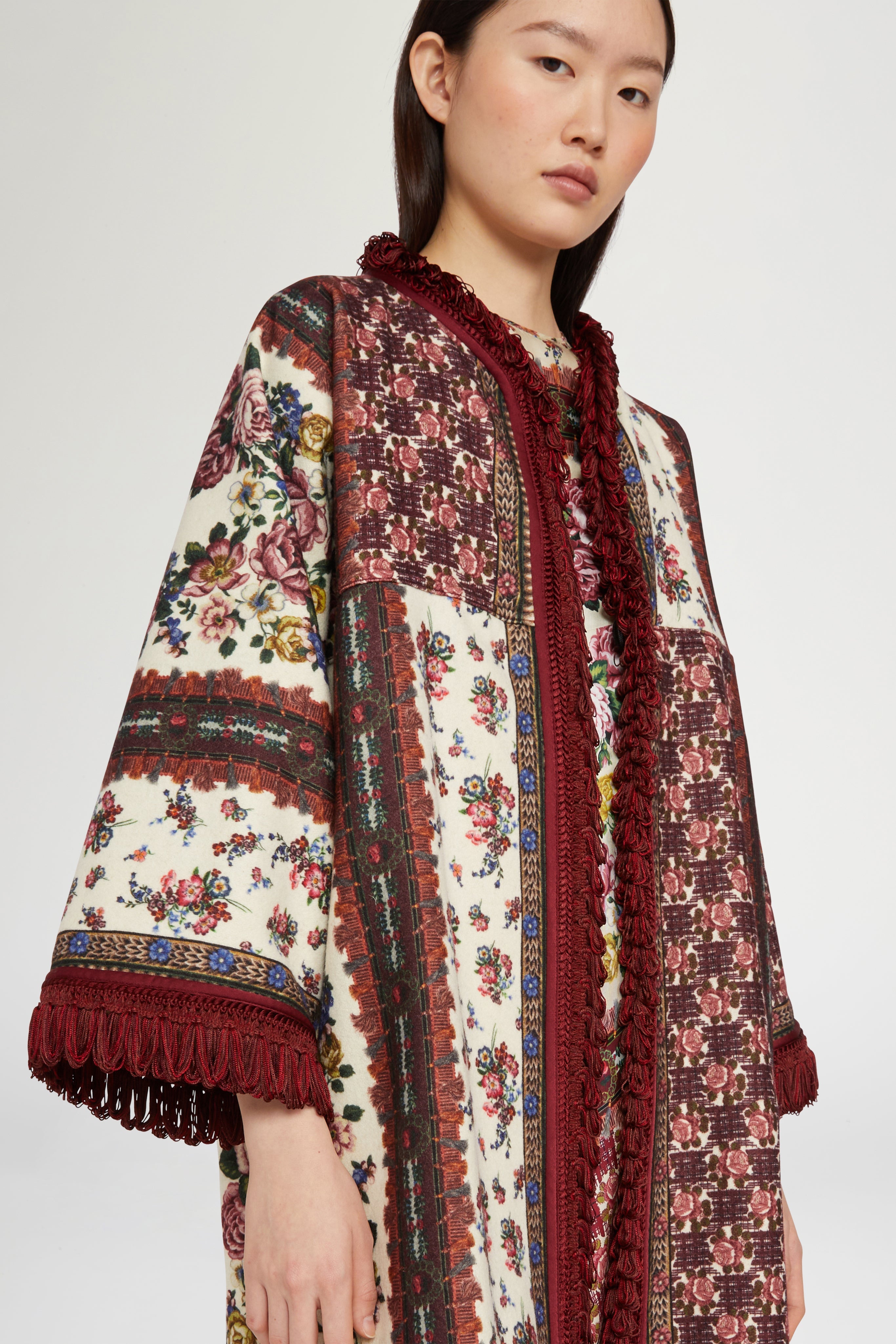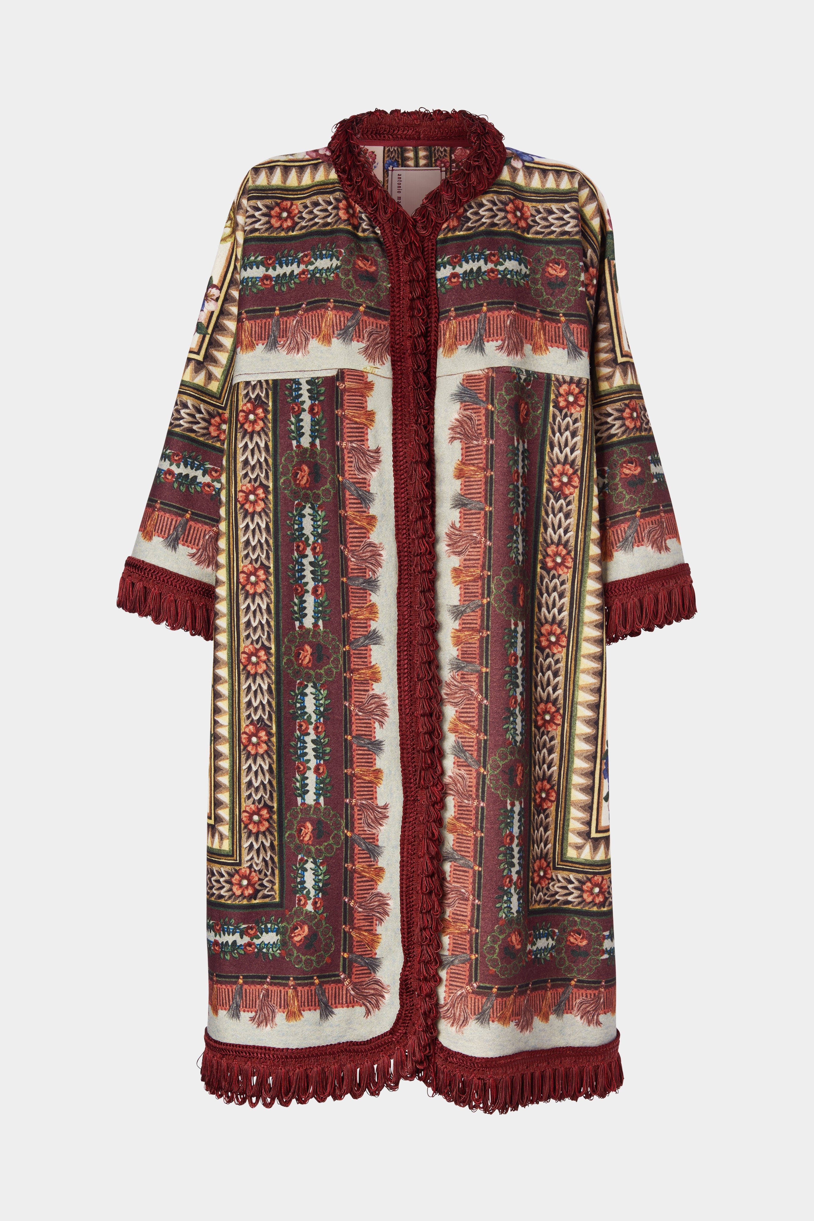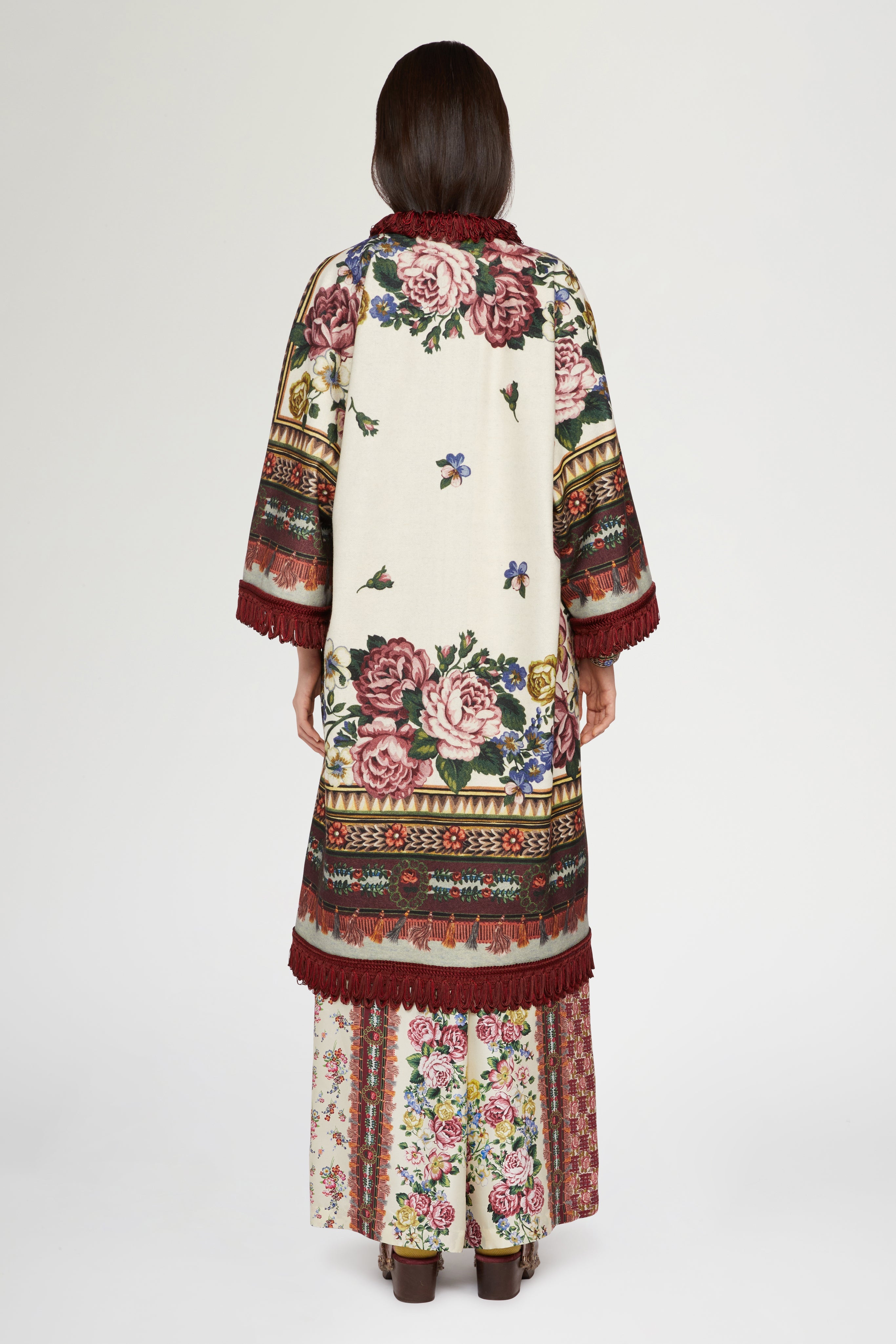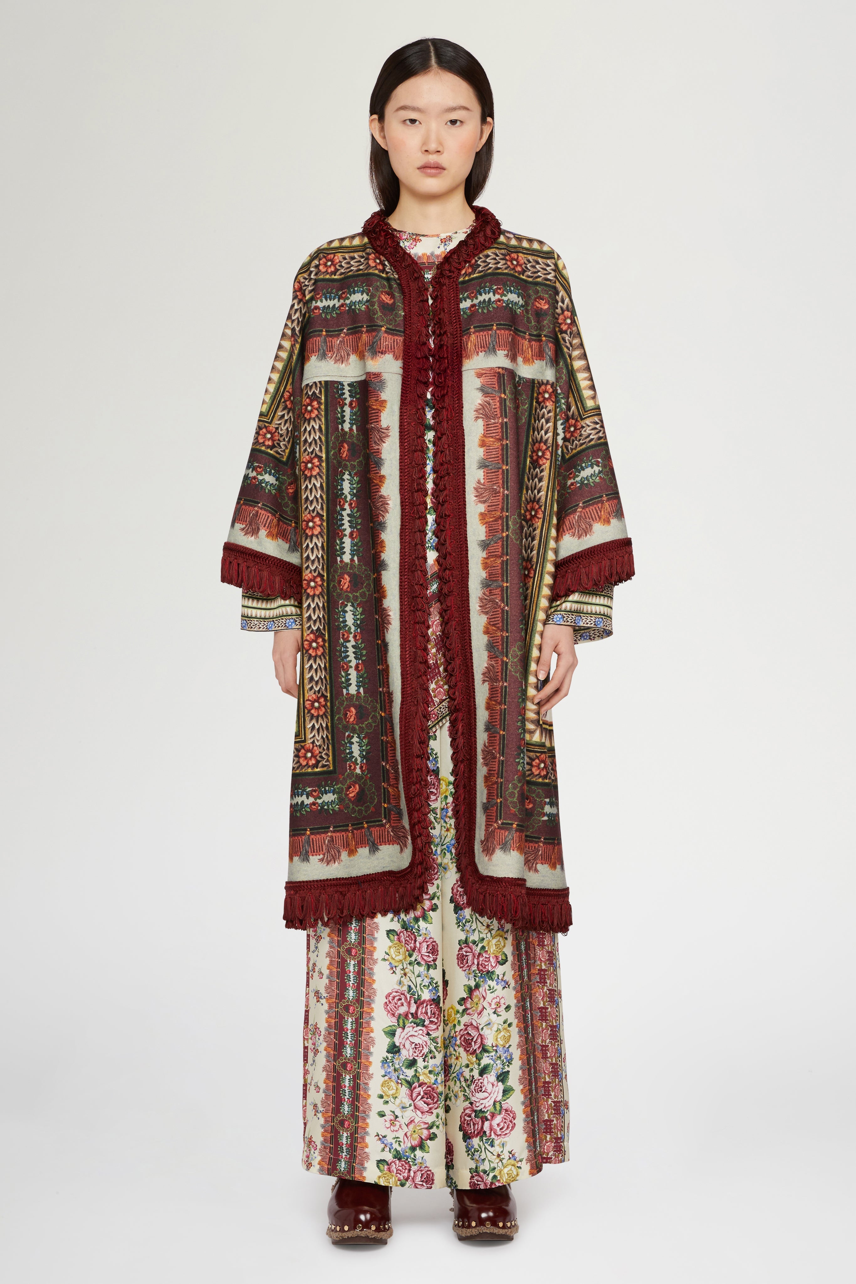 • This long wool coat features a rich floral and geometric patchwork print with decorative fringe trims. Crafted from an 80% wool blend, it offers warmth and visual texture. A statement outerwear piece with folkloric inspiration and artisanal flair.
