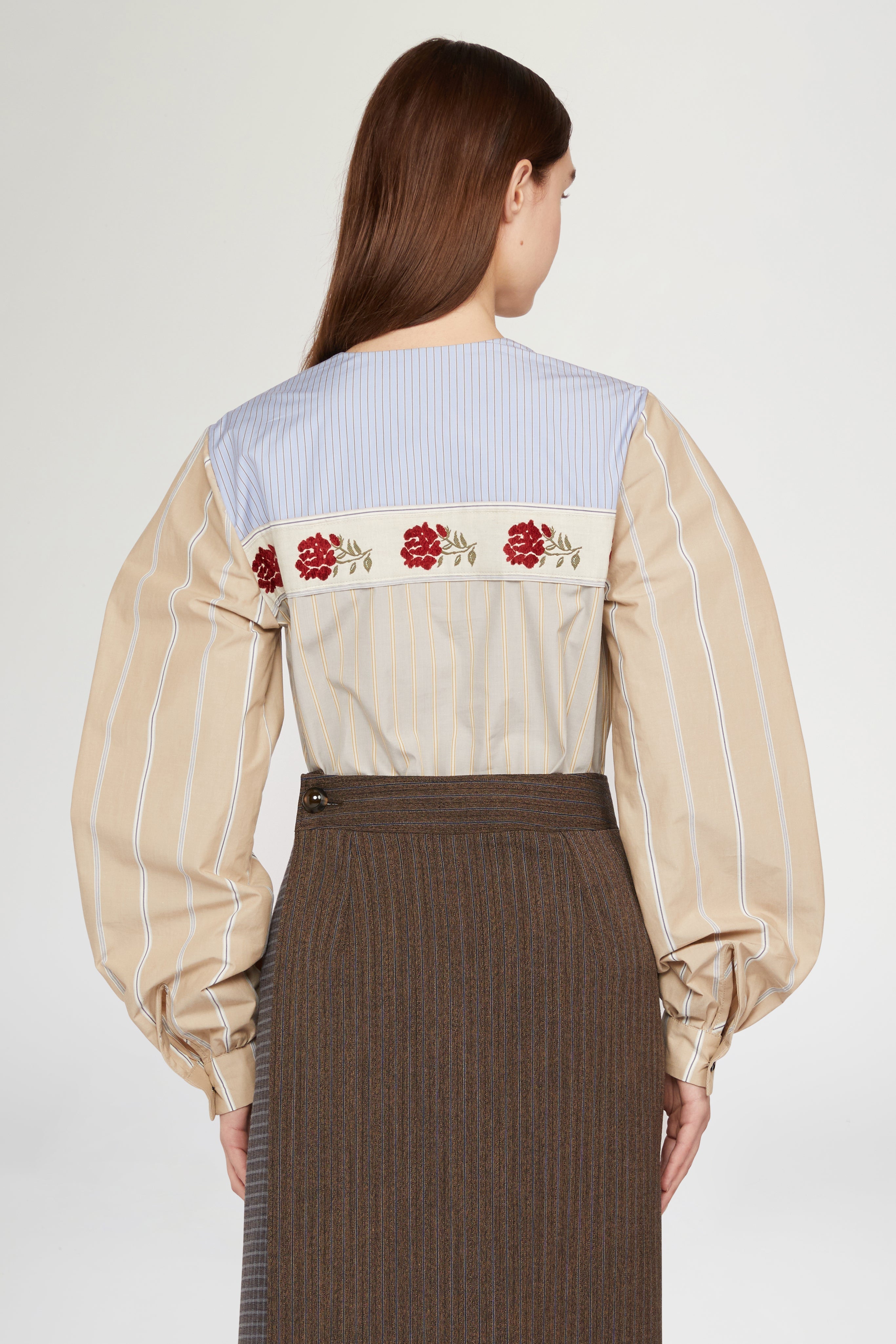 100% cotton blouse with mixed striped panels and a floral jacquard insert across the chest. Features a round neckline with tie detail and voluminous bishop sleeves for a romantic, vintage-inspired touch.