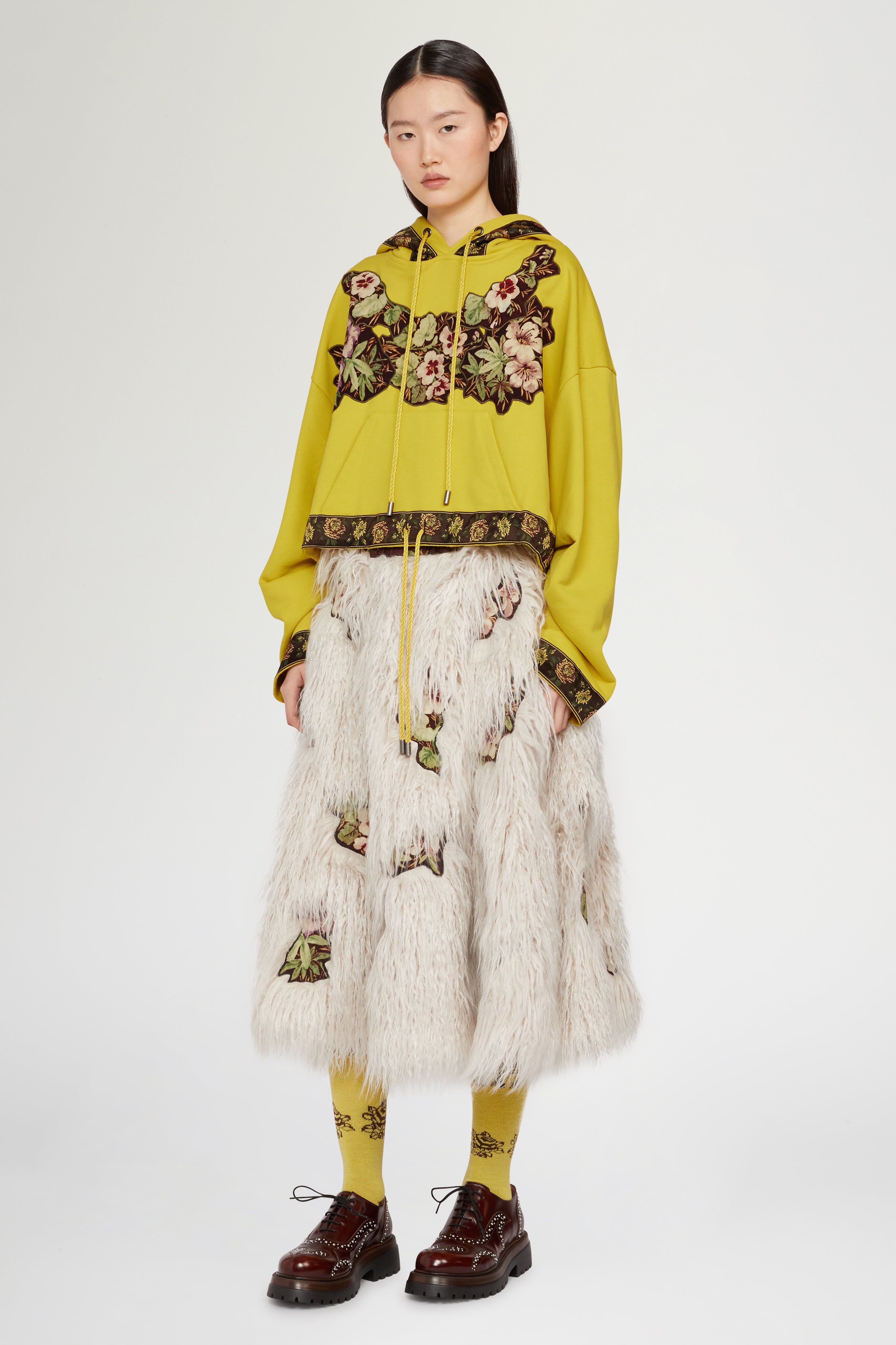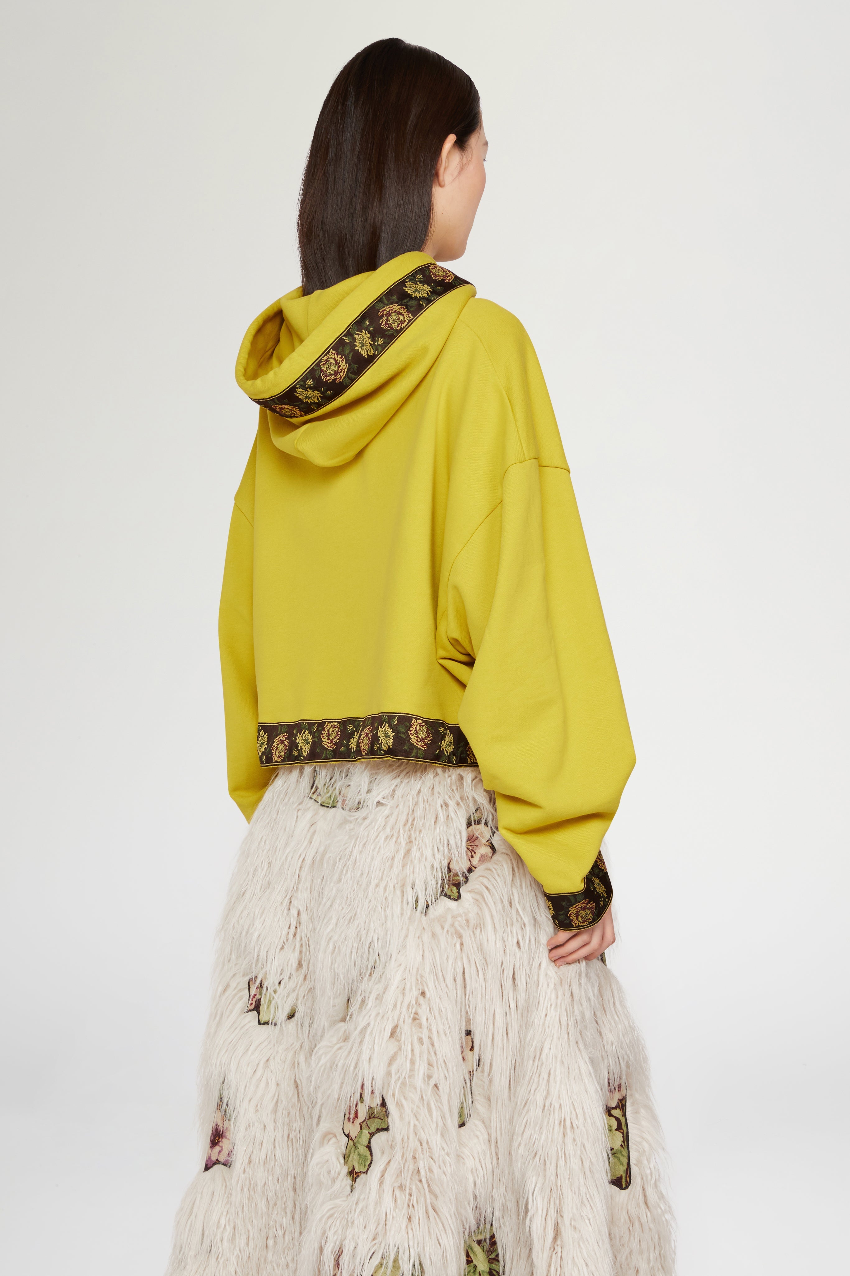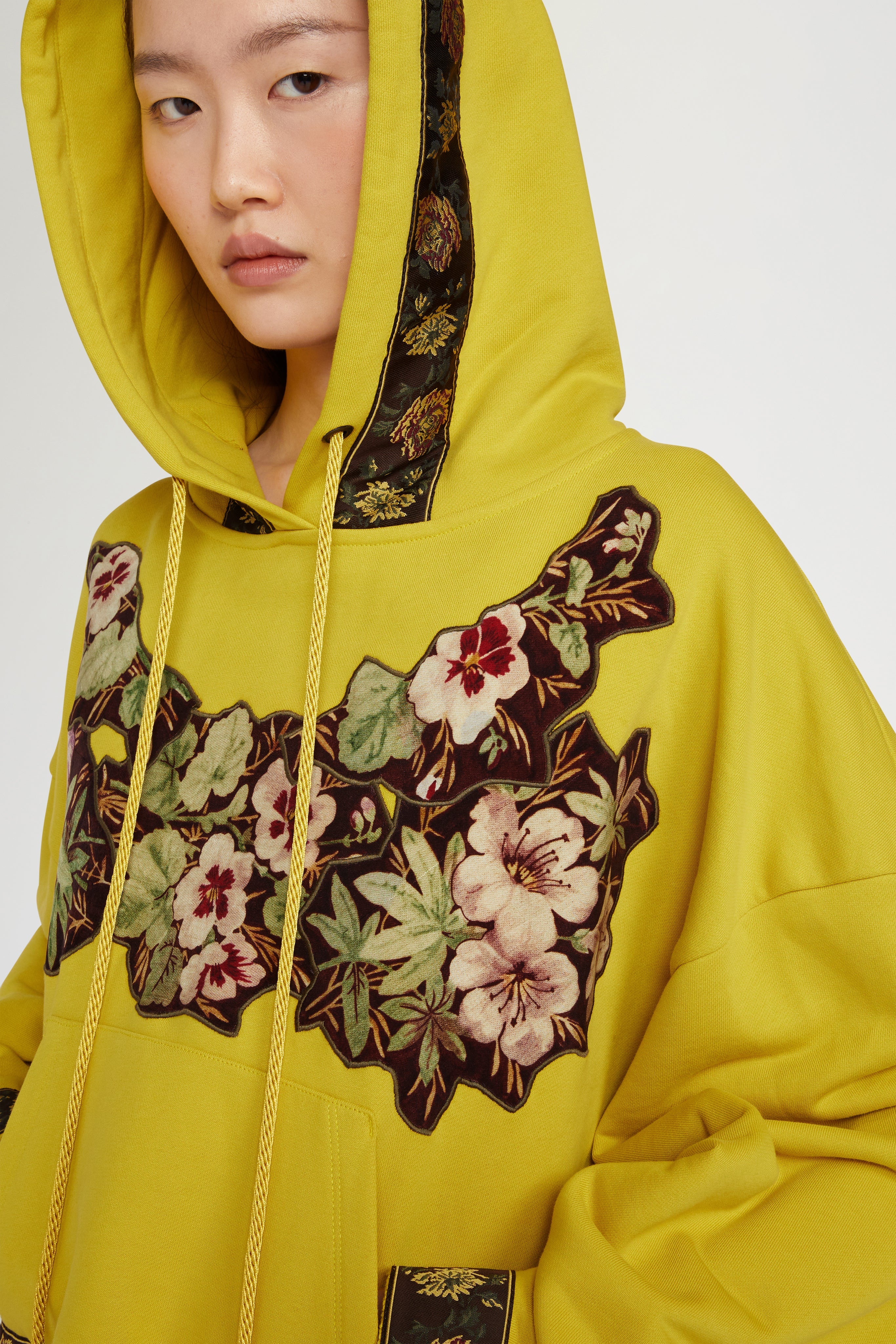 Oversize hoodie in vibrant yellow cotton, featuring floral jacquard appliqués and printed trims on the hood, hem, and cuffs. A bold reinterpretation of the classic hooded sweatshirt with signature Marras detailing.