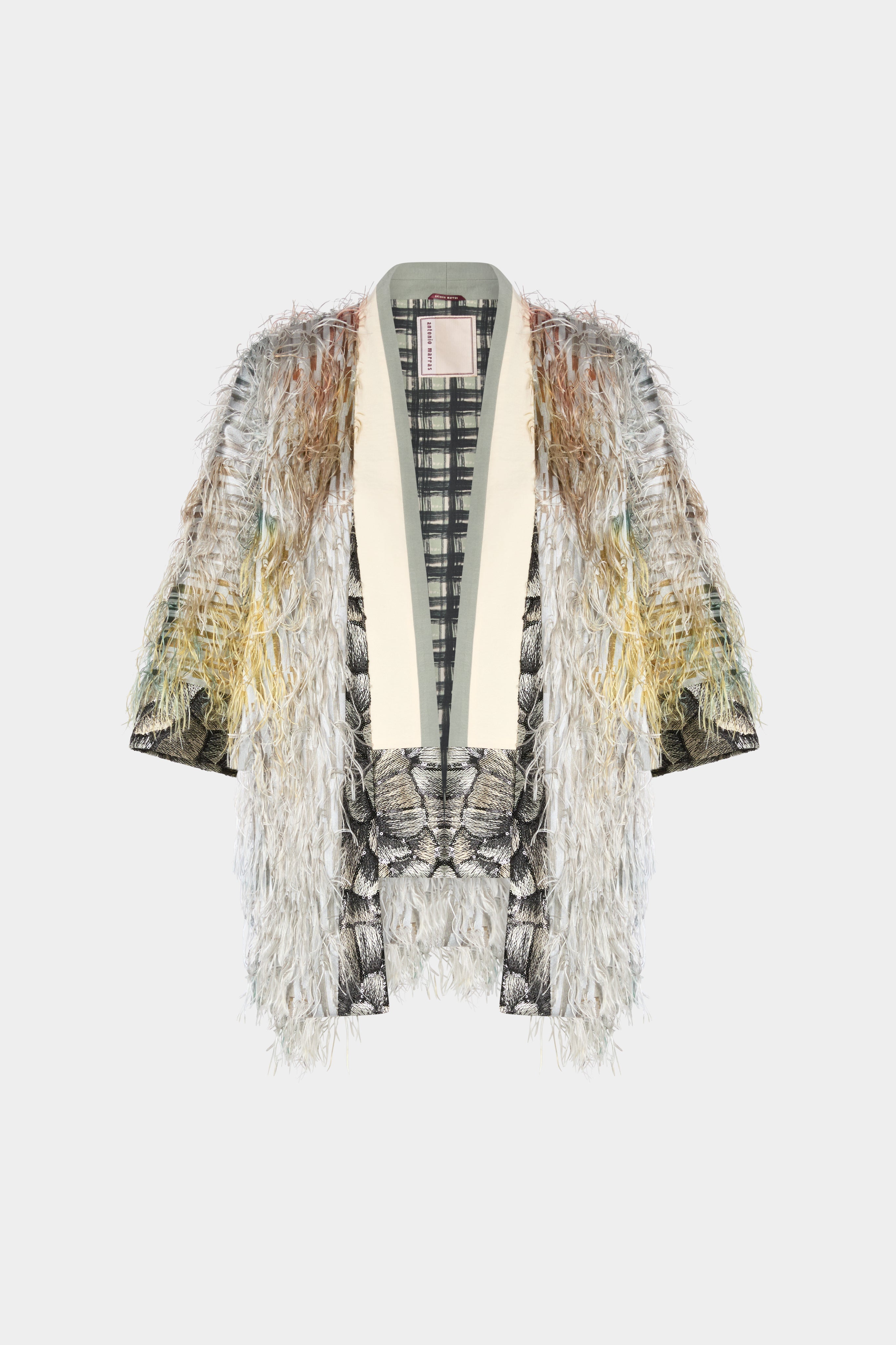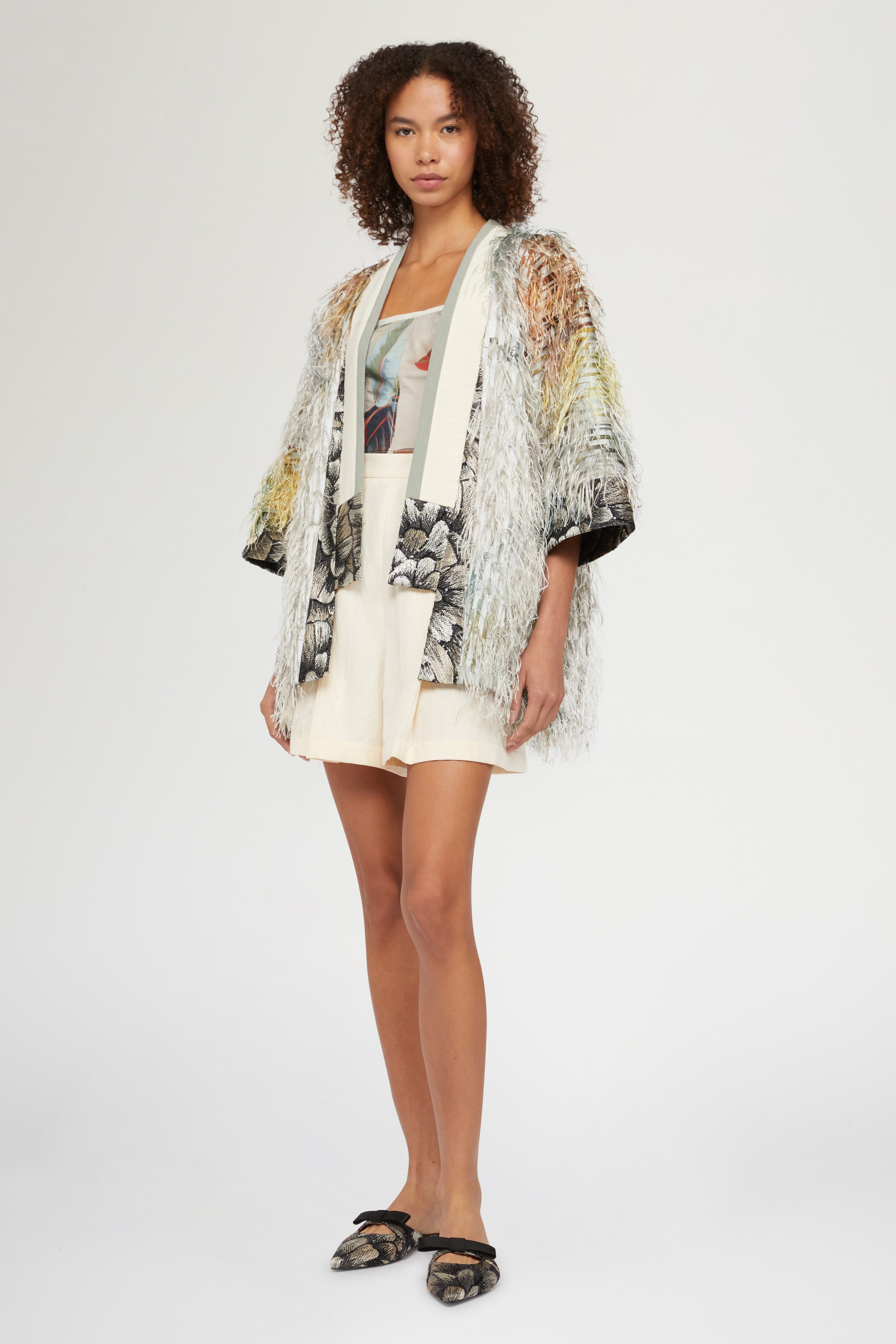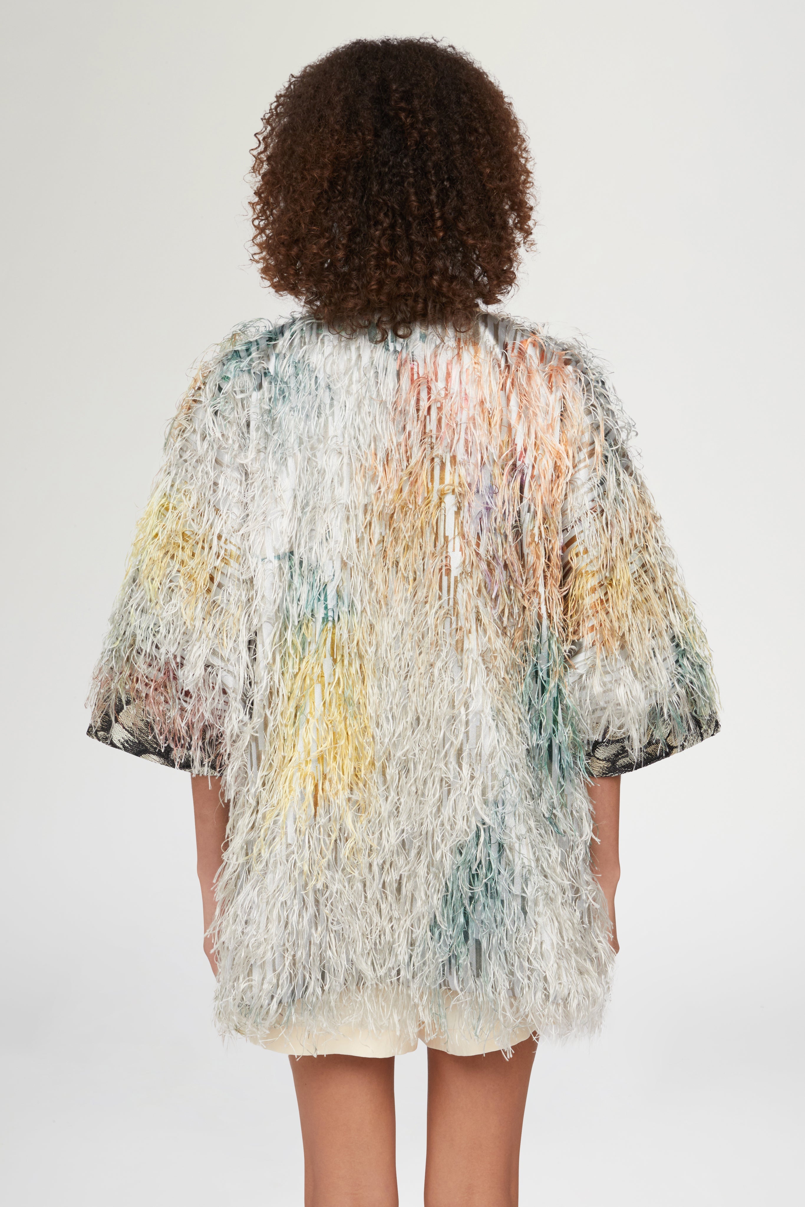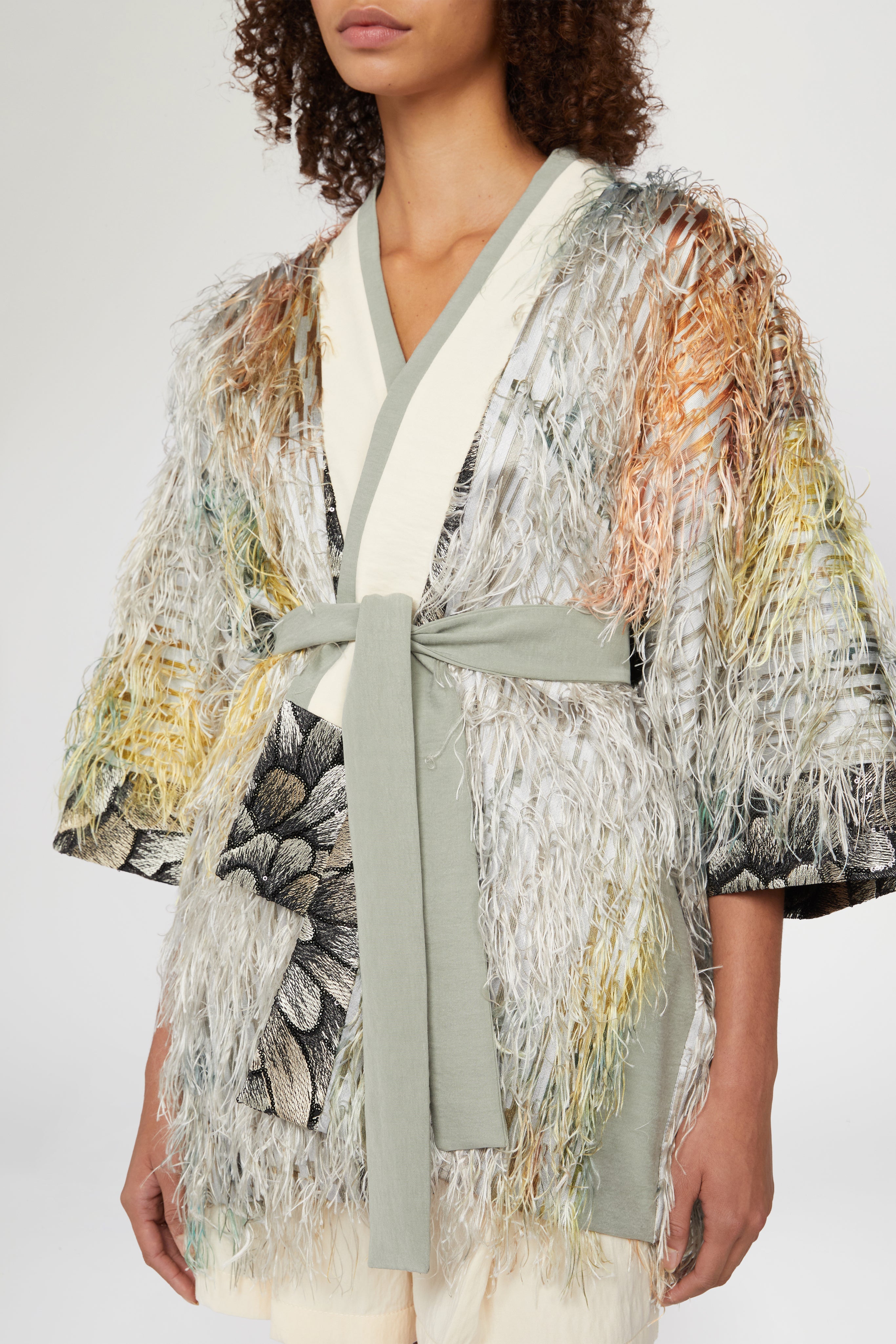 • Kimono with a textured feather-like fringe, abstract print panels, and a matching belt for cinched silhouette.