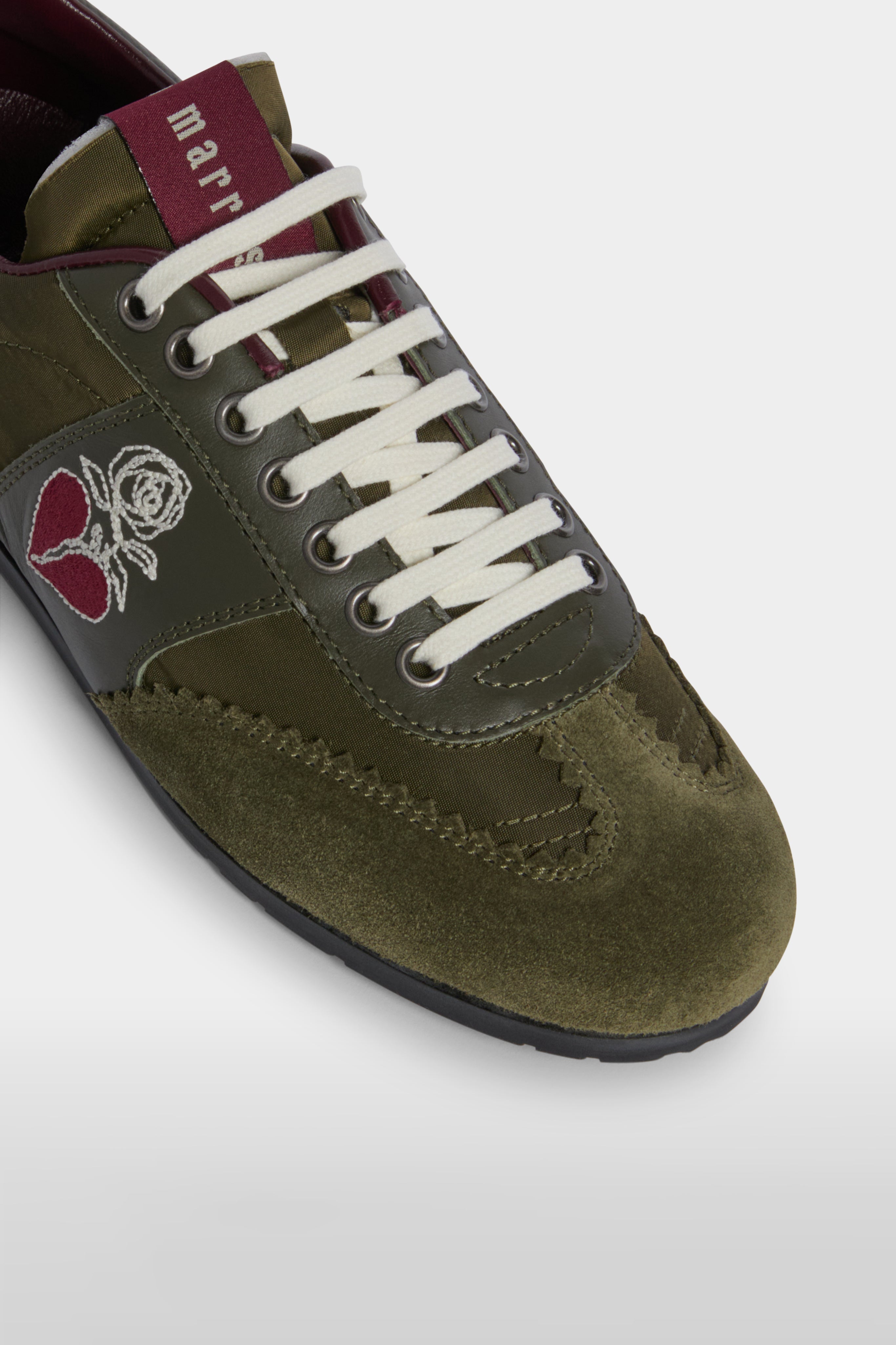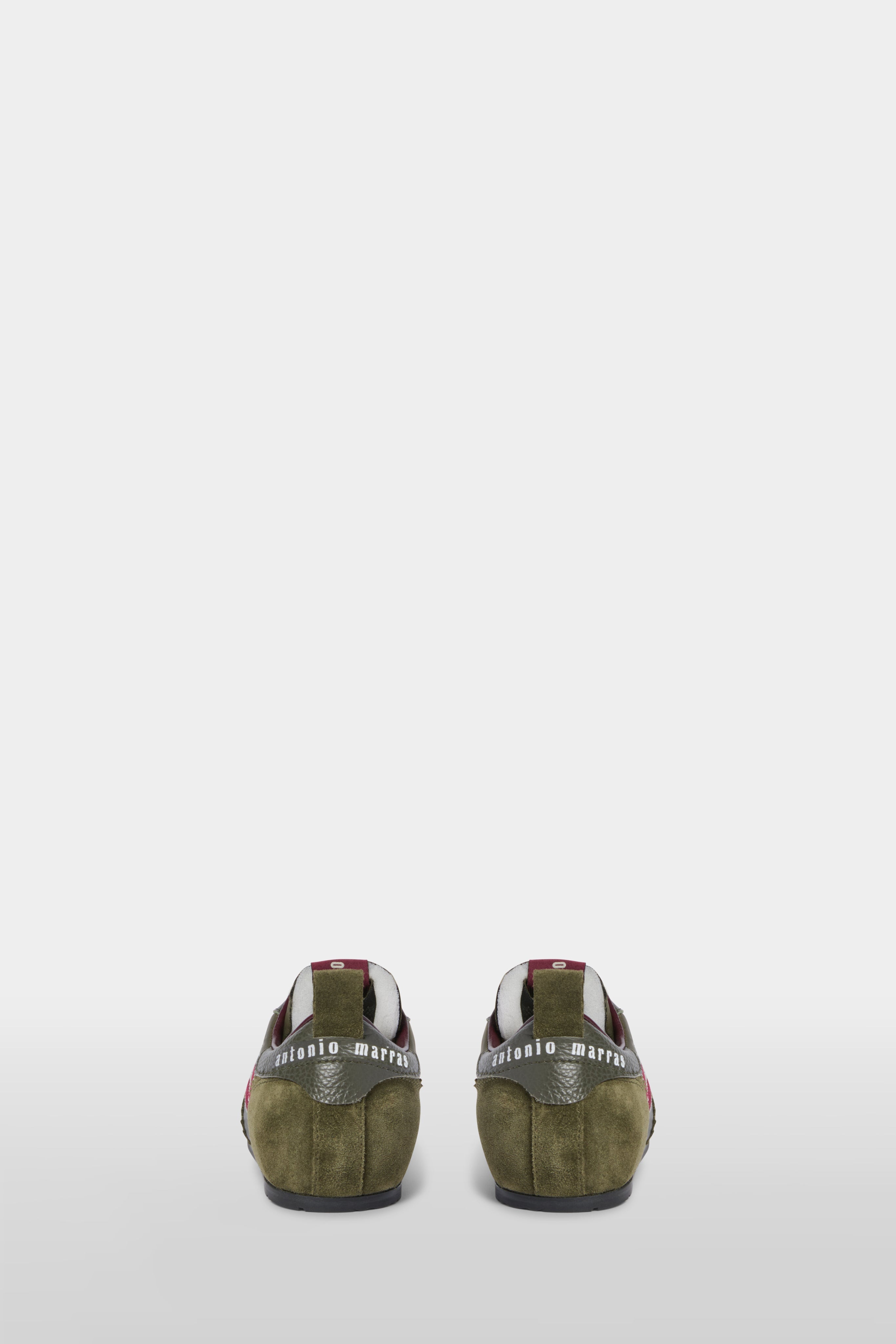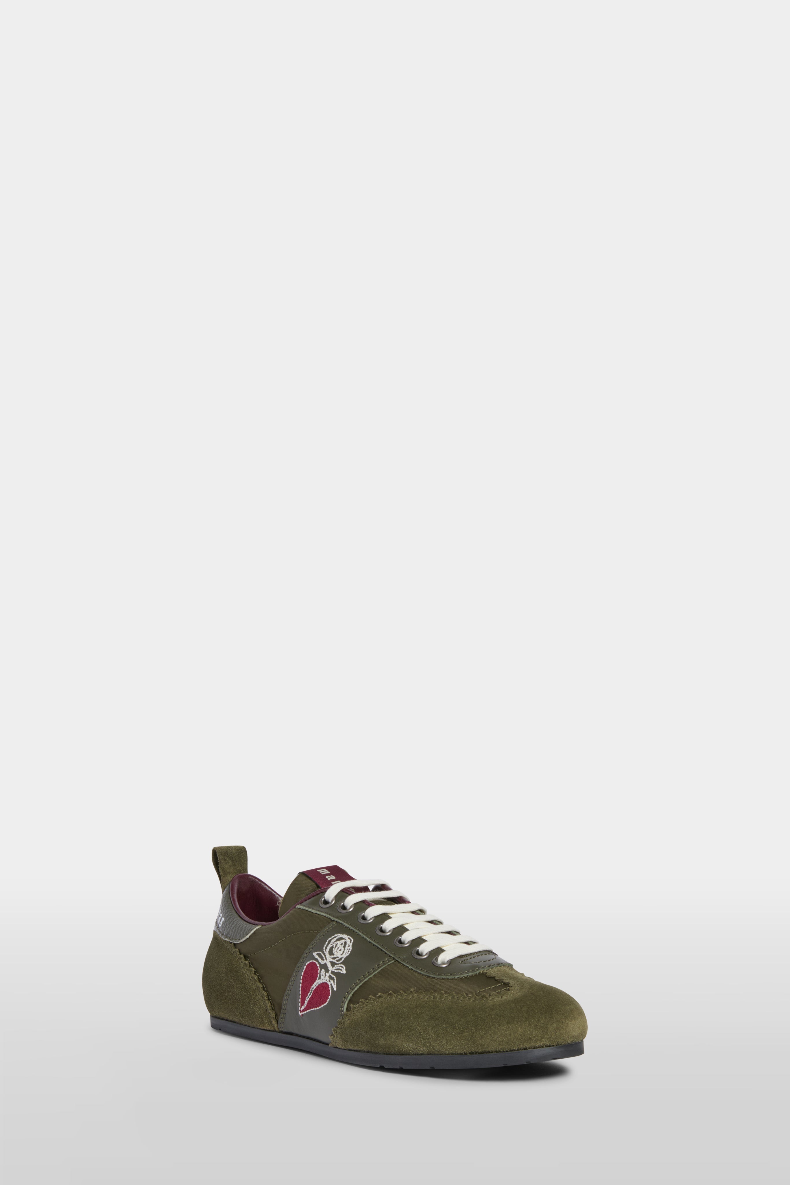 • Unisex sneakers in olive green leather inspired by ’70s running shoes, reinterpreted with urban energy and a pop spirit. Lightweight and authentic, designed for moving with freedom and character. The embroidered heart from which a rose blooms tells a story of rebirth and passion, the signature symbol and soul of Antonio Marras.