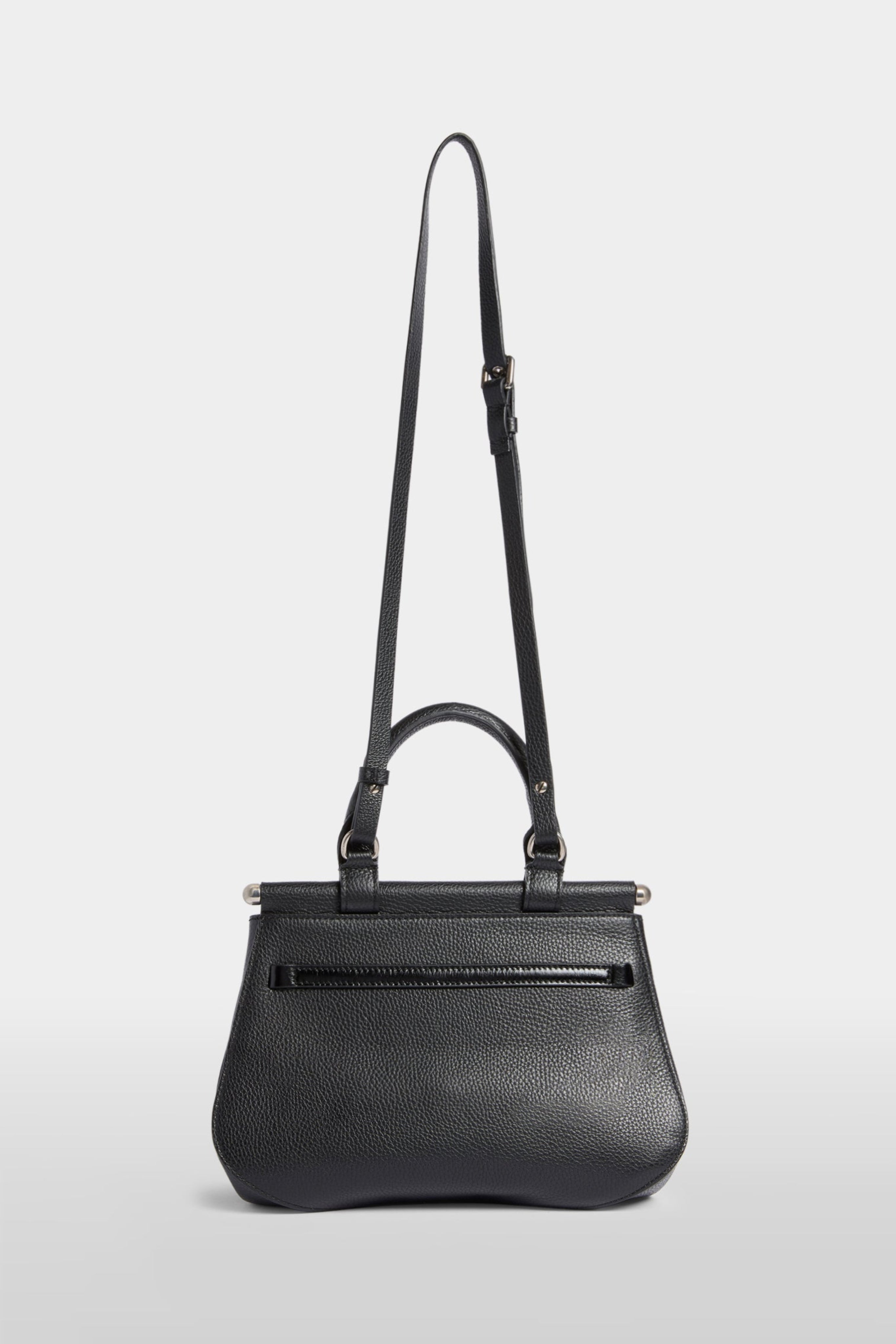 The Small Tanit bag in black calfskin features a trapeze silhouette with a sleek belt detail on the front, a single top handle, an adjustable shoulder strap, and a striking bordeaux interior lining. A structured yet edgy design.
