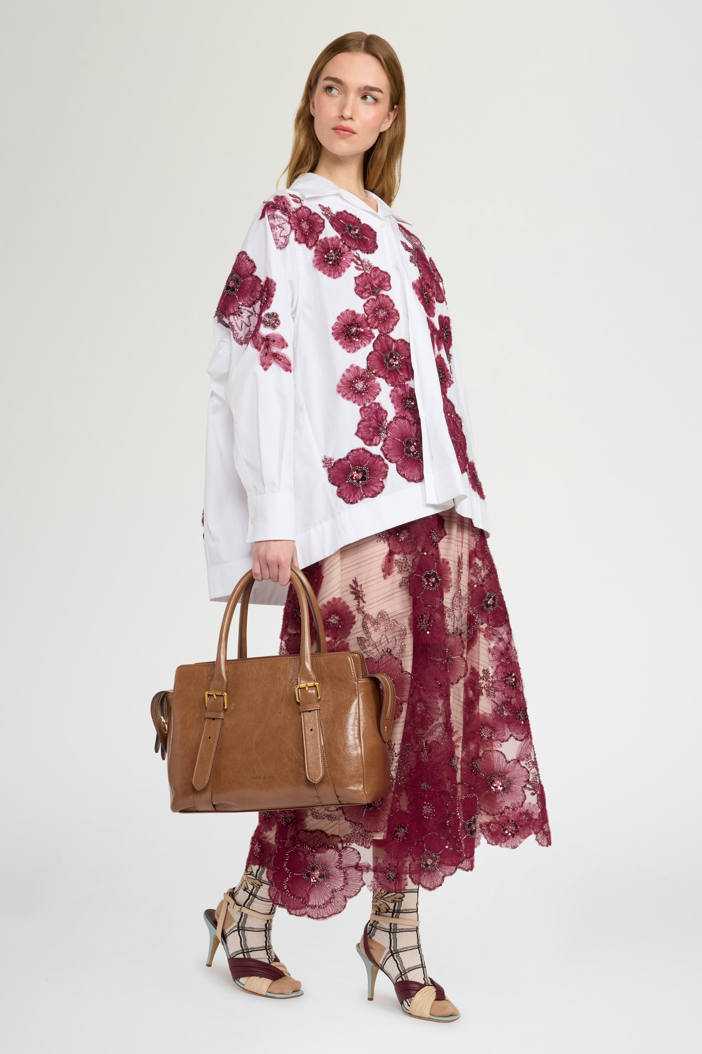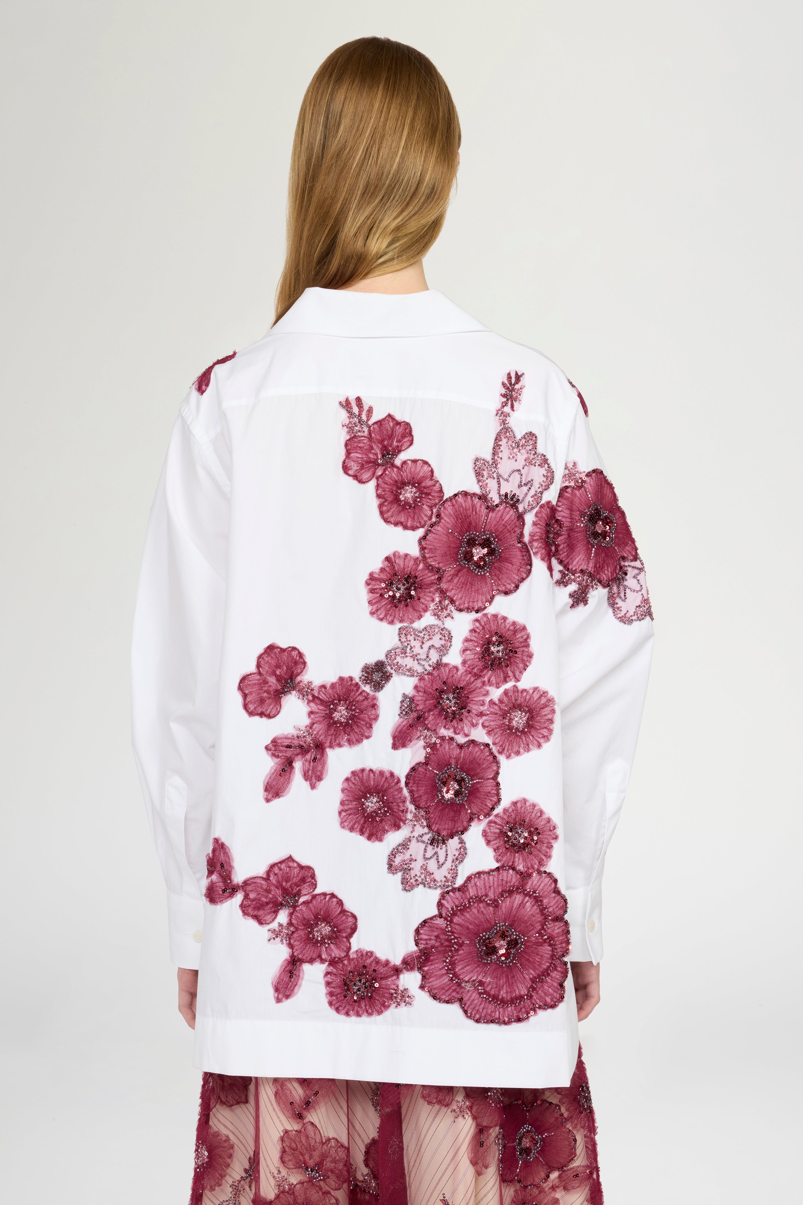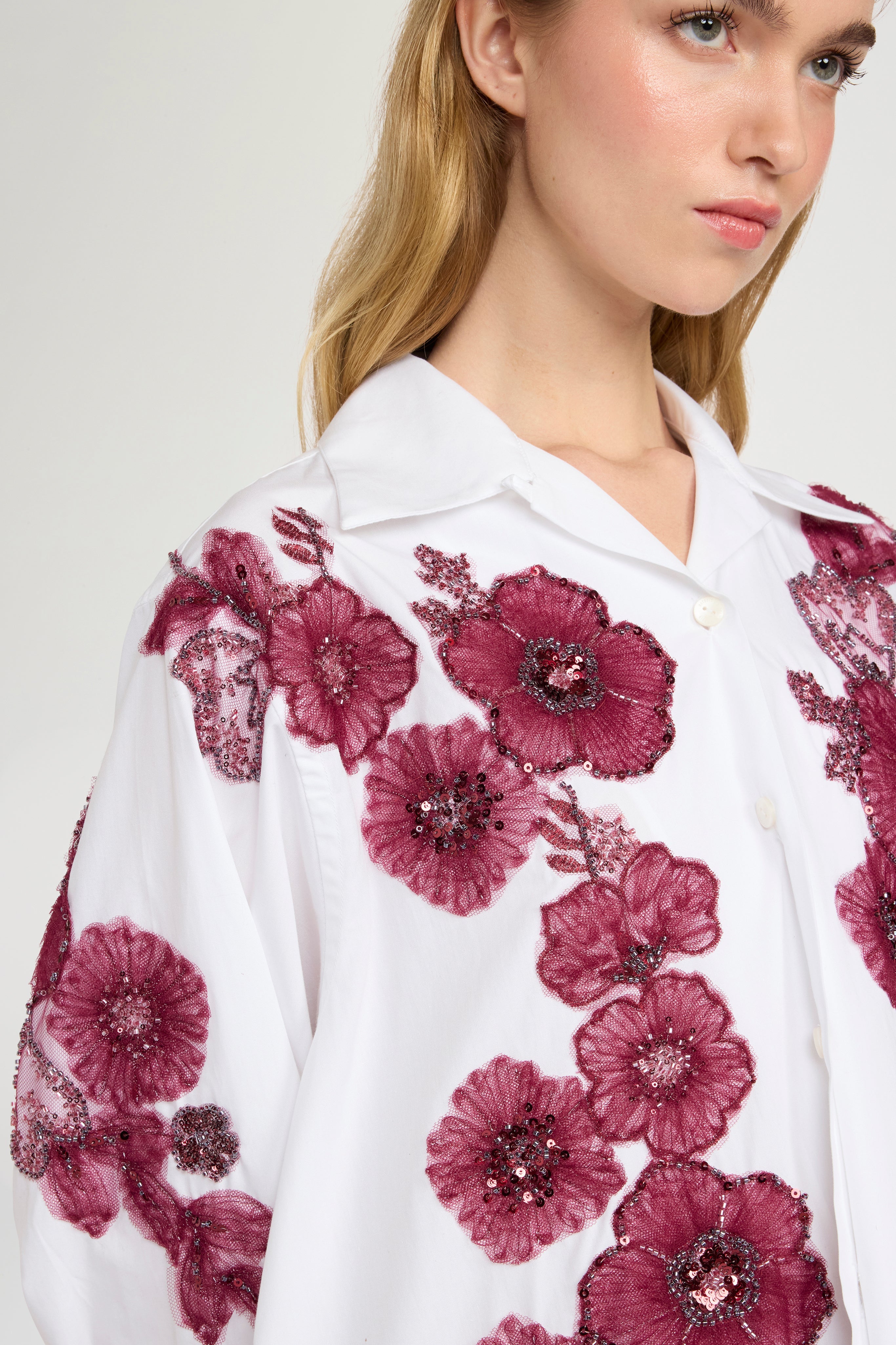• Robespierre shirt in 100% white cotton poplin, featuring floral appliqués embroidered in tulle, beads, and burgundy sequins.